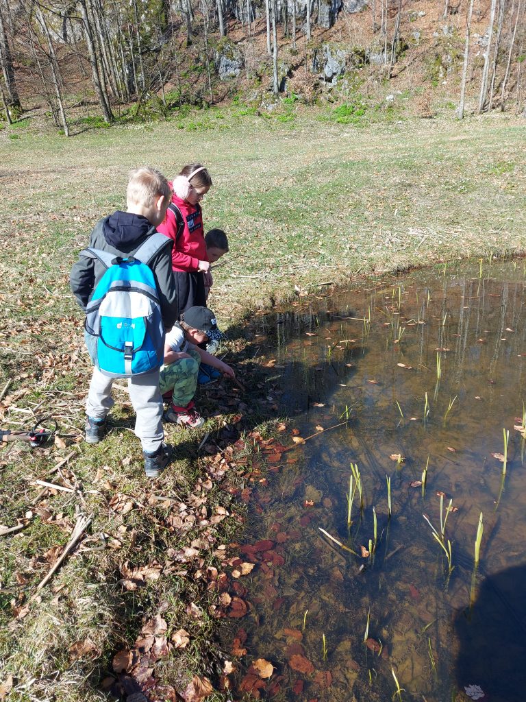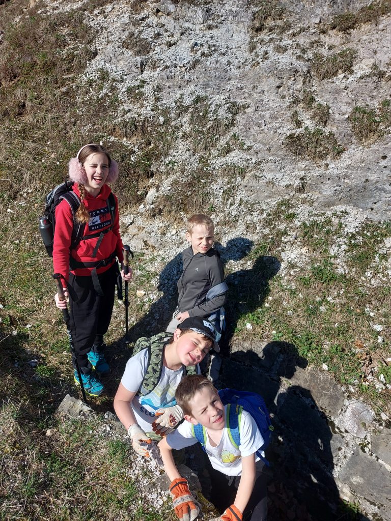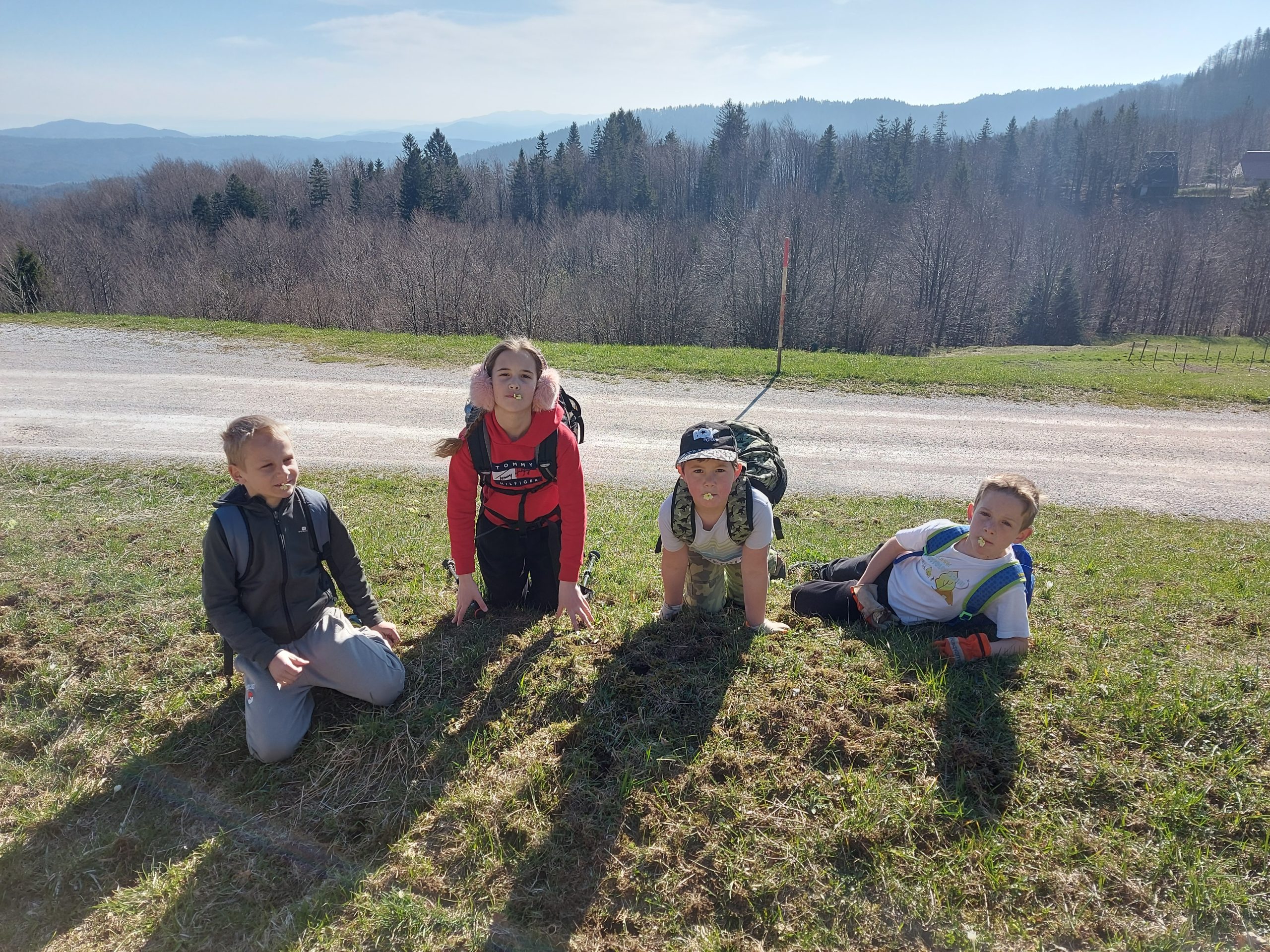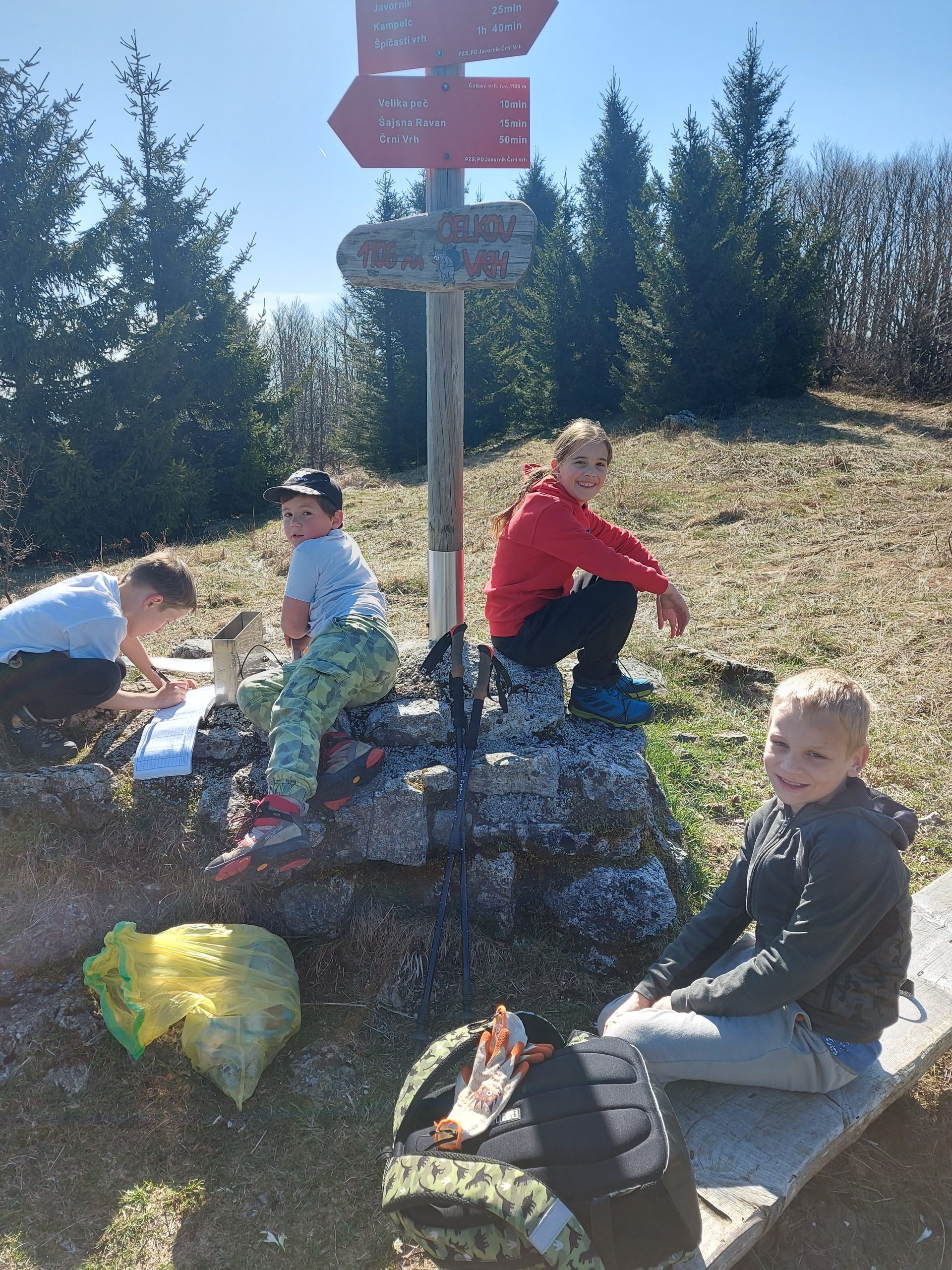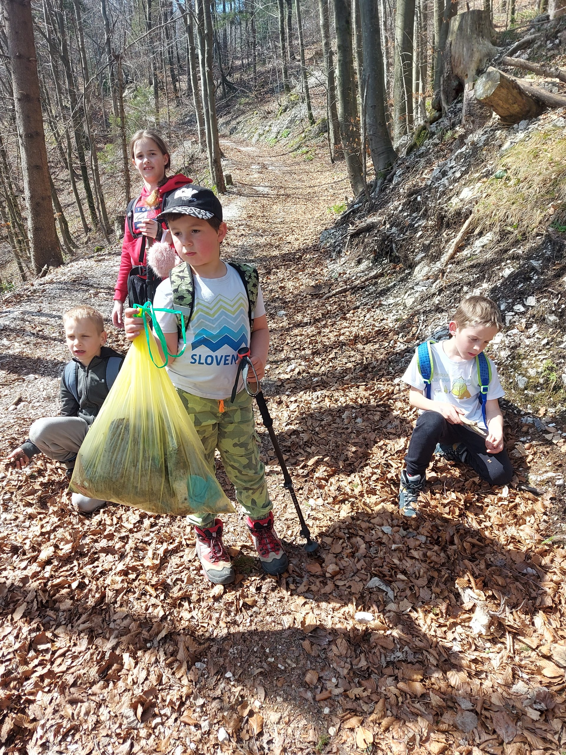 Planinci smo se v soboto, 5. 4., pridružili čistilni akciji KS Črni Vrh in počistili planinsko pot na Čelkov vrh. Na poti na vrh nismo našli veliko smeti, še največ ob glavni cesti. To pomeni, da pohodniki spoštujemo naravo in smeti sproti odnašamo v dolino. Ob hoji na vrh smo uživali v naravi in za igro izkoristili vse kar nam narava ponuja: gazili in skakali smo po kupih listja, se sladkali s trobenticami, se skrivali, pisali z ogljem, ki smo ga našli v zogleneli smreki in občudovali kamnine. Ob mlaki smo preučevali mrest, paglavce, žabe in druge žuželke ter dvoživke. Na vrhu smo se odpočili, uživali v čudovitih razgledih ter si razdelili dobrote iz nahrbtnikov. Nato smo se odpravili proti Mali peči, pod katero smo šli v italijanski bunker in si ga ogledali. Za nami je še en čudovit dan, preživet v naravi, v dobri družbi.