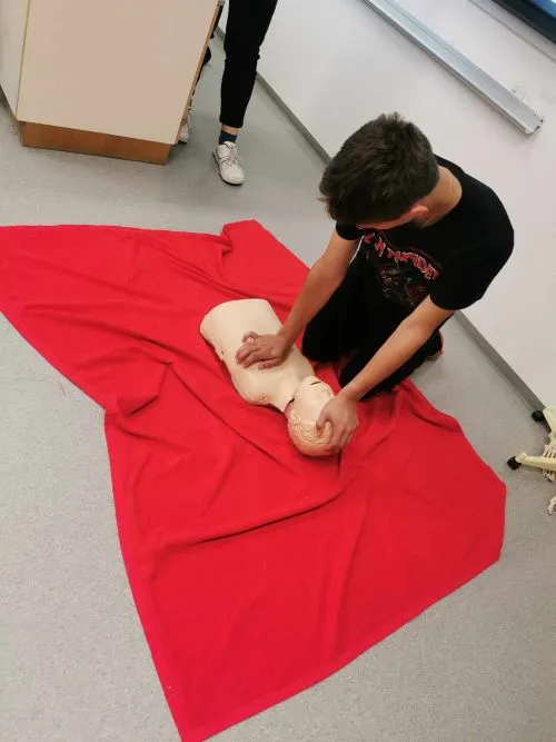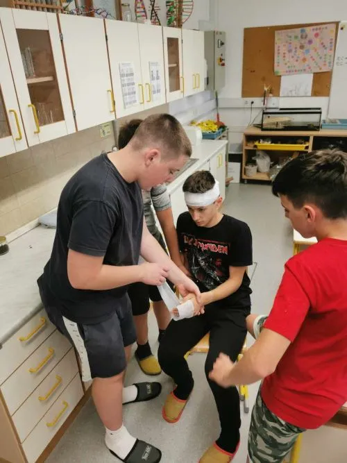 Pri pouku biologije v 8. razredu smo se v torek, 11.8.2024, povezali z našo učiteljico 1. razreda, gospo Tino Bajc Hlad, ki nam je pripravila poučno delavnico prve pomoči.
