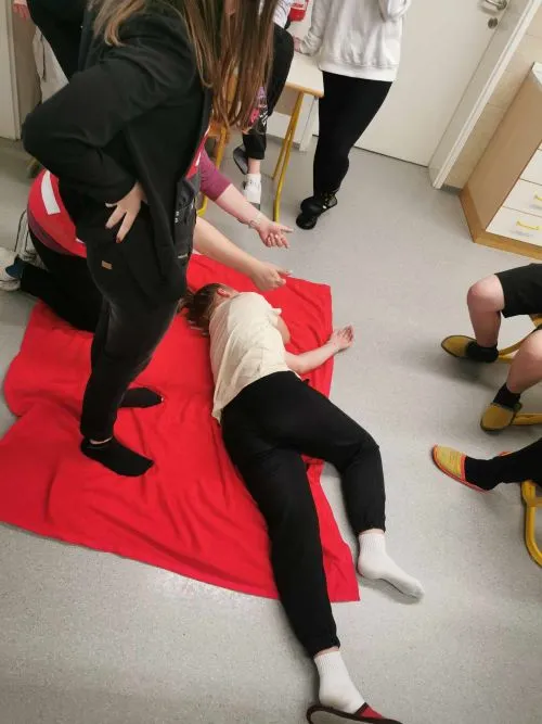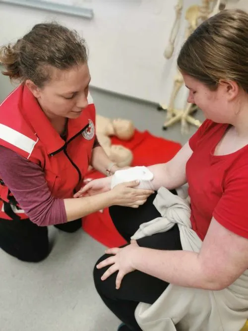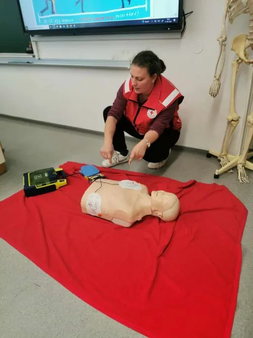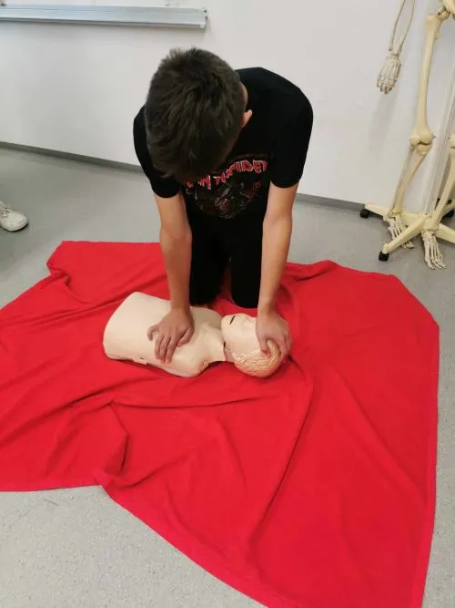 Učiteljica Bajc Hlad, sicer članica ekipe prve pomoči Rdečega križa, je začela s kratkim uvodnim predavanjem, sledil pa je praktični del z različnimi simulacijami nujnih situacij. Učenci so se izkusili v osnovnih postopkih oživljanja – tehnike pritiska na prsni koš in umetnega dihanja, spoznali so uporabo avtomatskega zunanjega defibrilatorja (AED) ter preverili znanje uporabe kompresijskih povojev ob krvavitvah.