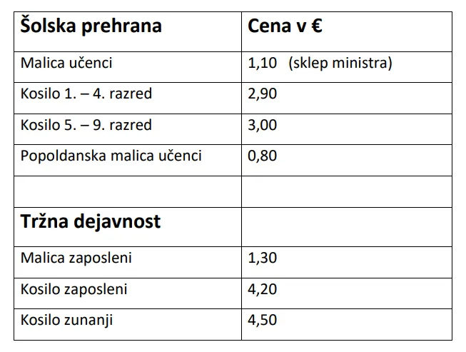 Prijavo na šolsko prehrano se vloži na obrazcu. Prijava se hrani v tajništvu do konca šolskega leta, za katero je bila oddana. Šolska prehrana obsega malico, kosilo in popoldansko malico.