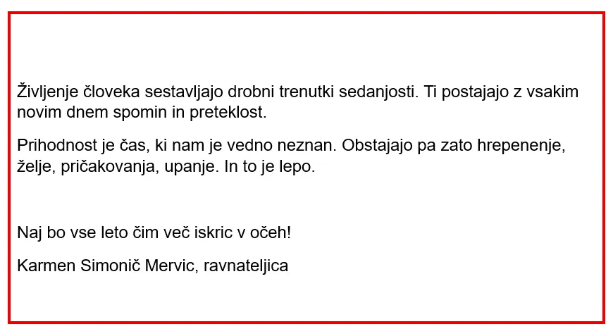 V času šolskih počitnic od 29. do 31. decembra 2025) bo šola zaprta. V nujnih primerih se obrnite na odgovorno osebo, ki je dosegljiva izven poslovnega časa zavoda (Karmen Simonič Mervic, mobilni telefon 031 699 900).