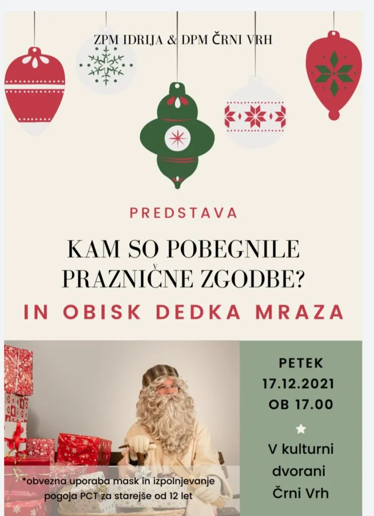 ZPM Idrija in DPM Črni Vrh v soboto organizirata predstavo in obisk dedka Mraza. V petek ste vabljeni v Kulturno dvorano v Črnem Vrhu ob 17.00.