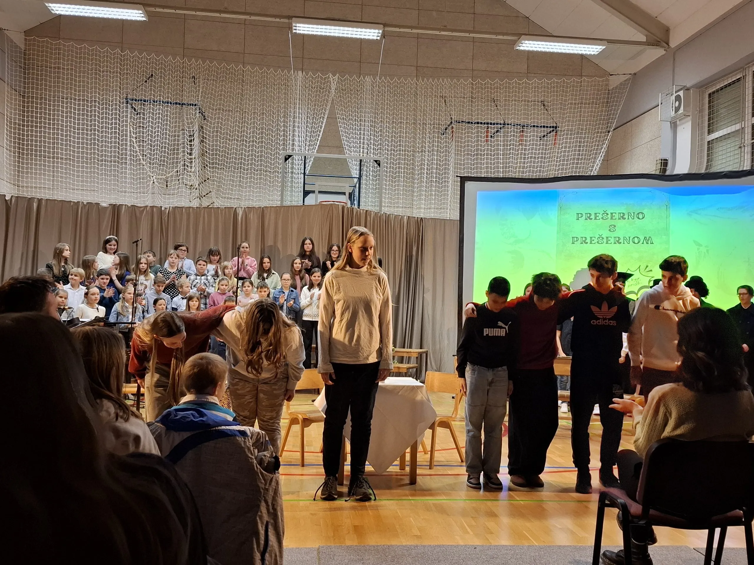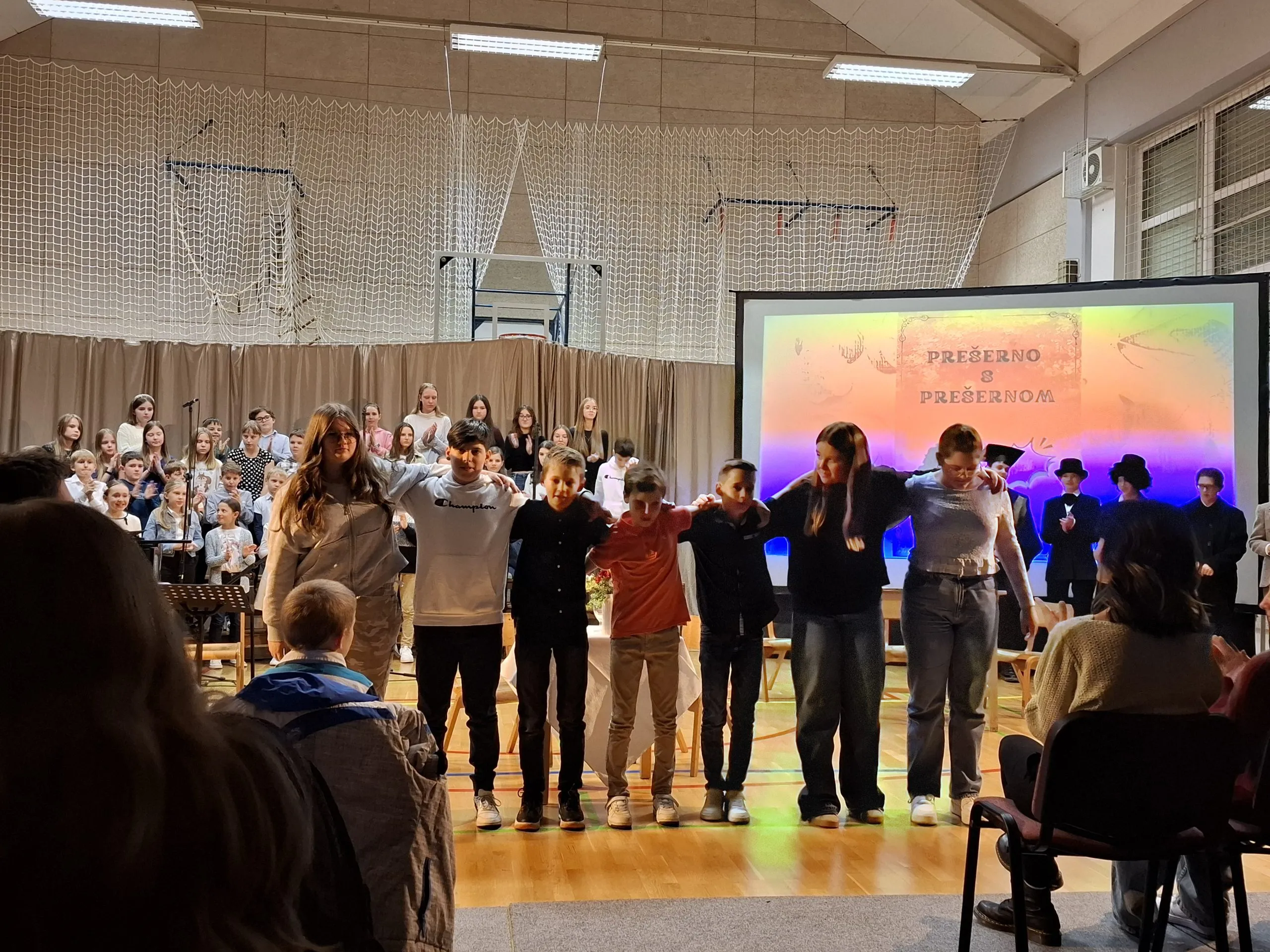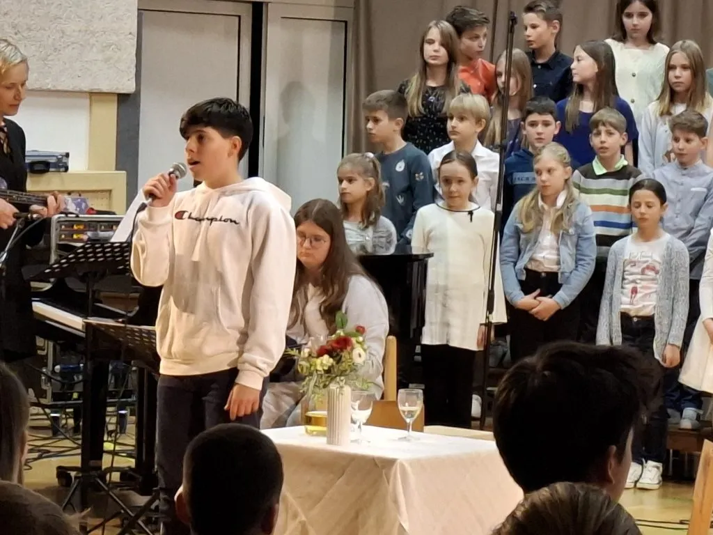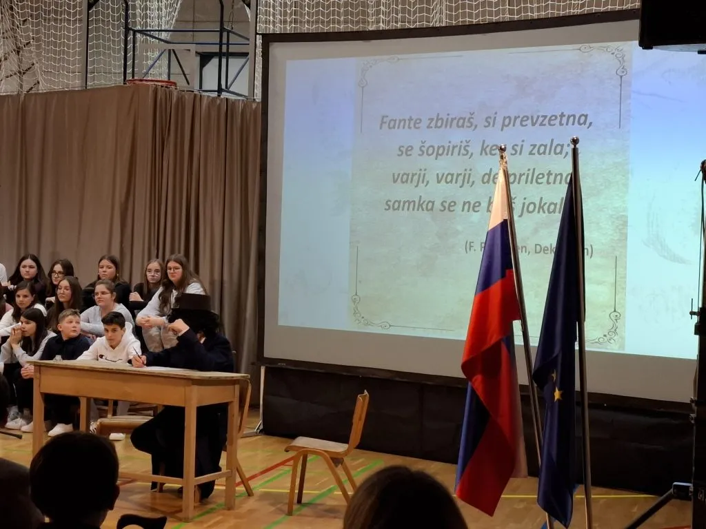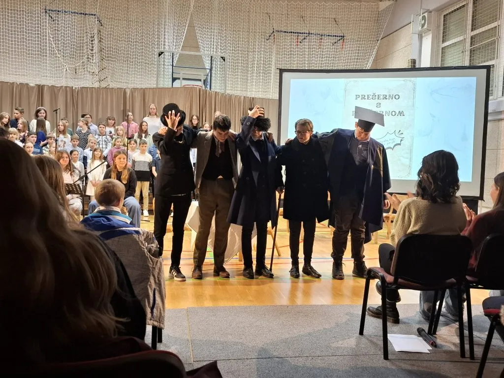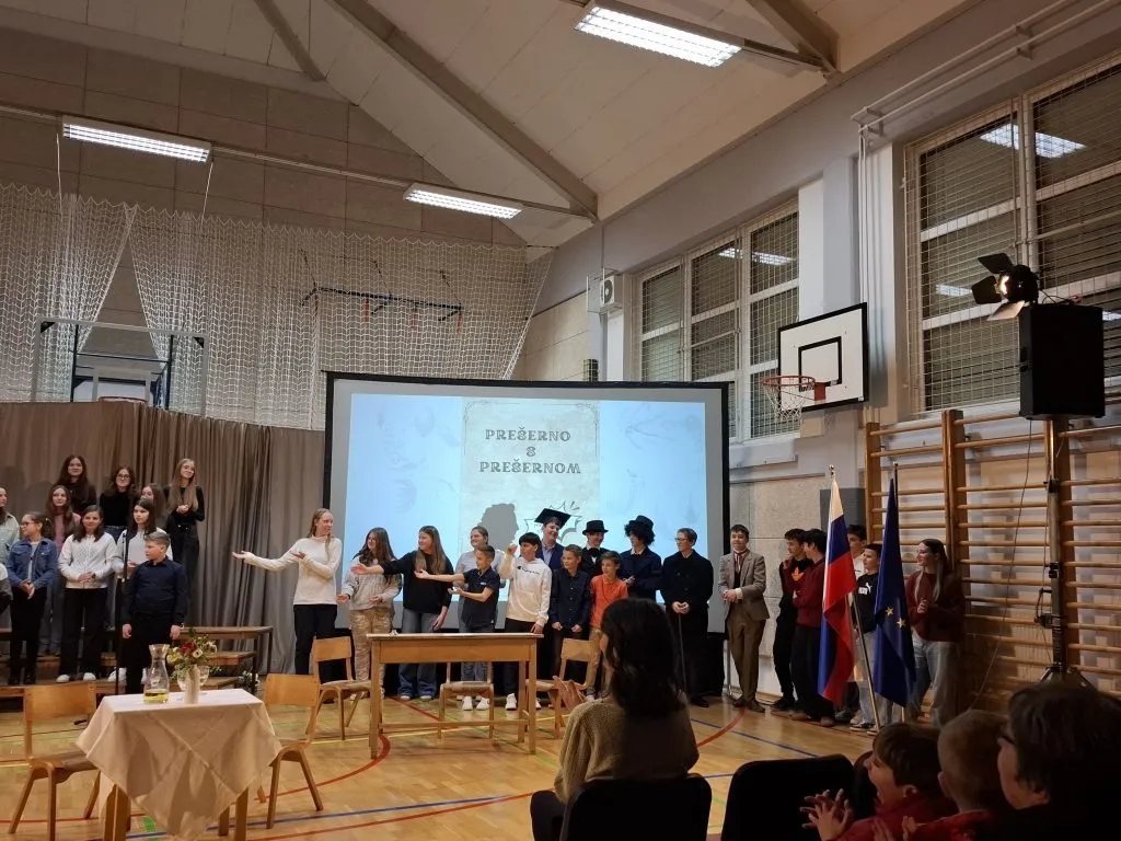 Nastop so zaključili učenci, ki so v različnih jezikih deklamirali 7. kitico Zdravljice in dokazali, da naša himna lepo zveni tudi v španščini, angleščini, nemščini, hrvaščini, ukrajinščini in italijanščini. Poklon Amadeji-Deji, Veroniki, Luku, Ivanu, Karyni in Eliji.