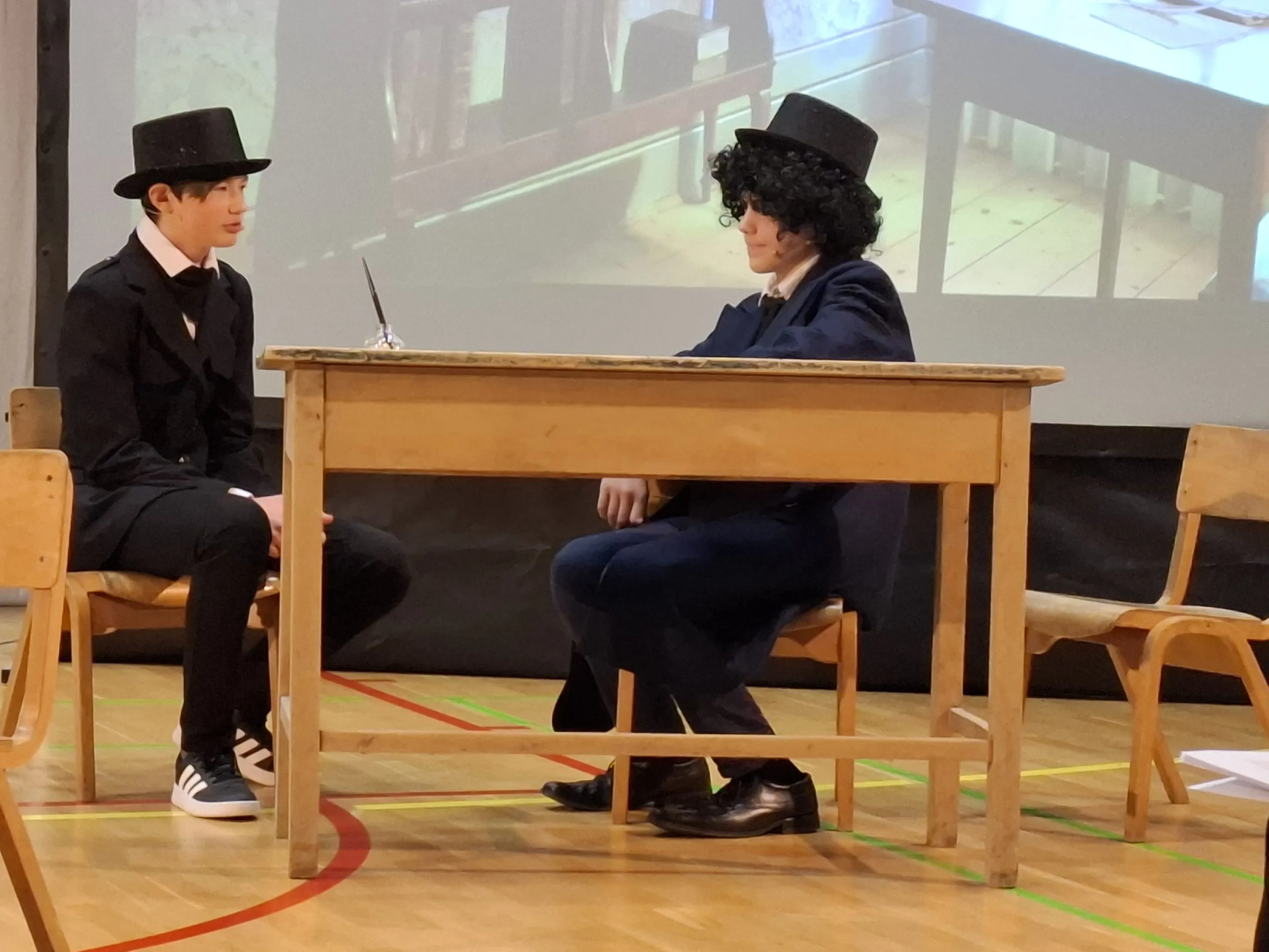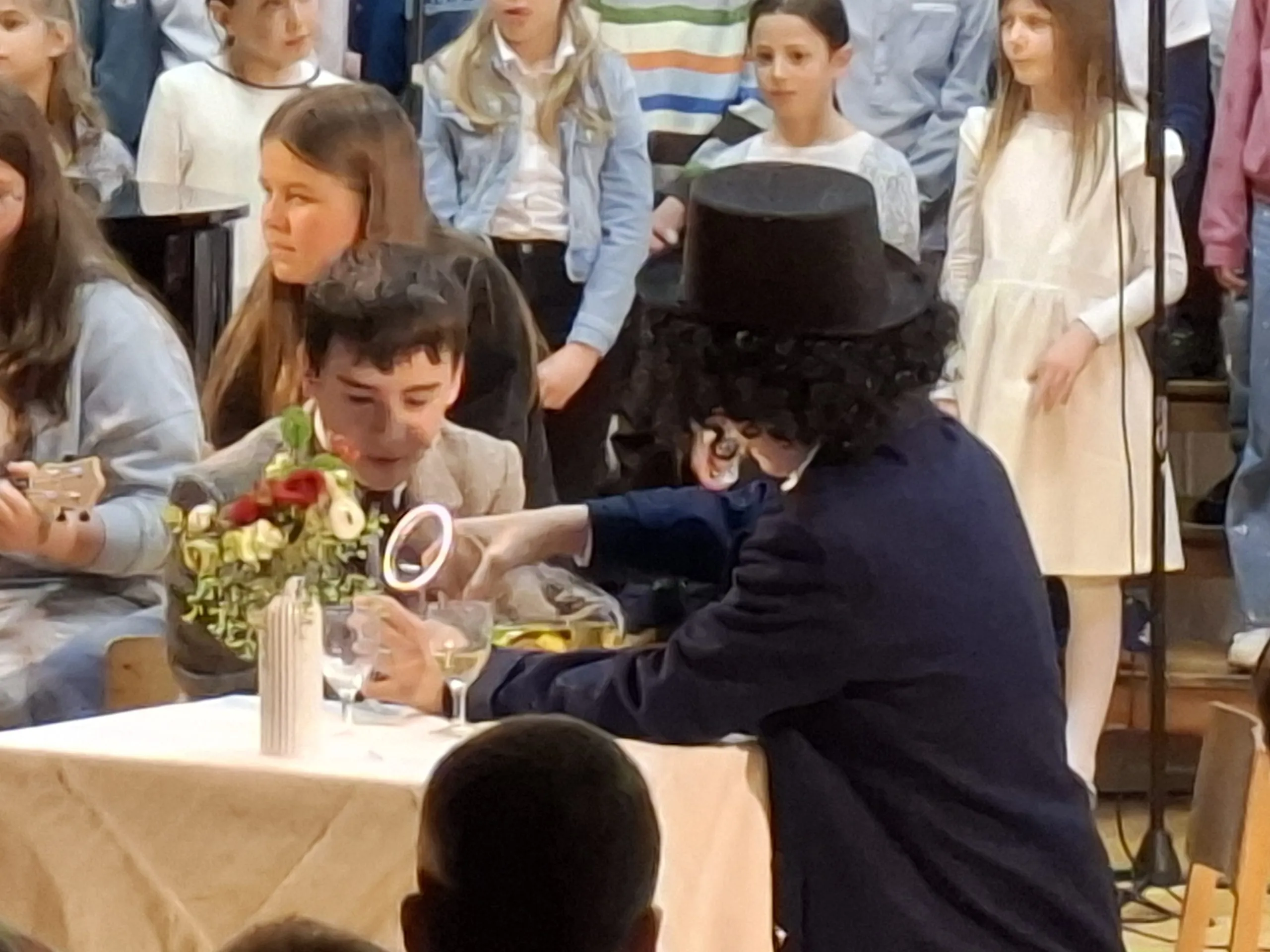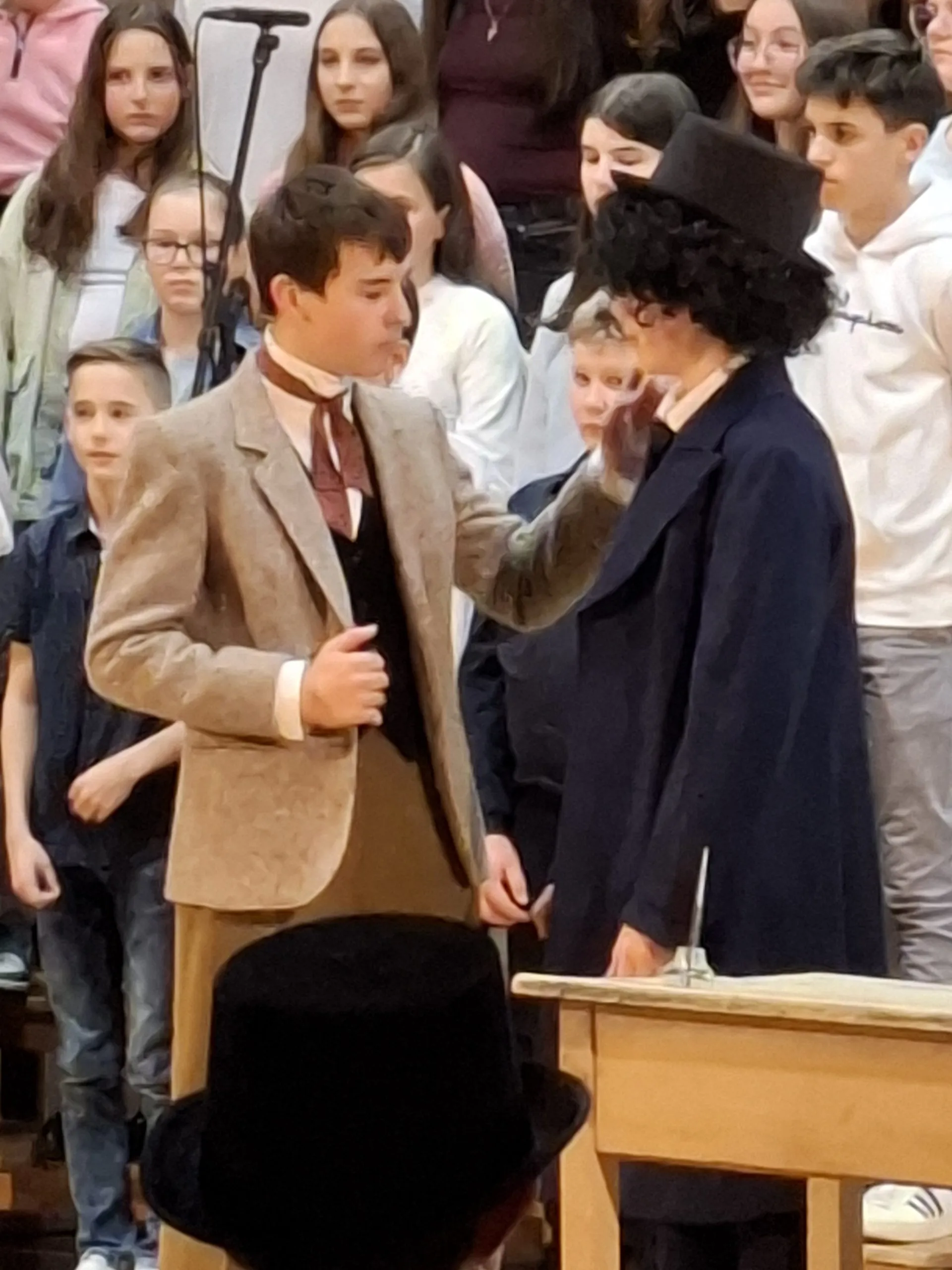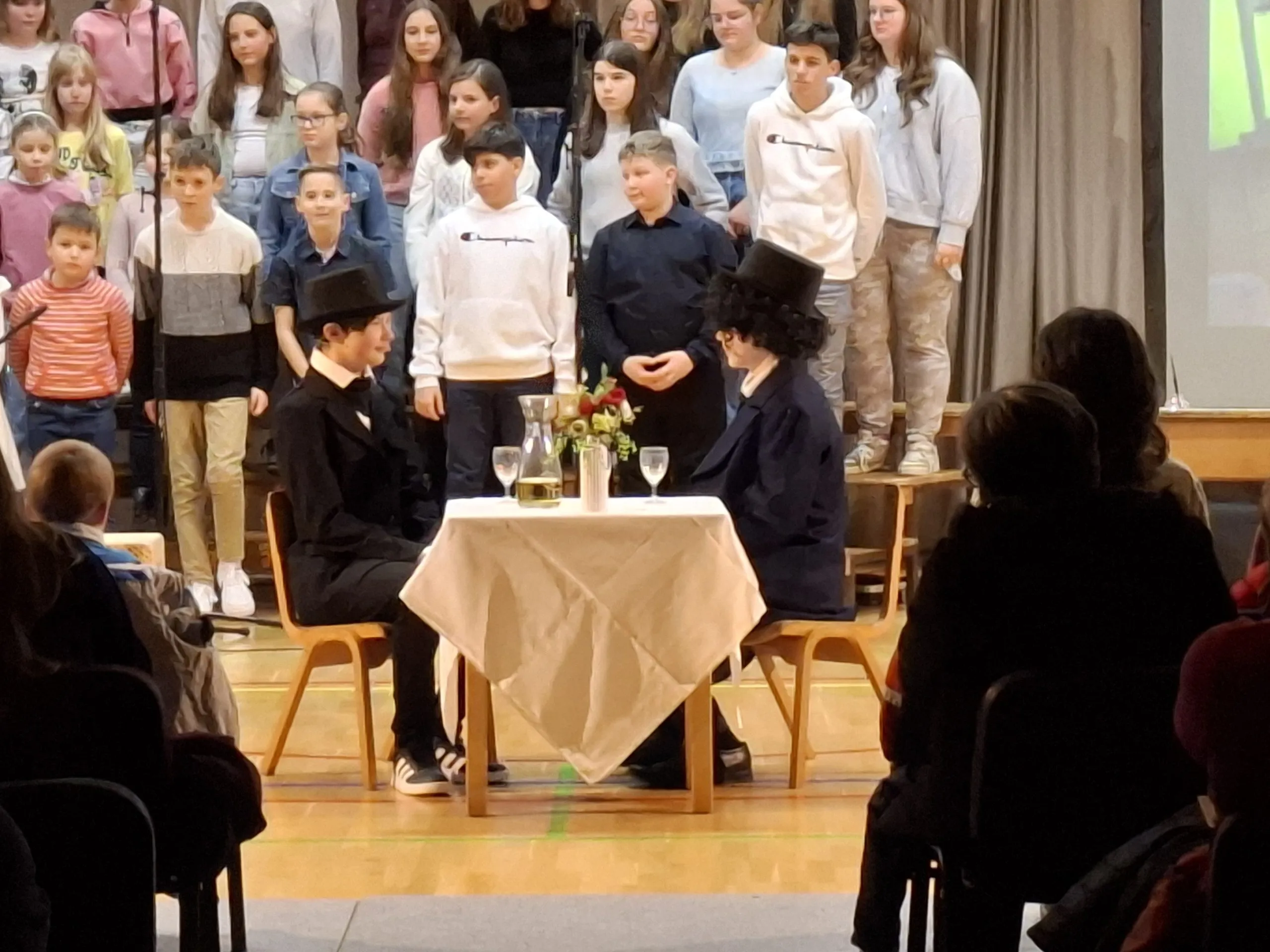 V dopoldanskem času so učenci 9. razreda v eni izmed učilnic pridno pomagali pri pripravi sladkega presenečenja za obiskovalce prireditve. Na drugi strani šole so nekateri pripravljali sceno in pilili še zadnje detajle. V zraku je bilo čutiti napetost pred večerno predstavo in zdelo se je, da bo trema preveč posegla vmes. A ko so se luči ugasnile in so na oder stopili učenci obeh zborov ter glavni igralci, se je zdelo, da sta dež in veter, ki sta bíla zunaj, odgnala strah in v dvorano prinesla pozitivno energijo.