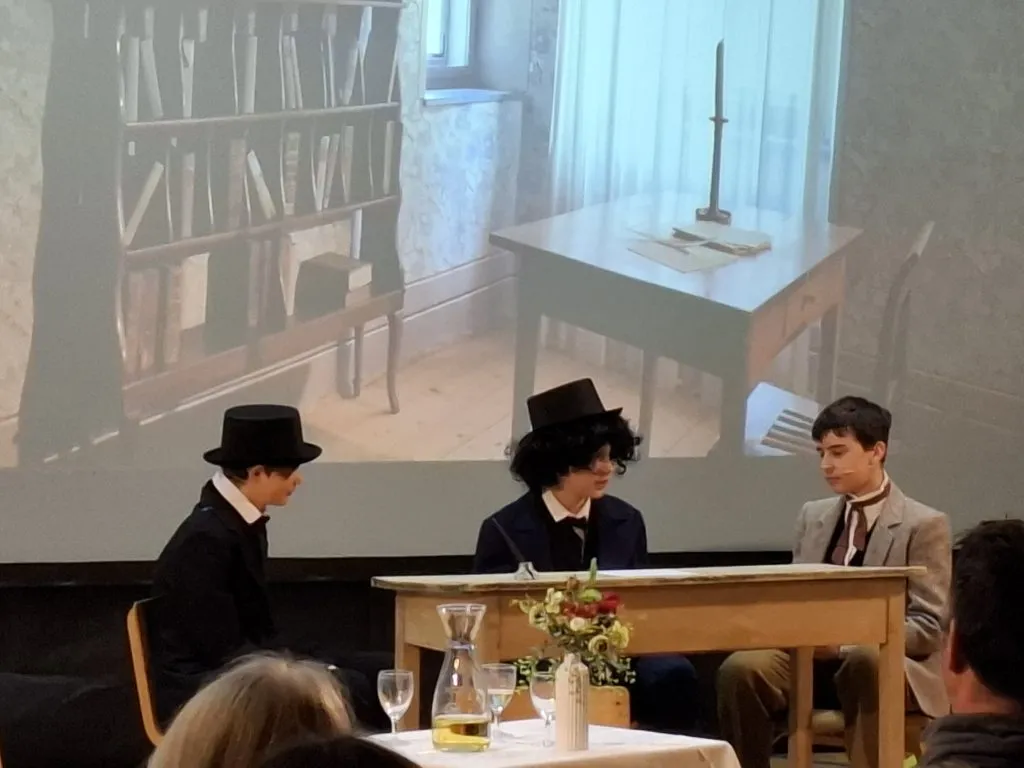 Prireditev nas je popeljala skozi pesnikov čas in njegovo neizbrisno zapuščino. Urban Fajdiga, osmošolec, ki je za eno uro postal Prešeren, je odlično izpeljal svoje delo. Figura pesnika mu je bila pisana na kožo, saj je mojstrsko odigral vse prizore in skupaj s kolegom Matijo Čopom, ki ga je odigral David Lampe, čutno zapel v duetu. Na odru so se jima pridružili še drugi pomembni ljudje iz Prešernovega časa, med drugimi dunajski profesor (vlogo je odigral Jakob Hladnik), Andrej Smole (vanj se je prelevil Fran Tominec) ter Jernej Kopitar (interpretiral ga je Tobija Čuk). Vseh pet fantov je delo opravilo z odliko, čeprav je bil za marsikaterega izmed njih to krstni nastop.