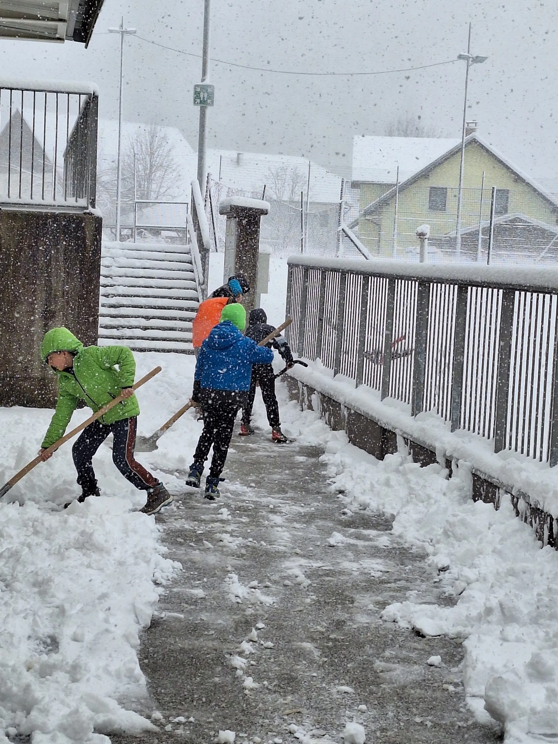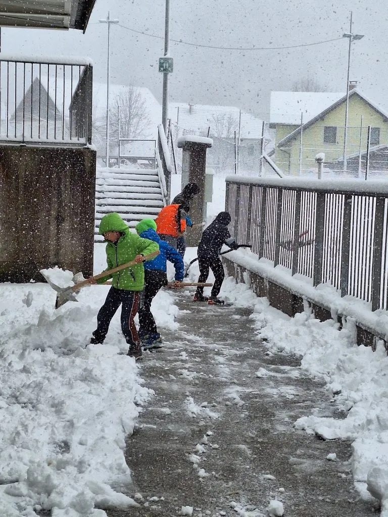 Osmošolca in nekaj četrtošolcev so peto šolsko uro na svojo veliko željo v roke prijeli lopate ter odkidali vhod v šolo in stopnice pod budnim očesom ge. Bajc Hlad.