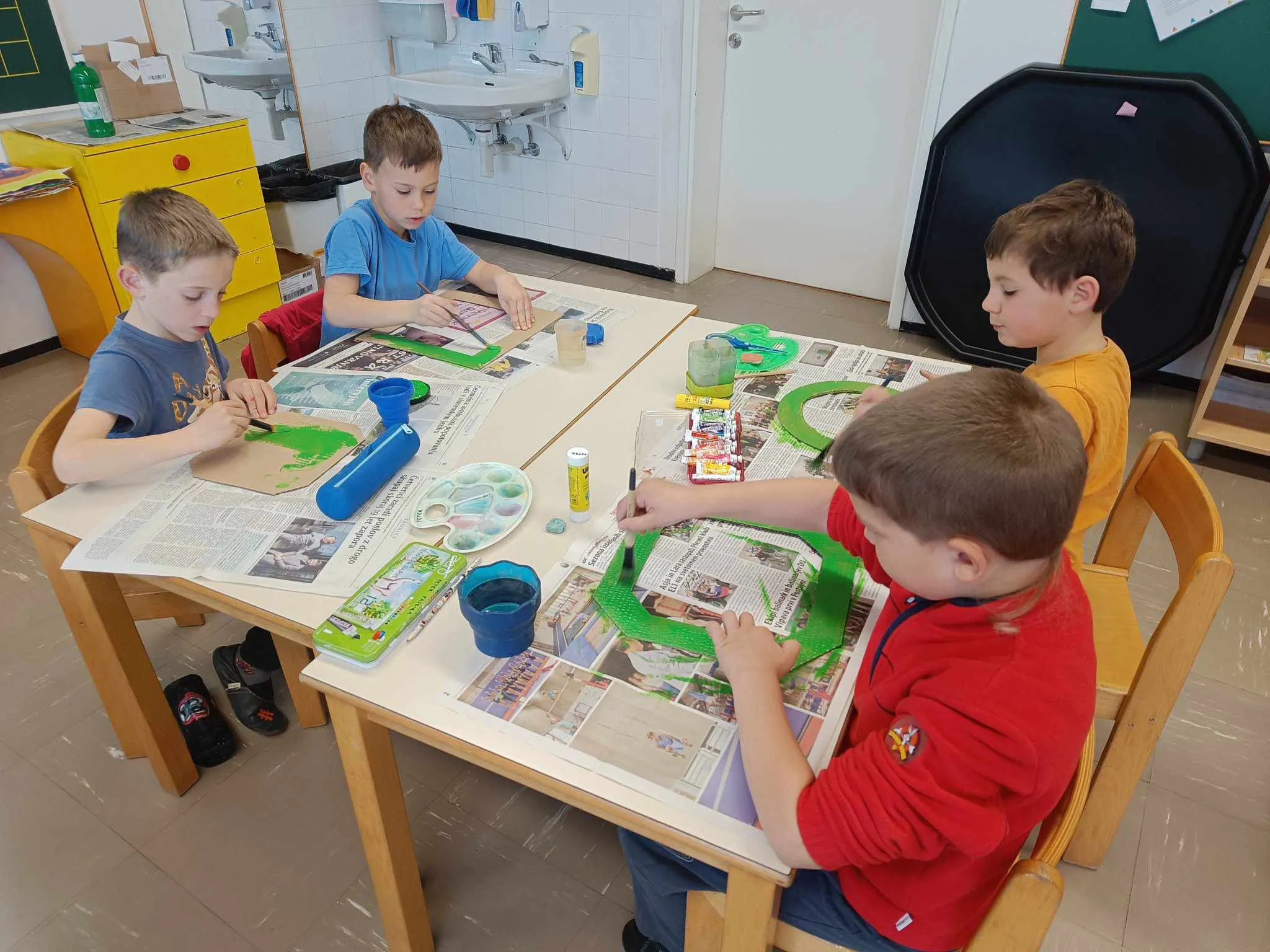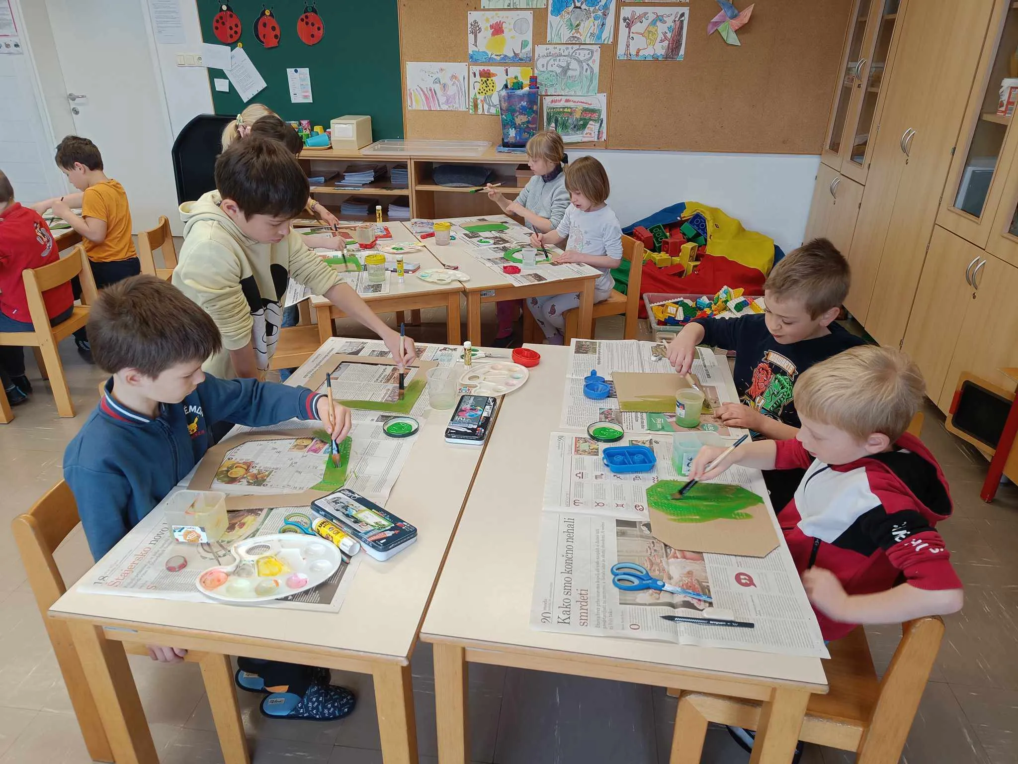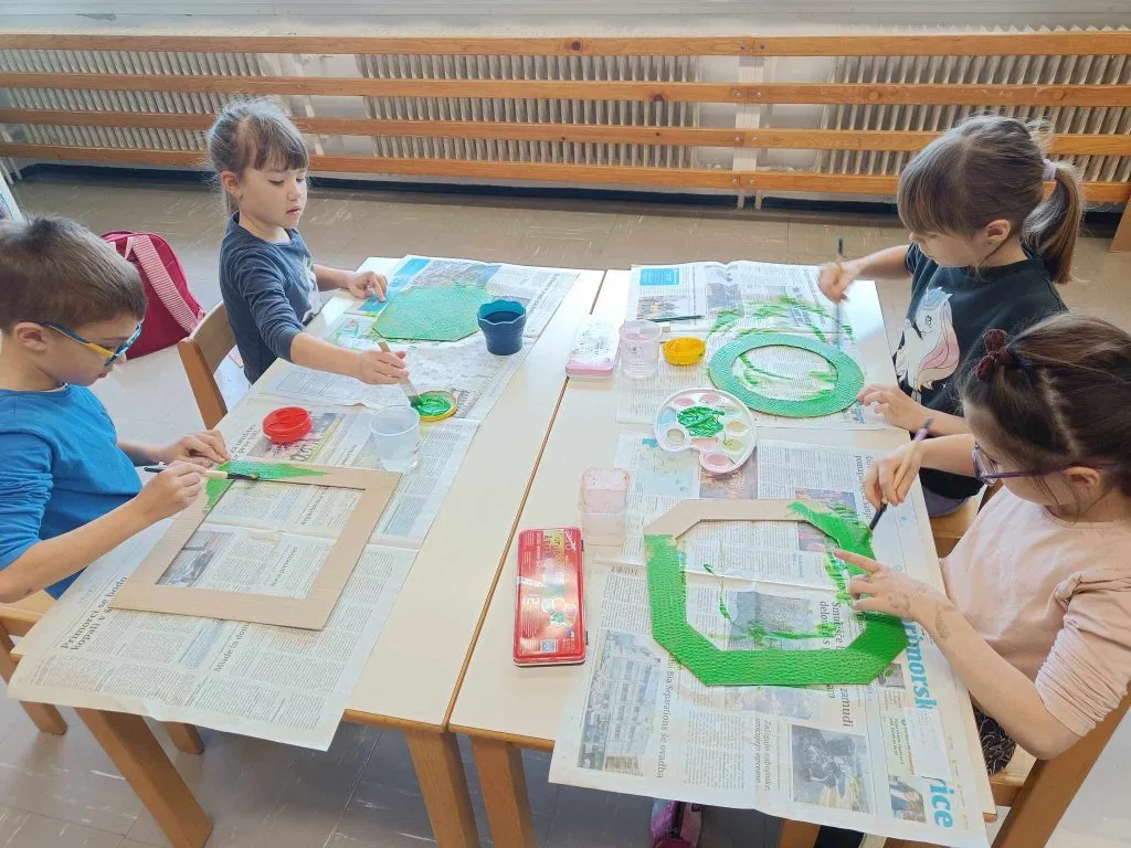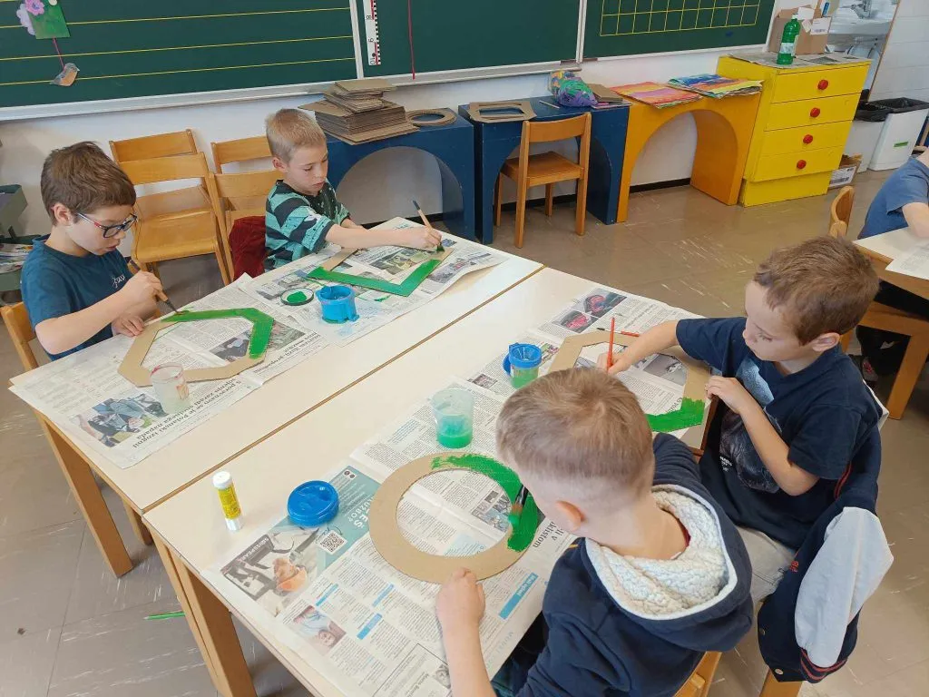 V mešanih skupinah so rezali, lepili, risali in barvali. Bili so motivirani in zavzeti ter izdelali čudovite obešanke.
