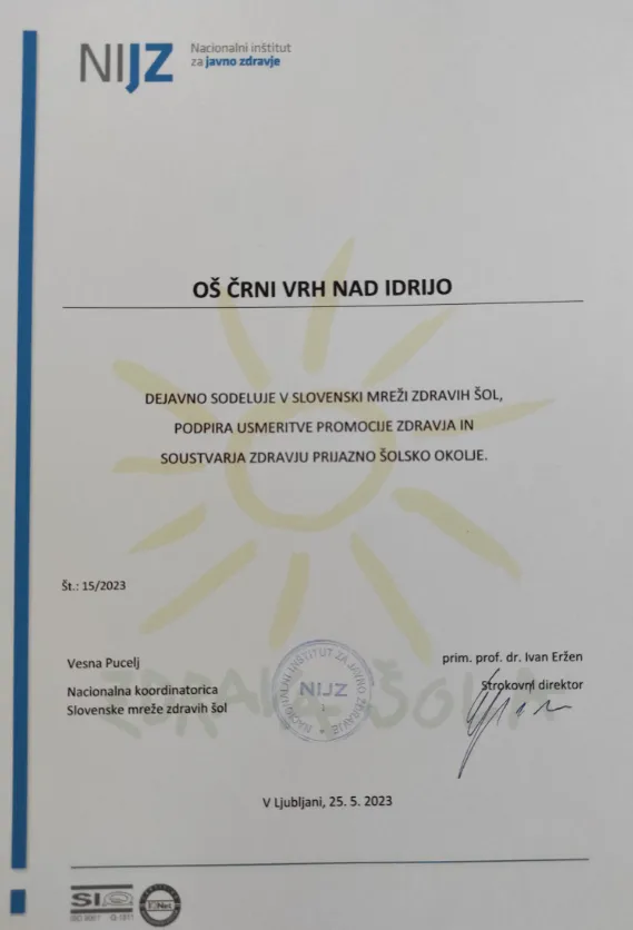 V četrtek, 25. maja 2023, je v prostorih NIJZ-ja v Ljubljani poteklo uvodno srečanje šol, ki so po predhodni prijavi z opisom dosedanjih rezultatov dela na področju zdravja, bile sprejete v slovensko mrežo Zdravih šol. Projekt, ki ga izvaja NIJZ, ima dolgo tradicijo, letos praznuje že 30 let. Z vključitvijo naše šole v slovensko mrežo Zdravih šol bomo nadgradili naše delo, imeli možnost sodelovanja z ostalimi šolami v projektu in spoznati kakšno dobro že uveljavljeno prakso. Na šoli bo projekt vodila Tina Bajc Hlad. V oblikovanje in izvajanje vsebin bomo povezali vse učence, delavce šole, vabljeni pa ste tudi starši.
