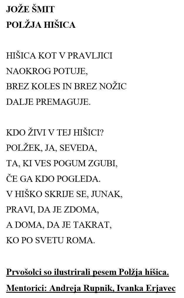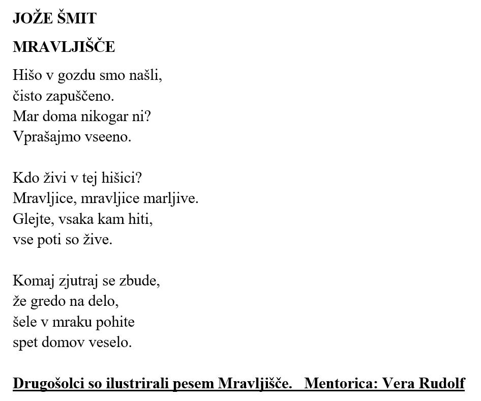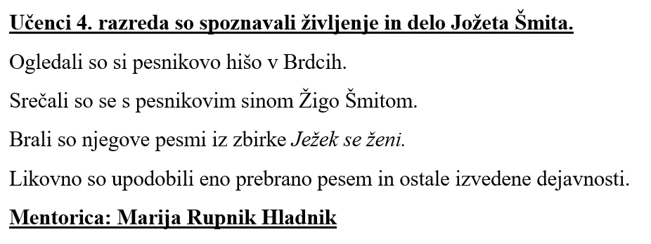 Prvošolci so ilustrirali pesem Polžja hišica, drugošolci pa pesem Mravljišče. Učenci 4. razreda so spoznavali življenje in delo Jožeta Šmita. Ogledali so si pesnikovo hišo v Brdcih tu v Črnem Vrhu Srečali so se s pesnikovim sinom Žigo Šmitom. Brali so njegove pesmi iz zbirke Ježek se ženi inlikovno upodobili eno prebrano pesem in ostale izvedene dejavnosti. Učenci petega razreda pa so poustvarjali različne pesnikove pesmi. V prilogi Likovni in literarni natečaj ob 100 letnici rojstva Jožeta Šmita si lahko ogledate izbrana dela učencev.