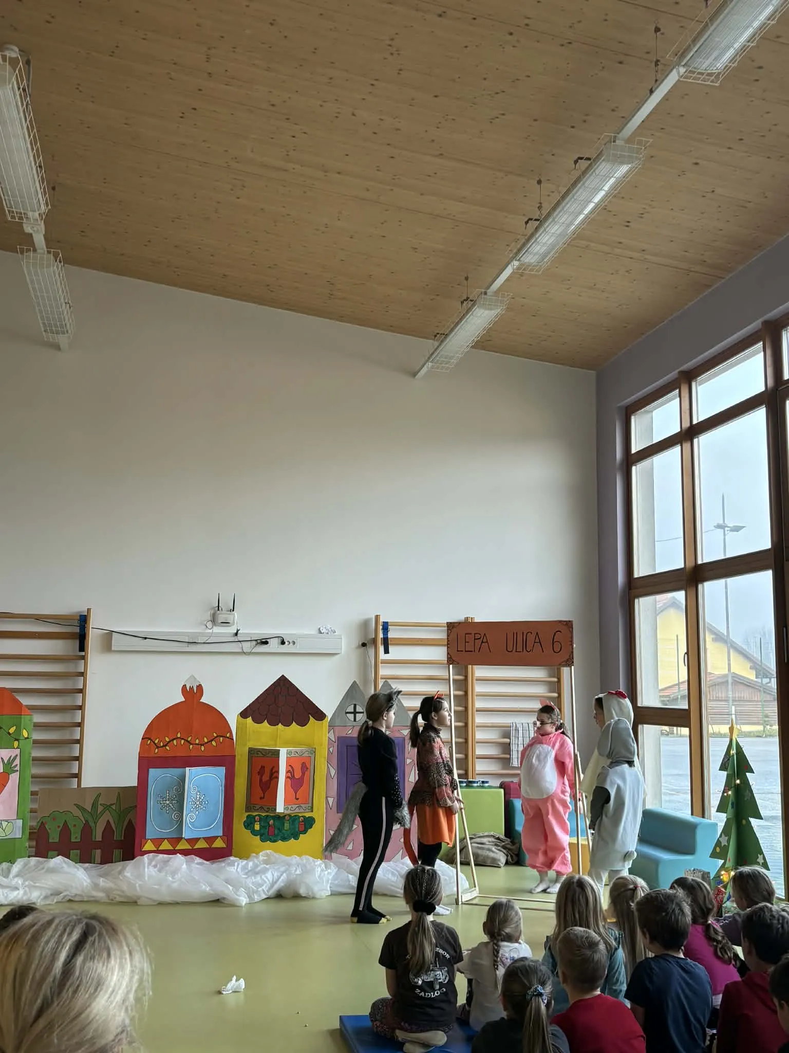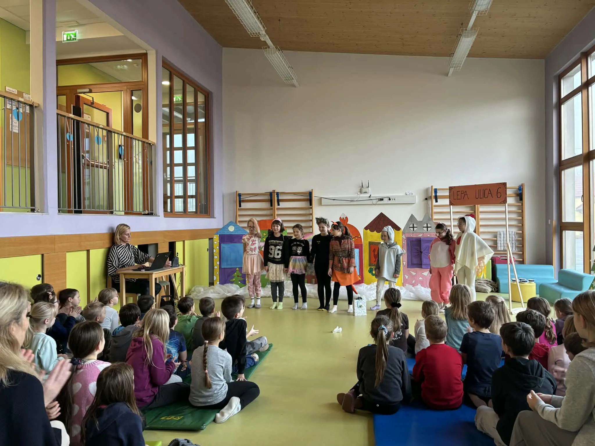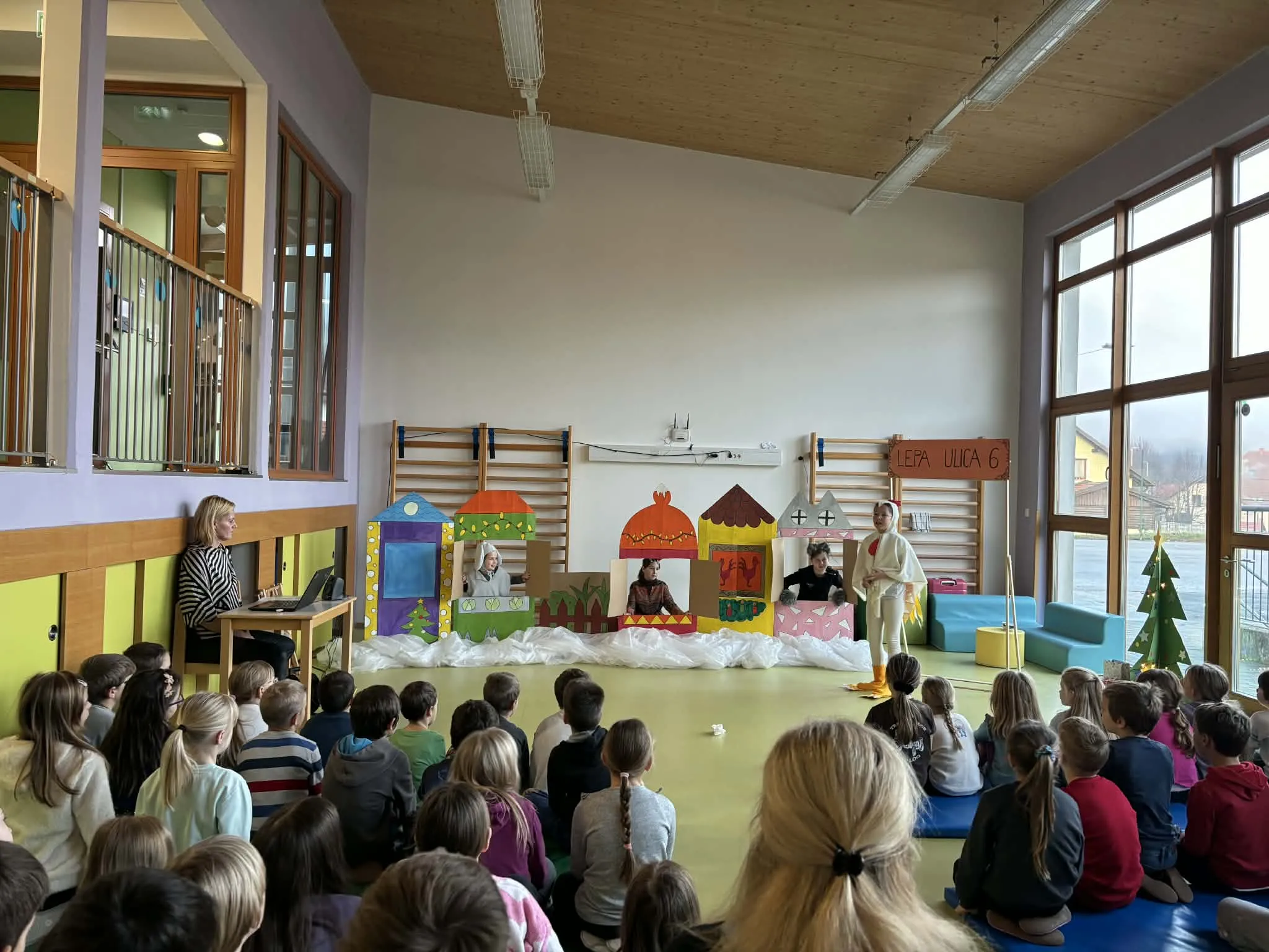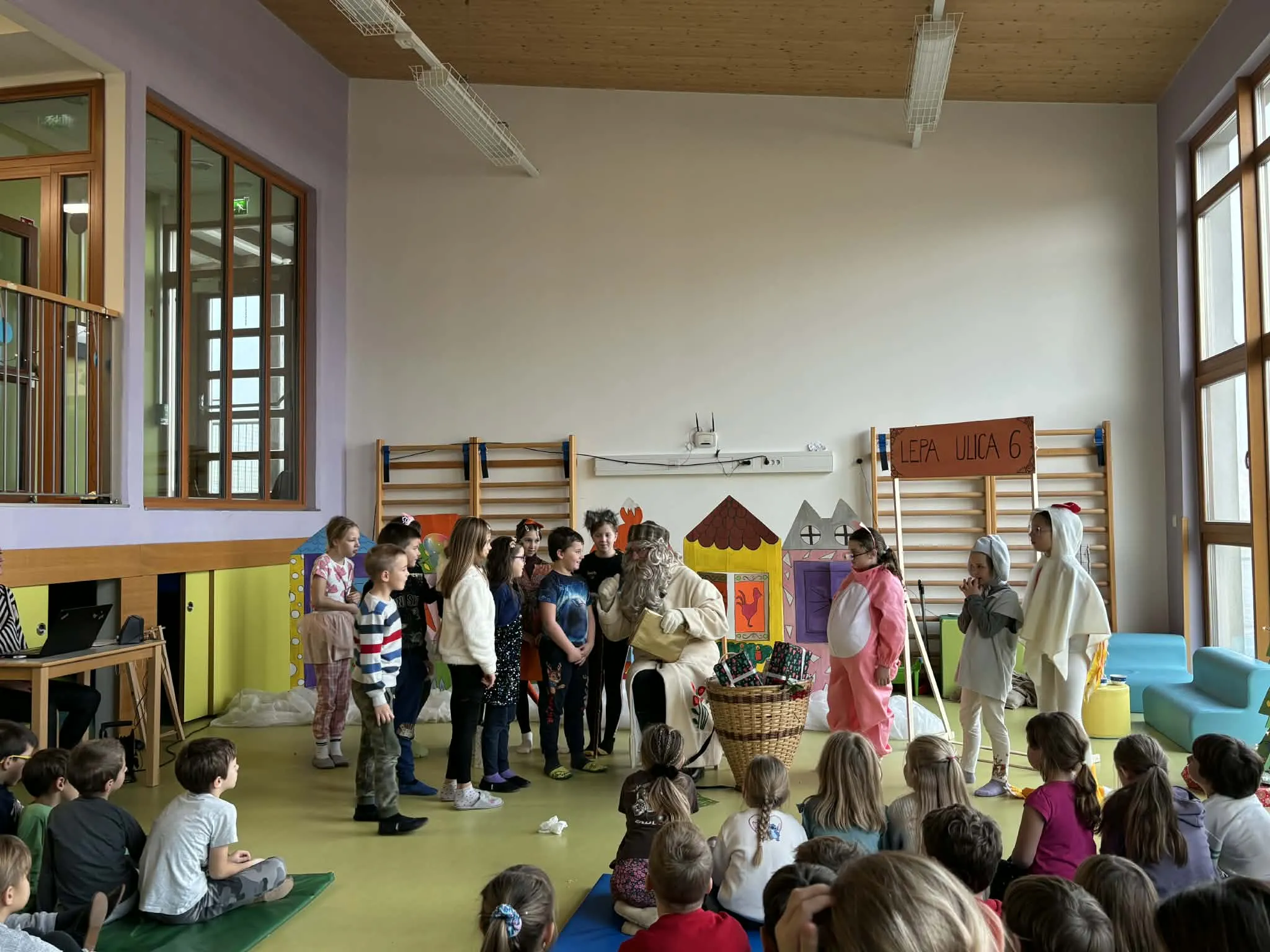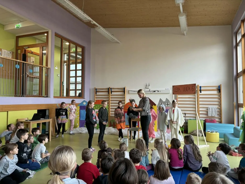 Četrtkovo jutro so učencem od 1. do 5. razreda popestrile učenke OŠ Spodnja Idrija, ki so pripravile čudovito predstavo »Pujsa imamo za soseda«. V svojih pisanih kostumih in ob čudoviti sceni so se učenke odlično znašle ter doživeto odigrale svoje vloge. Pod vodstvom učiteljice so učenke izvedle dva nastopa – enega za razredno stopnjo OŠ in eno za skupine iz vrtca.