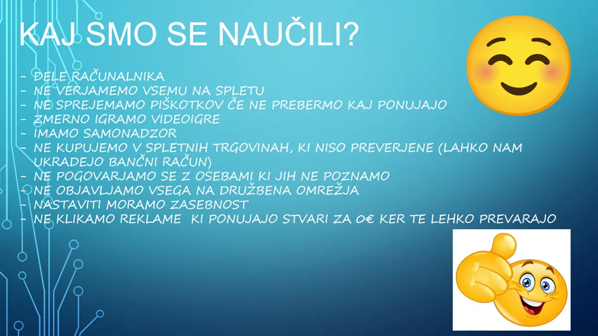 Učenci 6. razreda so prav tako imeli računalniško opismenjevanje, ki je potekalo 24. 9., 25. 9., 27. 9. in 30. 9. Učenci so spoznali zgradbo računalnika, varnost na internetu, previdnost pri družbenih omrežjih, kako odkriti lažne novice, kako preprečiti zasvojenost z računalniškimi igrami in kaj je spletni bonton. Učenci so zadnji dan izdelali predstavitve v programu PowerPoint, v katerem so predstavili, kaj so se naučili.