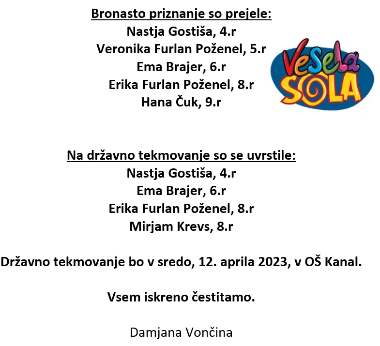 Znani so uradni rezultati šolskega tekmovanja Vesela šola, ki je potekalo v sredo, 8. marca 2023.