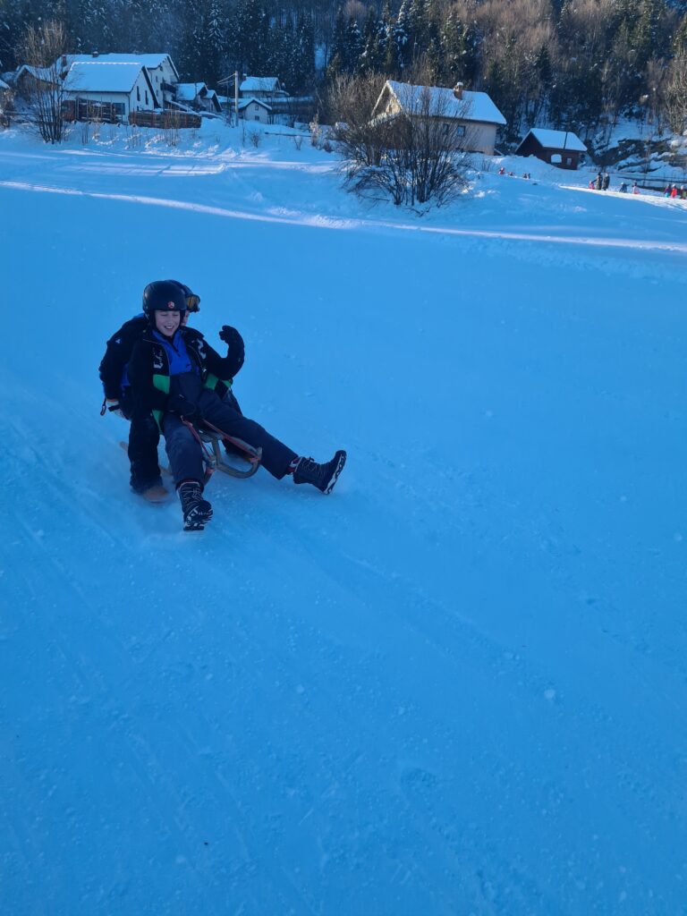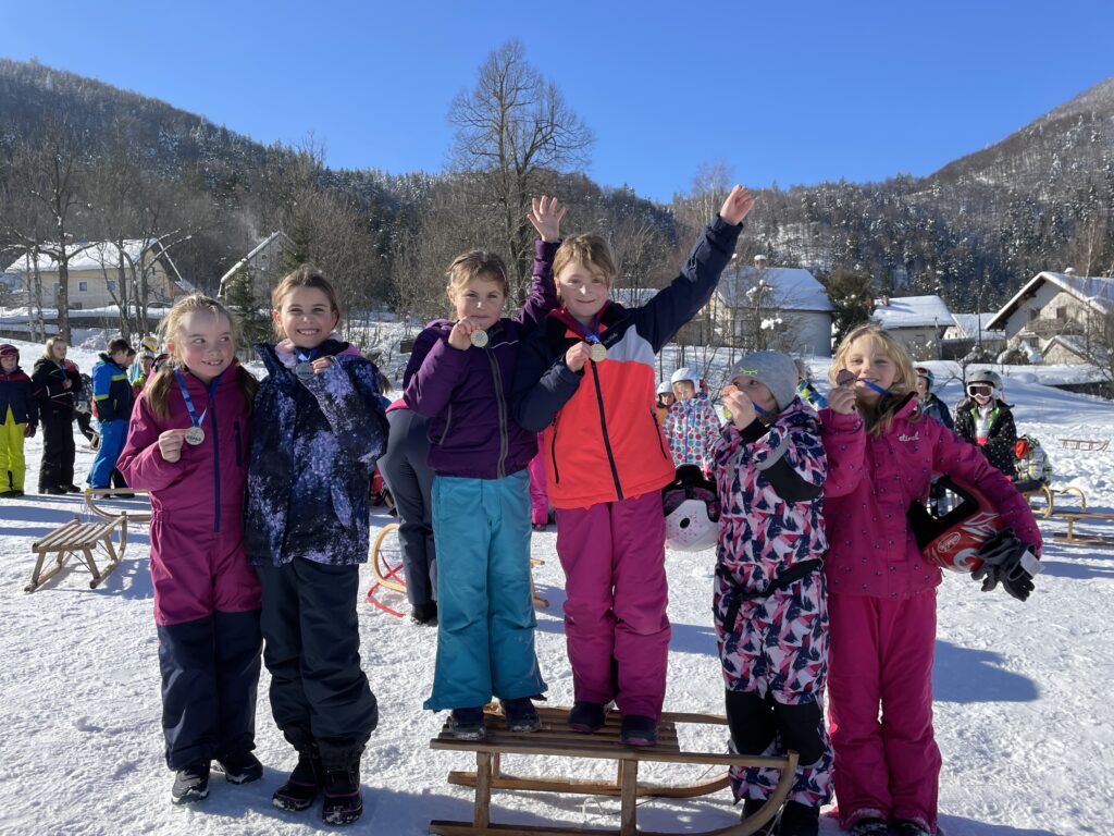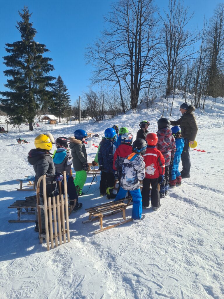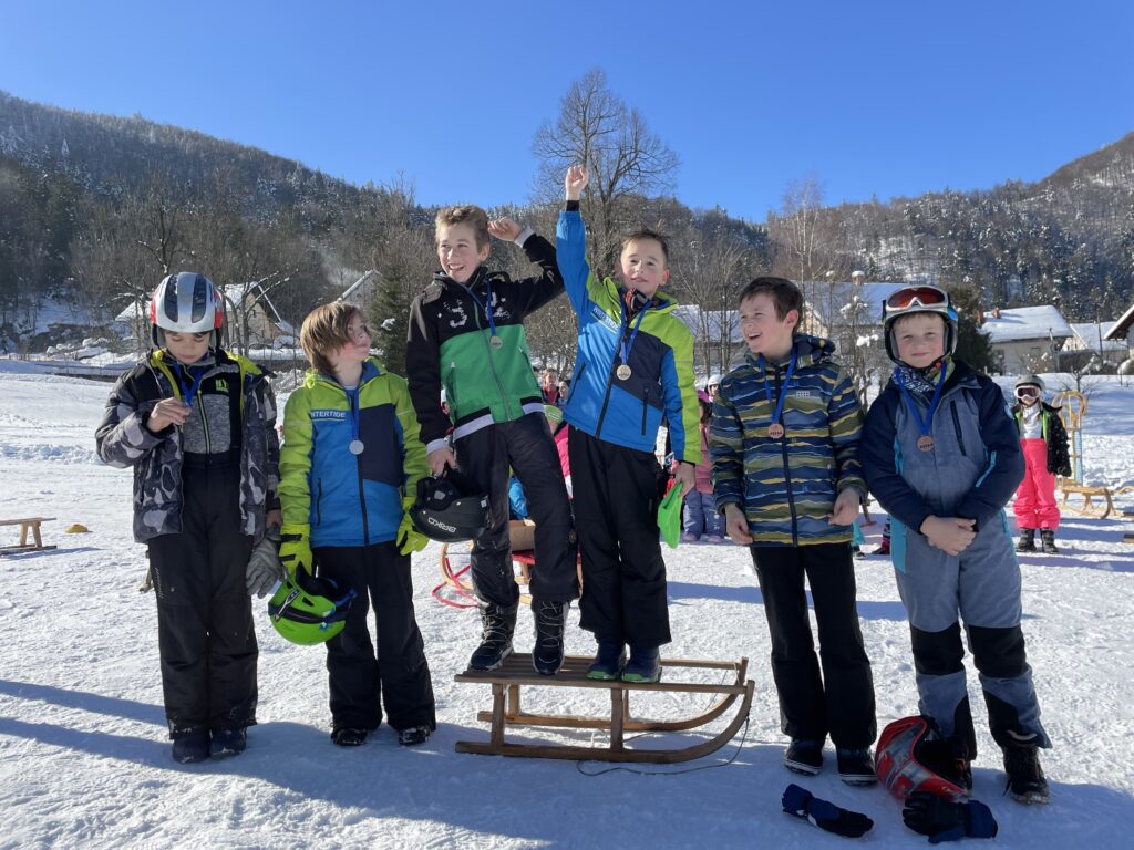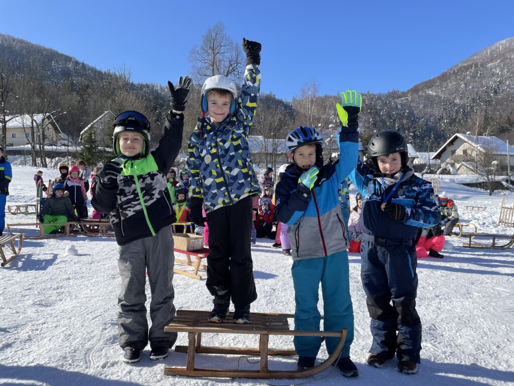Drago Kavčič je organiziral sankaški biatlon. V prvem delu tekmovanja so učenci morali spretno vijugati med stožci, v drugem delu pa ciljati z žogo. Učenci so bili hitri, spretni in nasmejani. Posebna pohvala na tekmovanju gre petošolkama Melisi in Eleni, ki sta imeli najboljši čas od vseh tekmovalcev.
