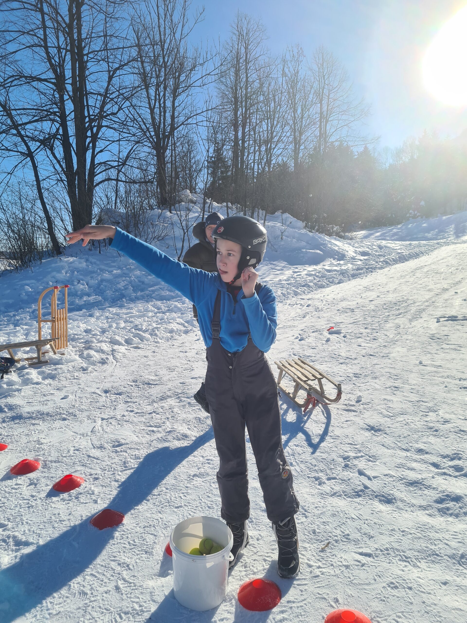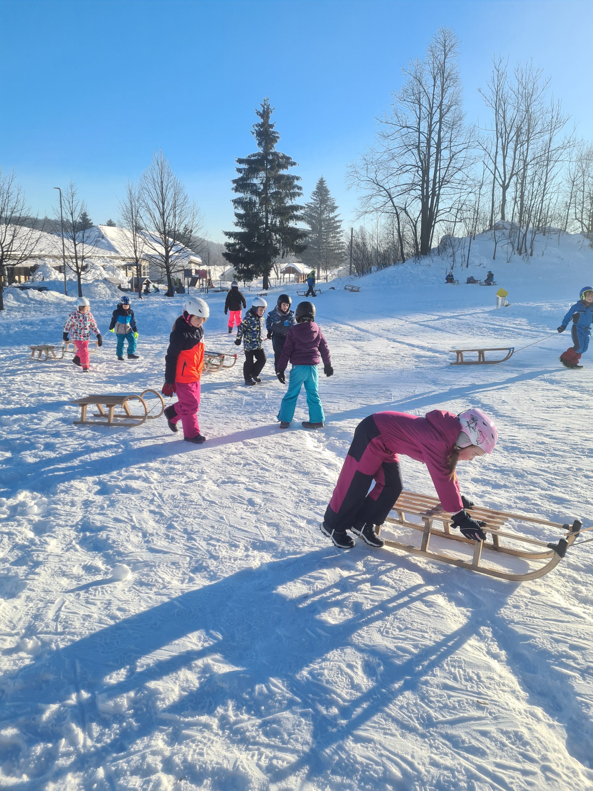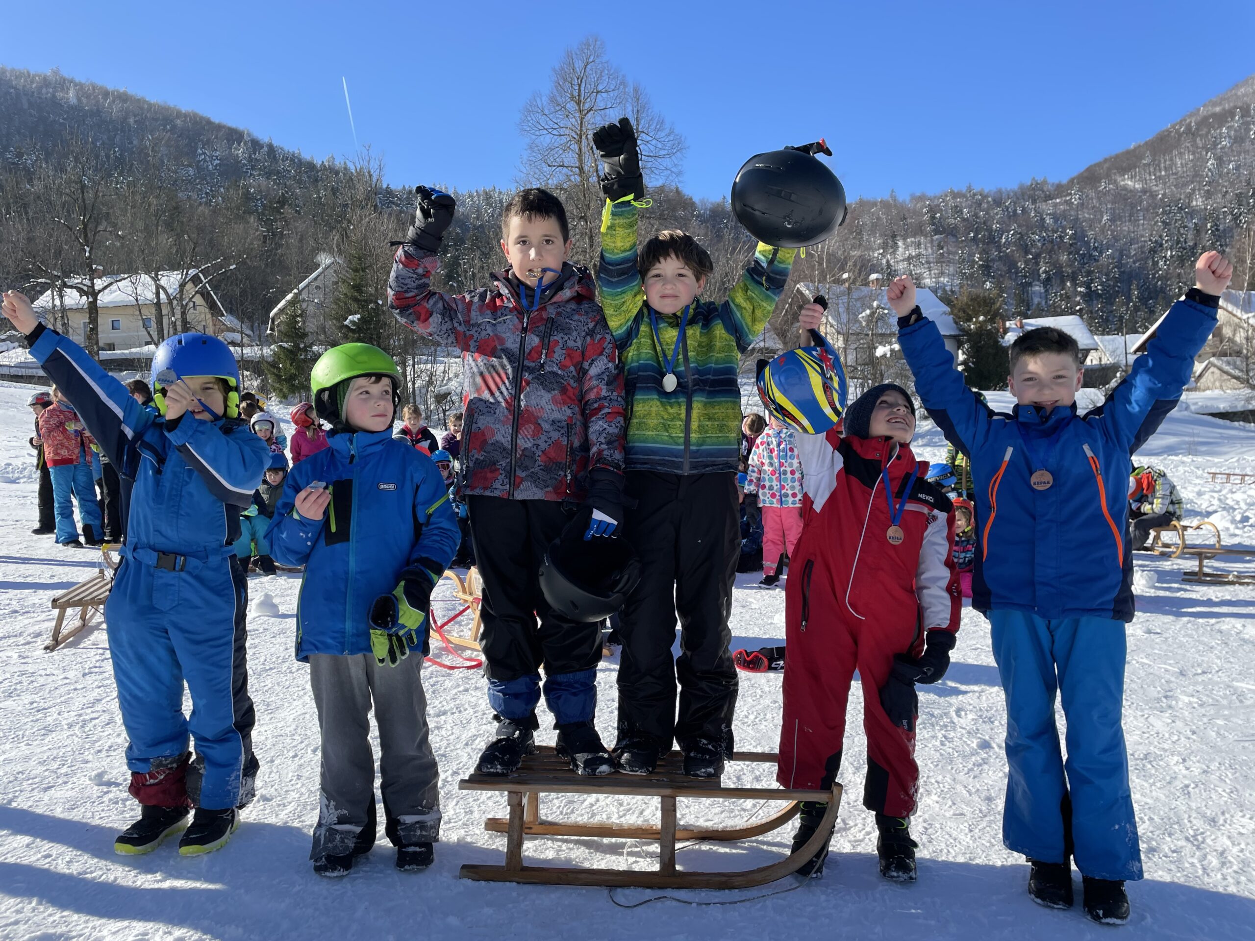 Drago Kavčič je organiziral sankaški biatlon. V prvem delu tekmovanja so učenci morali spretno vijugati med stožci, v drugem delu pa ciljati z žogo. Učenci so bili hitri, spretni in nasmejani. Posebna pohvala na tekmovanju gre petošolkama Melisi in Eleni, ki sta imeli najboljši čas od vseh tekmovalcev.
