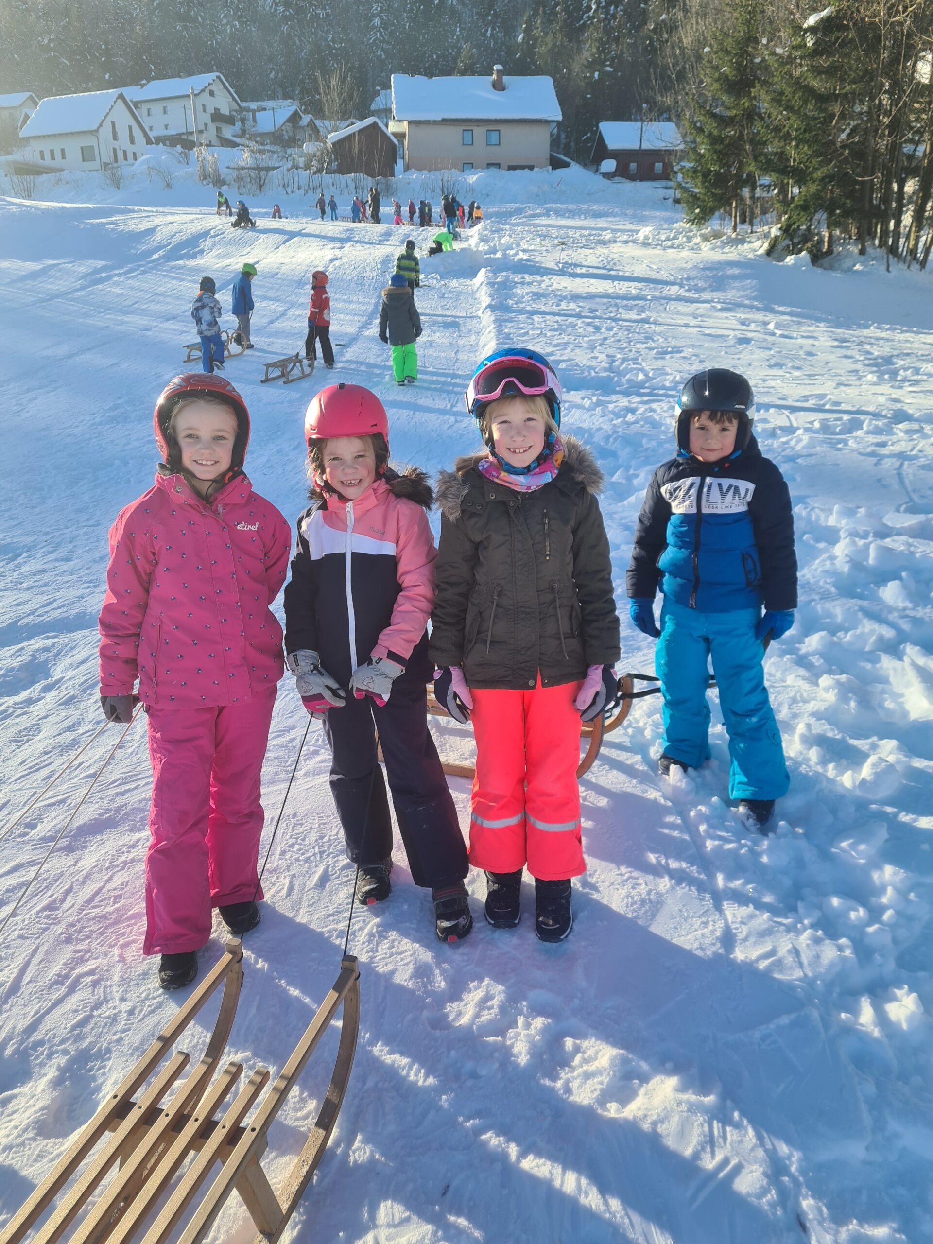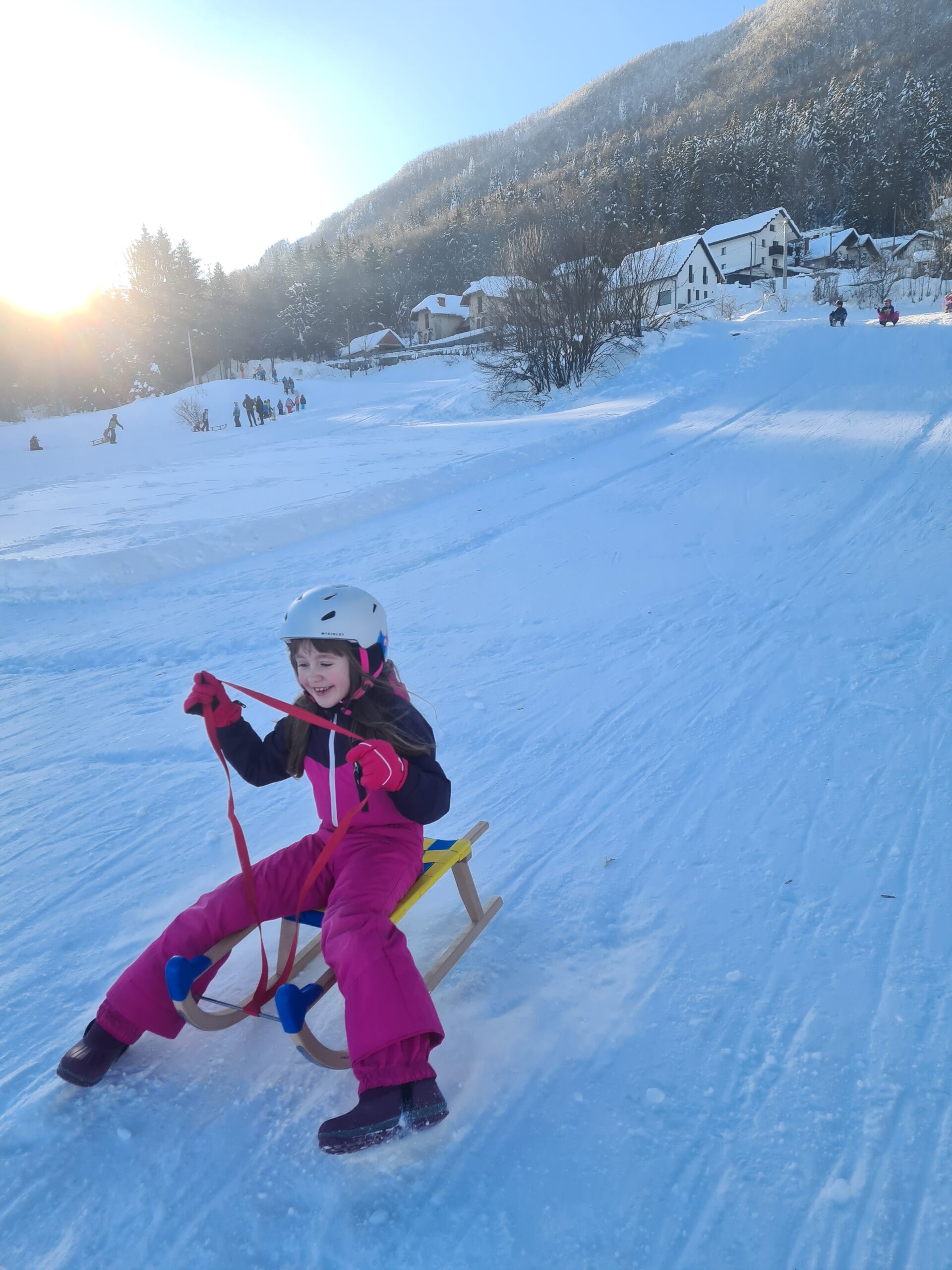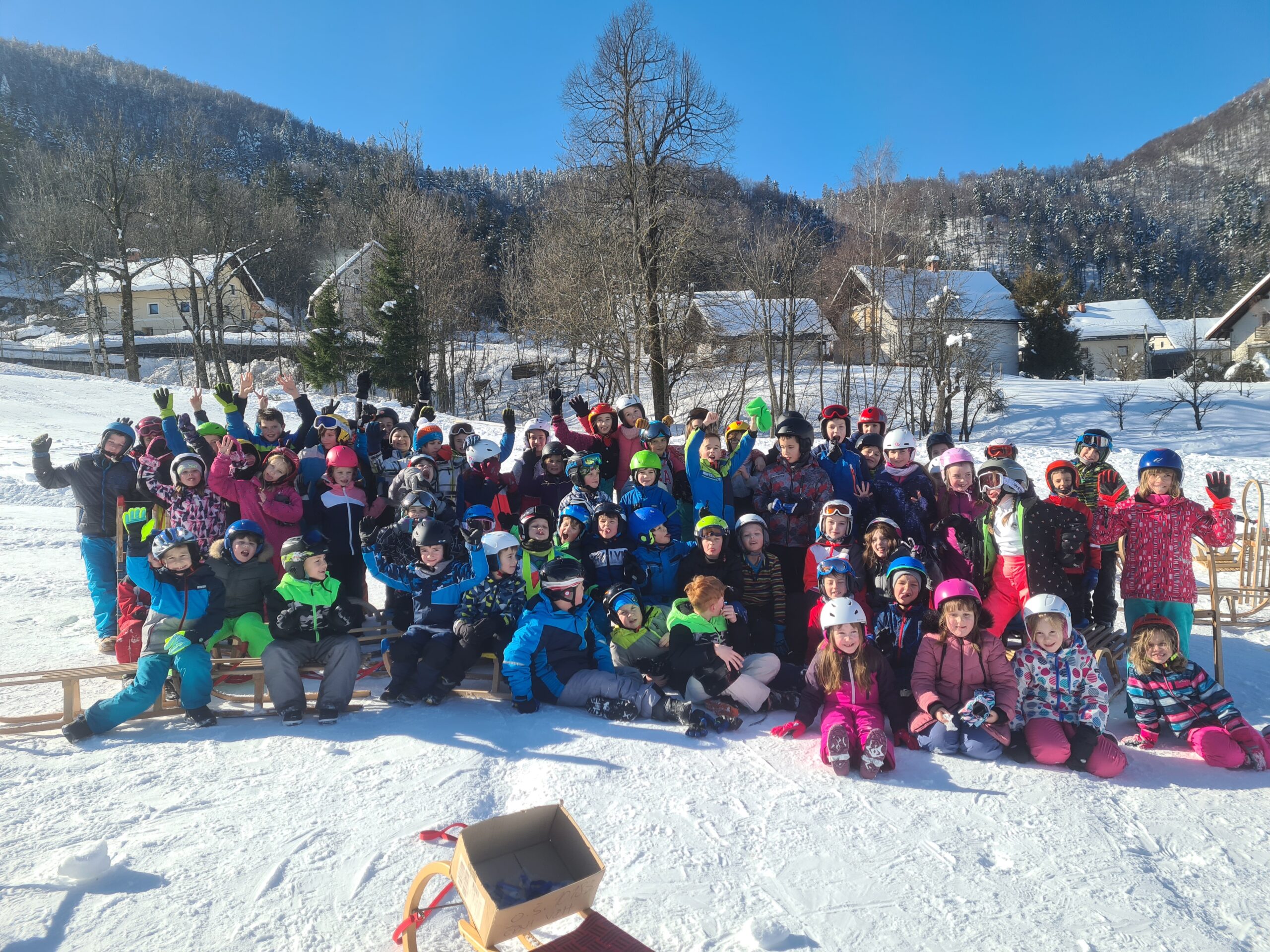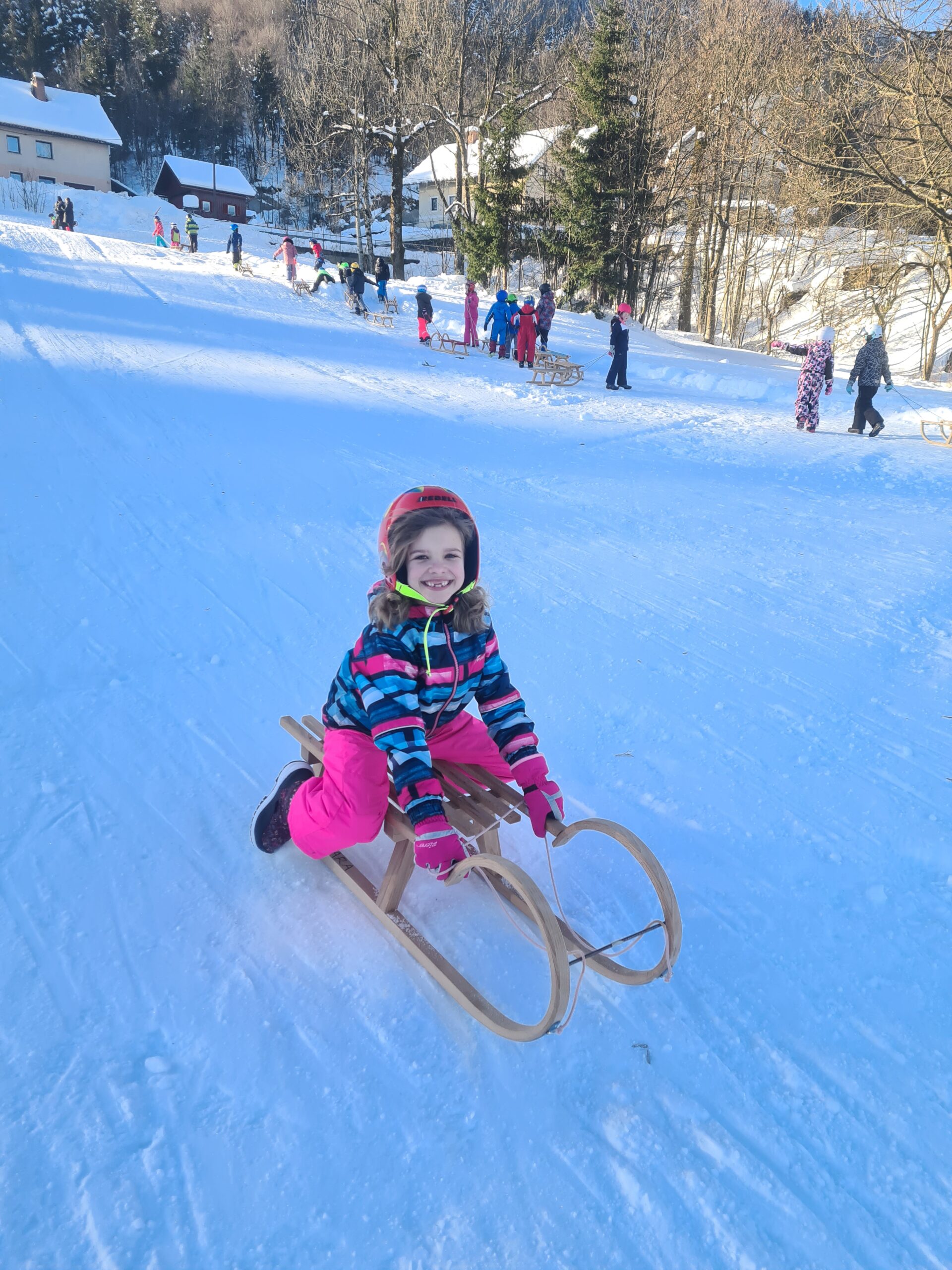 Drago Kavčič je organiziral sankaški biatlon. V prvem delu tekmovanja so učenci morali spretno vijugati med stožci, v drugem delu pa ciljati z žogo. Učenci so bili hitri, spretni in nasmejani. Posebna pohvala na tekmovanju gre petošolkama Melisi in Eleni, ki sta imeli najboljši čas od vseh tekmovalcev.