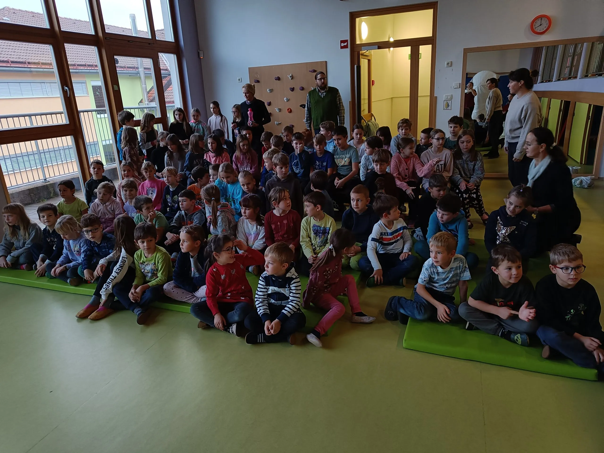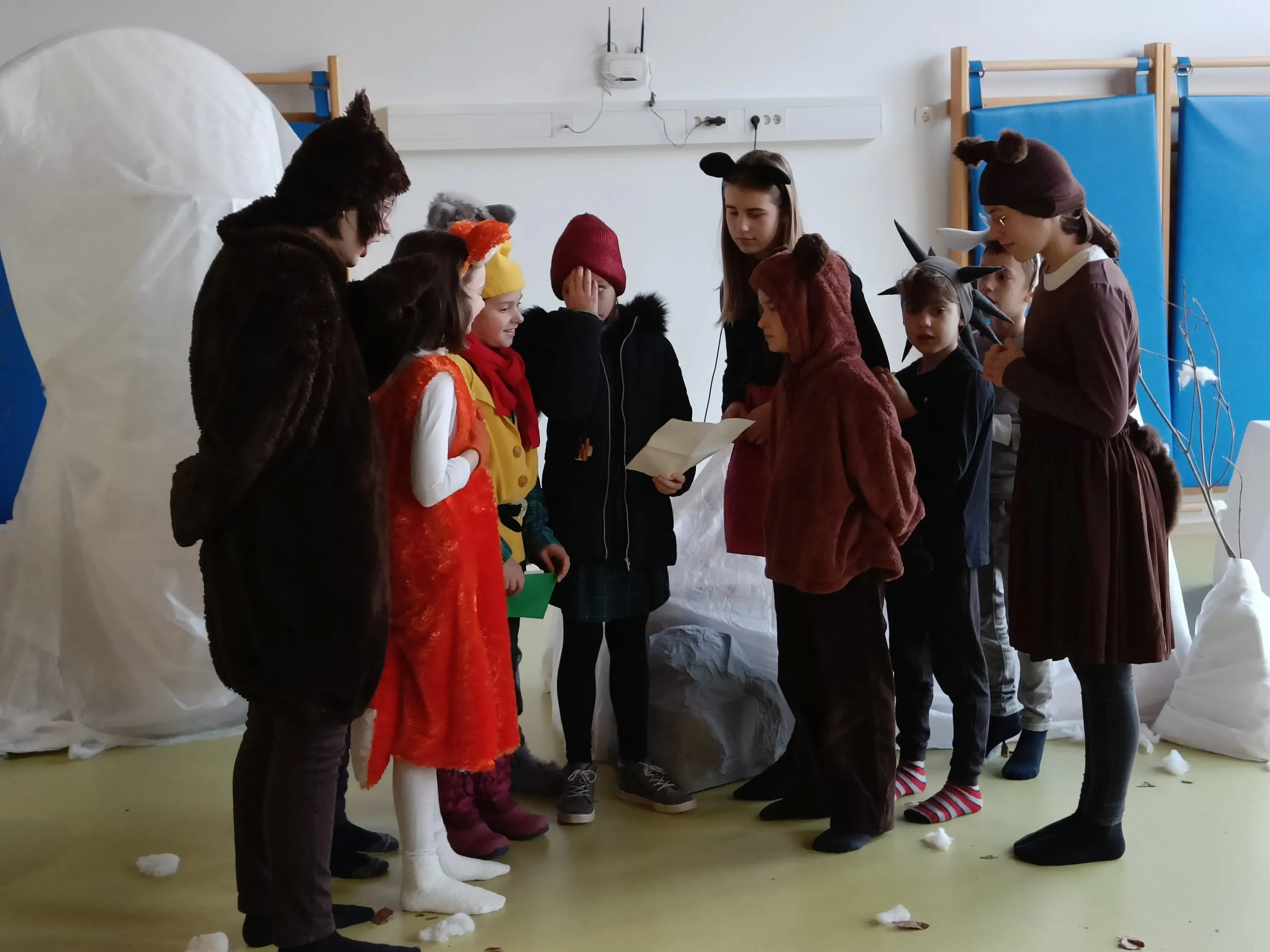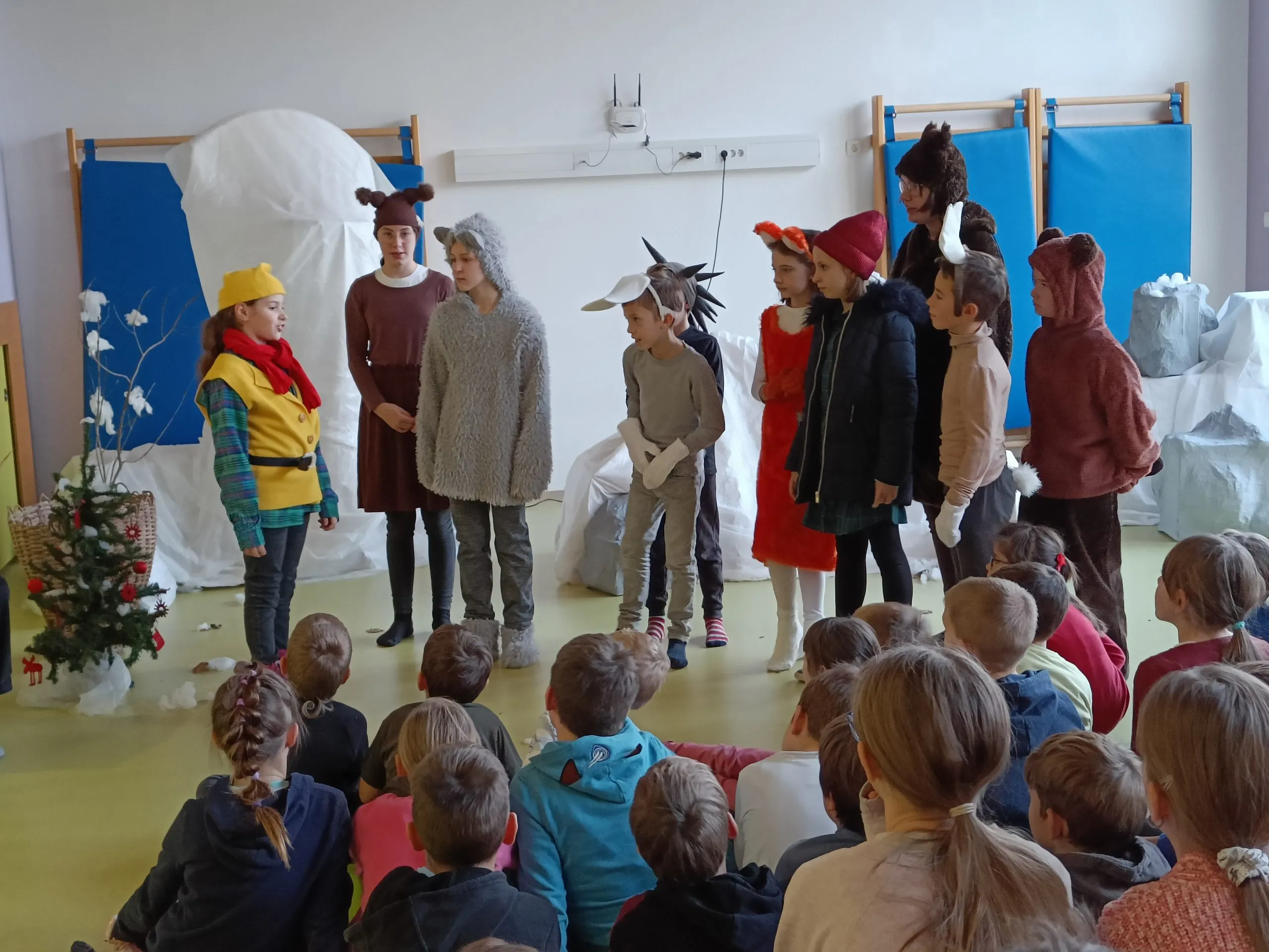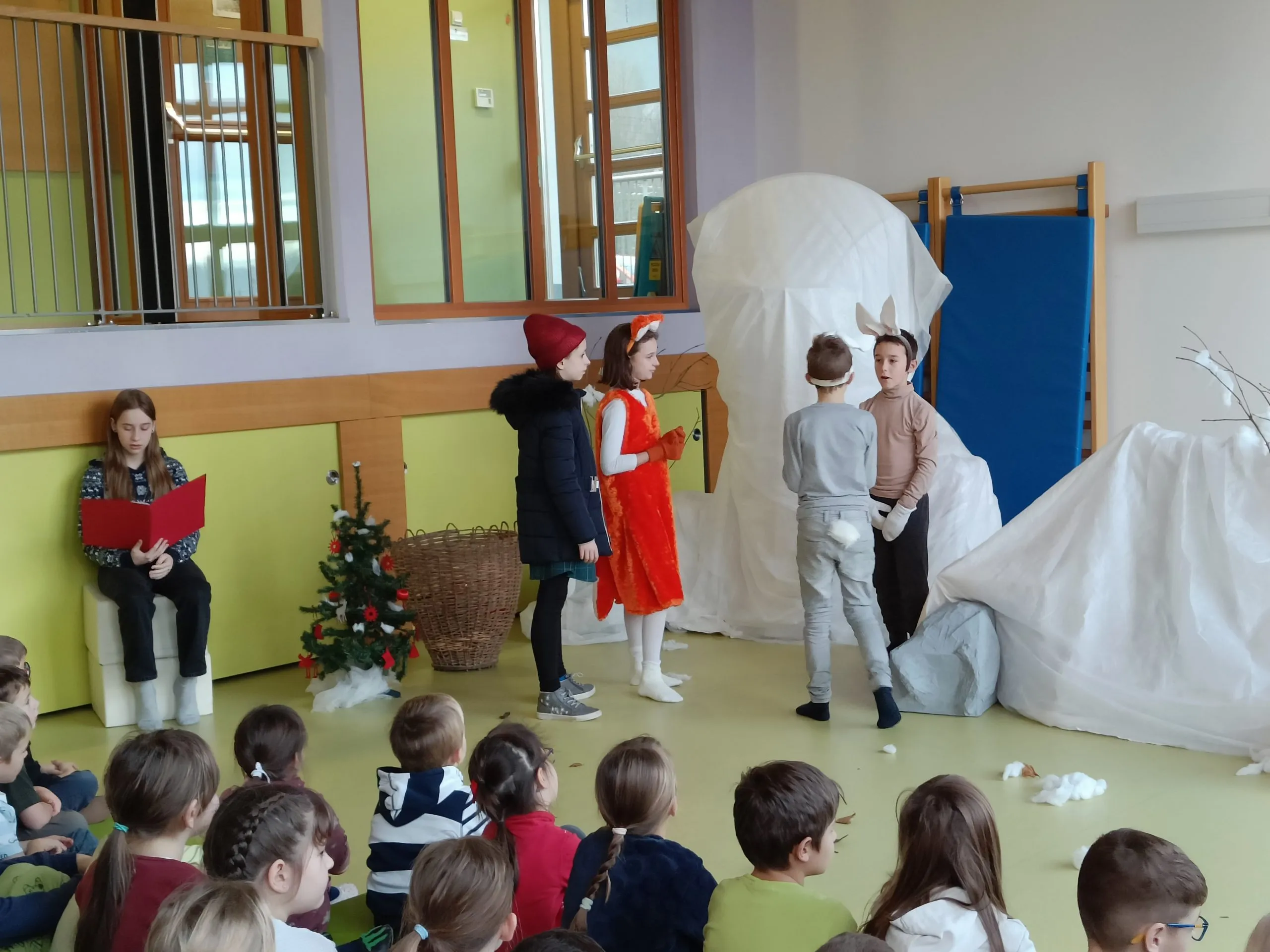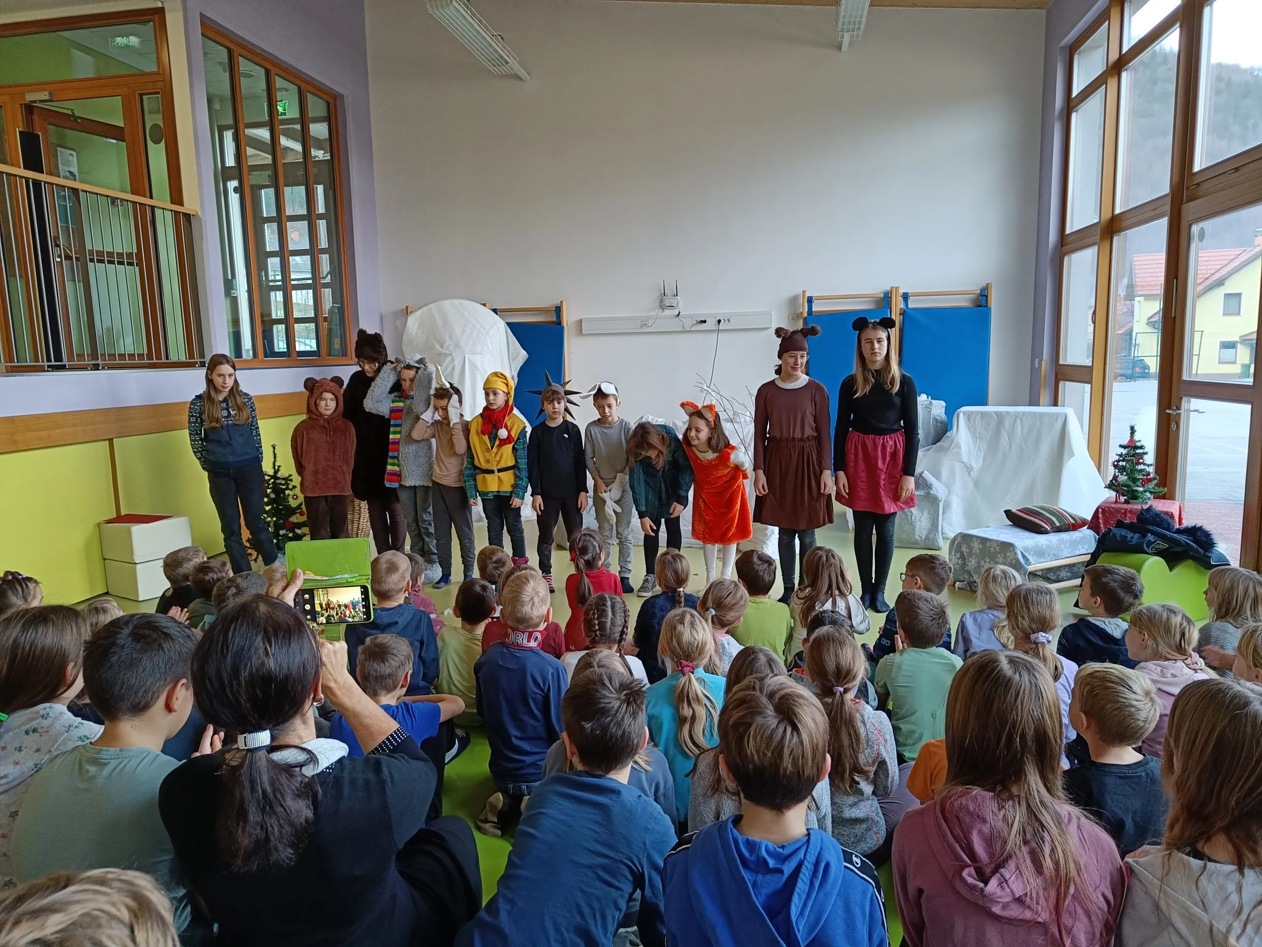 V četrtek, 14. 12. 2023, so nas zjutraj ob 8. uri v večnamenski dvorani vrtca obiskali člani Lutkovno gledališkega krožka OŠ Idrija. Predstavili so se s predstavo Snežka išče srečo. Igrico sta režirali mentorici Mira Rejec in Živa Caruzo. Živali, ki so nastopale v igrici so močno pritegnile poglede gledalcev-učencev od 1. do 5. razreda, ki so pol ure zbrano in doživeto spremljali predstavo. Živali so na koncu igrice dobile darilo od Dedka Mraza. Medveda sta dobila med, zajček korenček, veverica lešnike, darila pa so dobile tudi vse druge živali, ki so nastopale v igrici. Gospa Caruso je povedala, da z igrico nastopajo v okviru prireditev ZPM po vsej občini. Veseli so, da so tudi učencem naše šole z igrico polepšali današnji dan. Ob koncu predstave smo se nastopajočim in mentoricama zahvalili ter jim zaželeli vesele božične praznike in srečno novo leto 2024 ter nadaljnje uspešno delo.