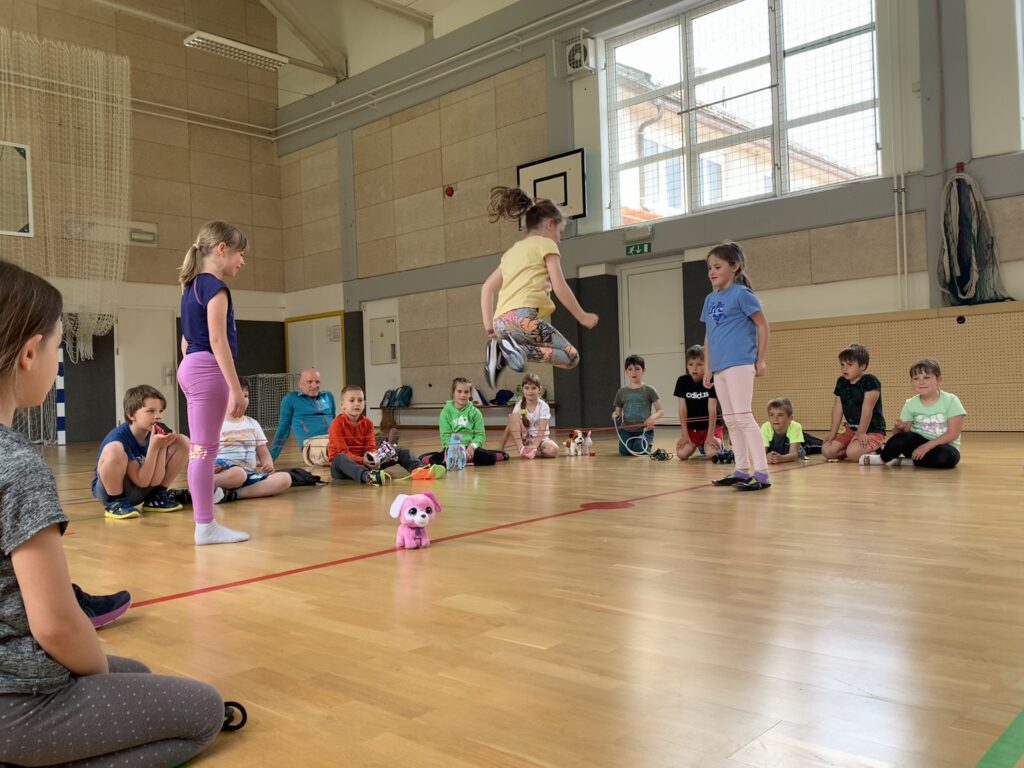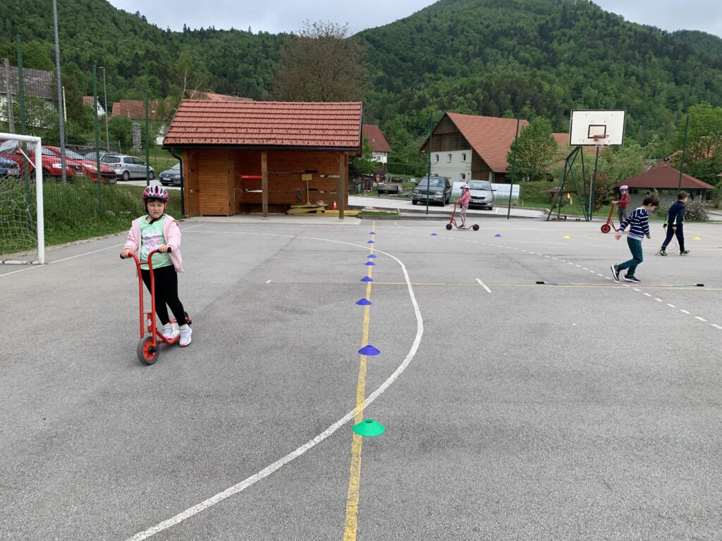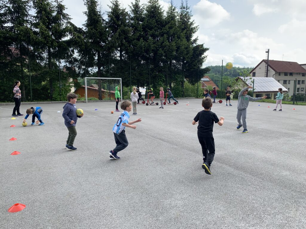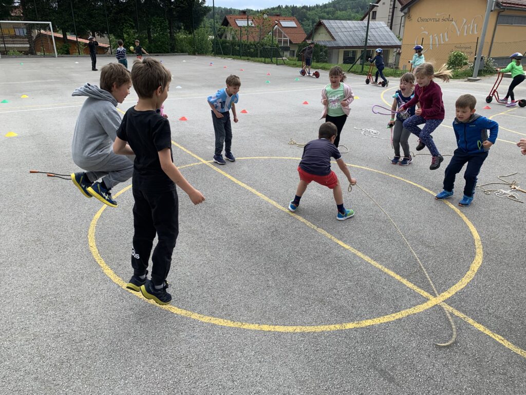 V telovadnici so igrali med dvema ognjema. Na igrišču so se vozili s skirojem, skakali s kolebnicami in se igrali z žogami.