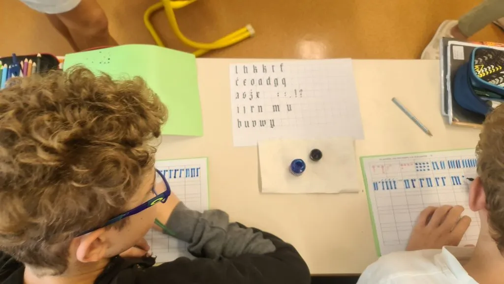 Kar nekaj devetošolcev se je med osnovnošolskim izobraževanjem že srečalo s kaligrafijo, zato nekaterim držanje pisala in pisanje umetelnih črk ni predstavljalo večjega izziva. Spet drugi so morali zavihati rokave, da so lahko napisali nekaj najlažjih črk (npr. i, r, n). Spretnejši so napisali tudi kakšno besedo ali svoje ime. Ob koncu je učiteljica vse učence prijazno povabila h krožku in se zahvalila za možnost, da je smela predstaviti tudi ta del umetnosti.