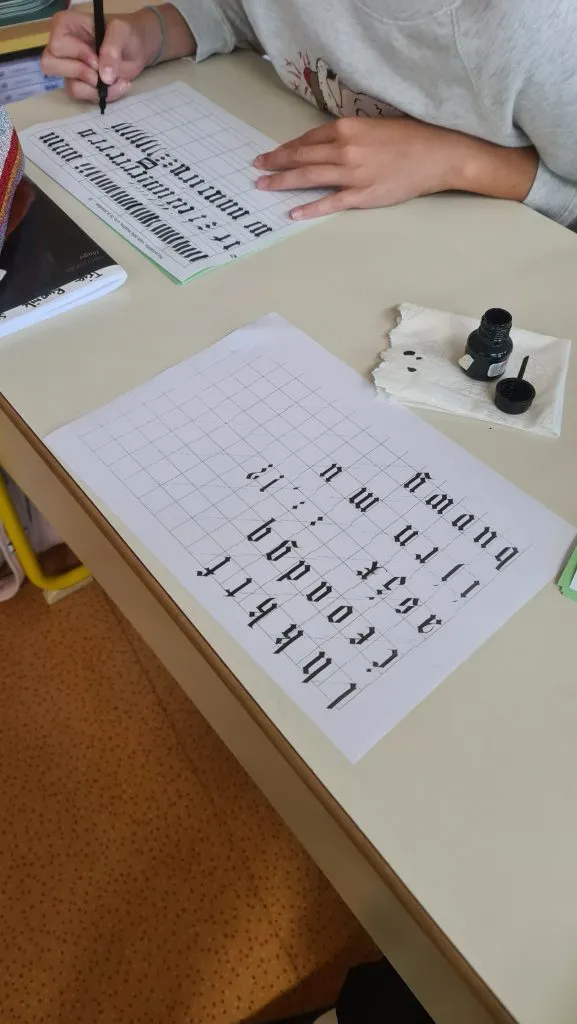 Vse omenjeno spoznavajo učenci v 9. razredu. Snov je za marsikoga težka in nezanimiva, zato je padla ideja, da bi uro slovenščine združili s krožkom kaligrafije (gr. kalos pomeni lepo in gr. graphein pisanje, zato predstavlja kaligrafija zvrst ali umetnost lepega pisanja), kjer bi se učenci spoznali z osnovami pisanja gotice in s tem mogoče koga navdušili za branje starejših besedil. Ga. Petkovšek je priskrbela kaligrafska peresa za vse učence, pripravila abecedo v gotski pisavi in učencem pokazala nekaj fotografij več stoletij starih besedil.