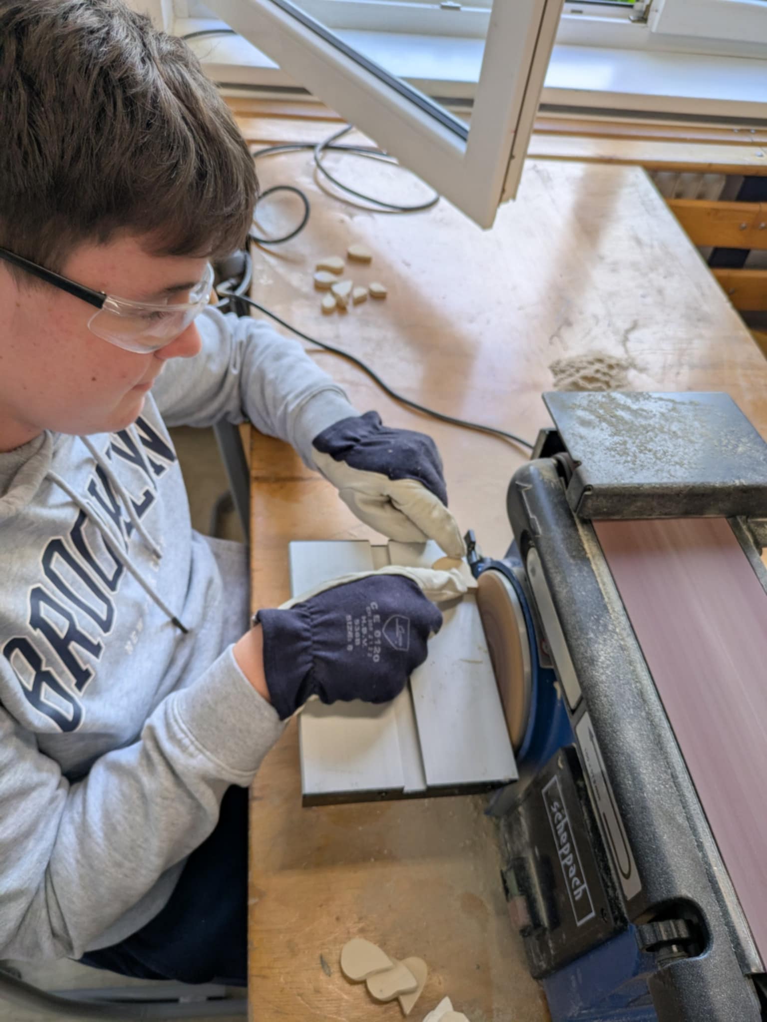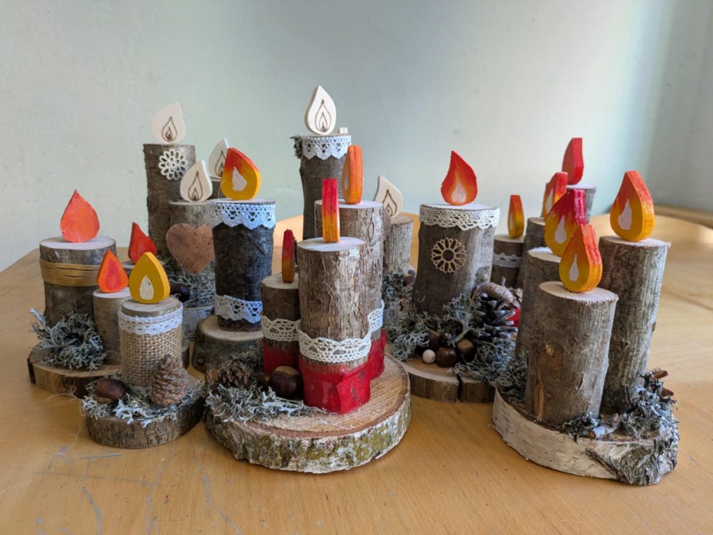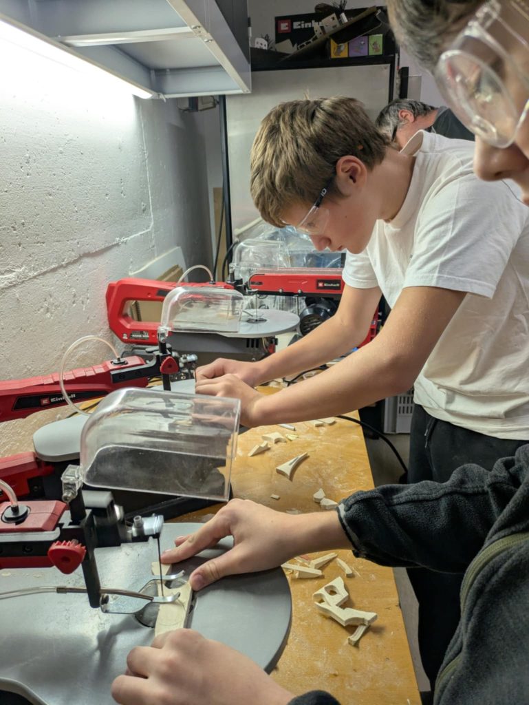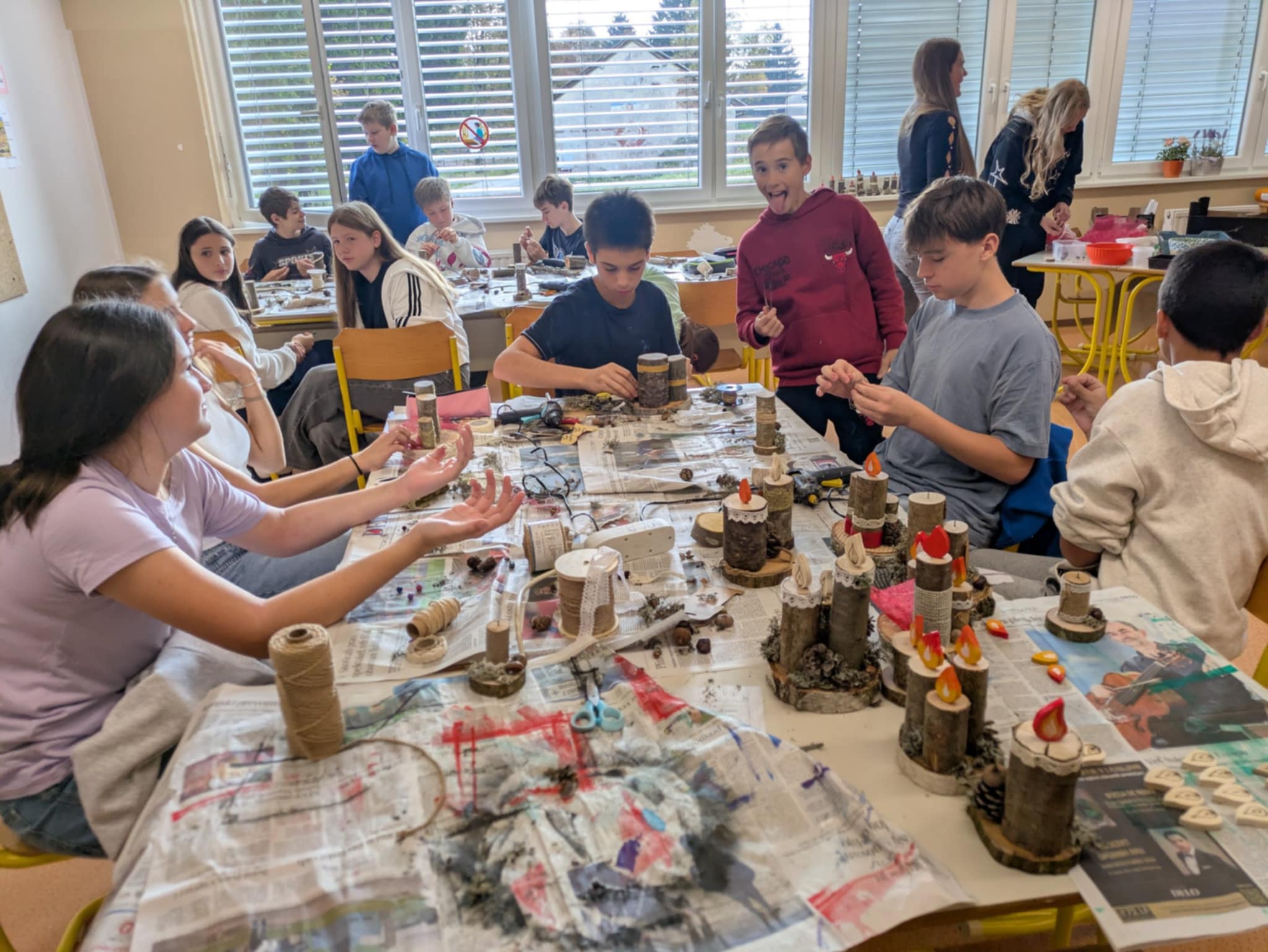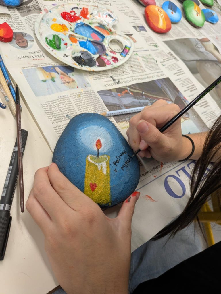 Osmošolci in devetošolci so v ponedeljek, 13. 10. 2025, zavihali rokave in na tehniškem dnevu so nastajali nagrobni aranžmaji iz naravnih materialov. V tehniški učilnici so zabrnele žage, brusilnik in vrtalnik in izpod rok spretnih fantov so nastajali lepo oblikovani plamenčki, ki so jih druge roke poslikale ali pa vžigale s pirografom. Plamenčki so bili pika na i aranžmajem iz lesa, čipk in različnega rastja in plodov, nabranega v naravi. Skupina deklet pa je v roke vzela čopiče in nastale so čudovite poslikave prodnikov, ki bodo krasili grobove ob prihajajočih praznikih.
