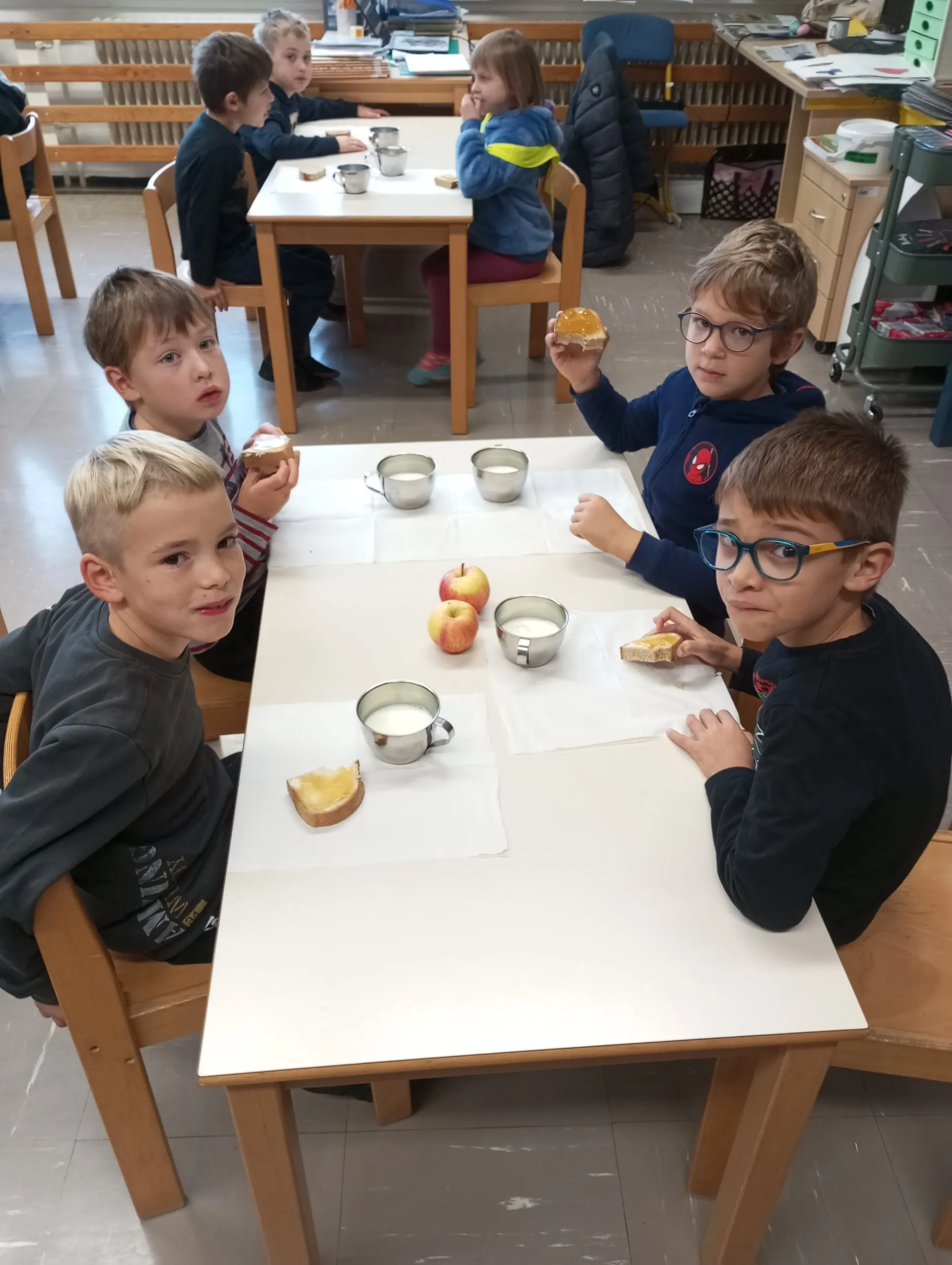 Zajtrk je obrok, ki doma povezuje družino, v šolskem okolju pa lahko povezuje učence različnih starosti. Prvošolci in drugošolci so se pri pripravi na tradicionalni slovenski zajtrk združili že v sredo in si skupaj ogledali posnetke Ribiča Pepeta, ki predstavi sestavo in tradicionalne sestavine zajtrka.