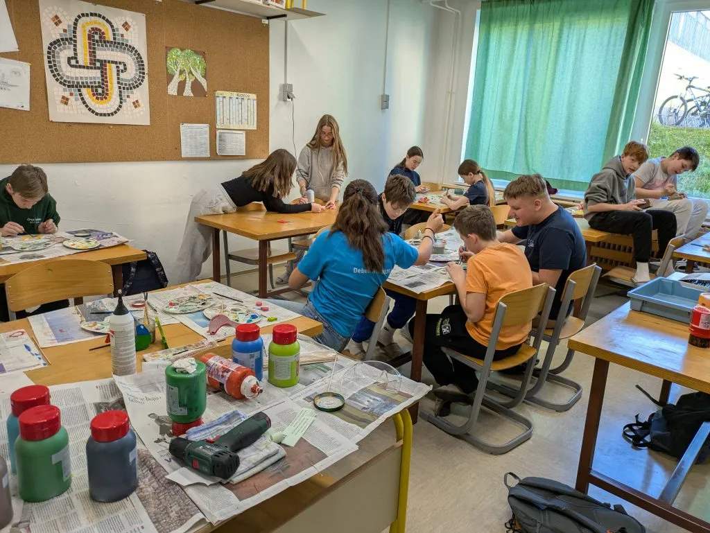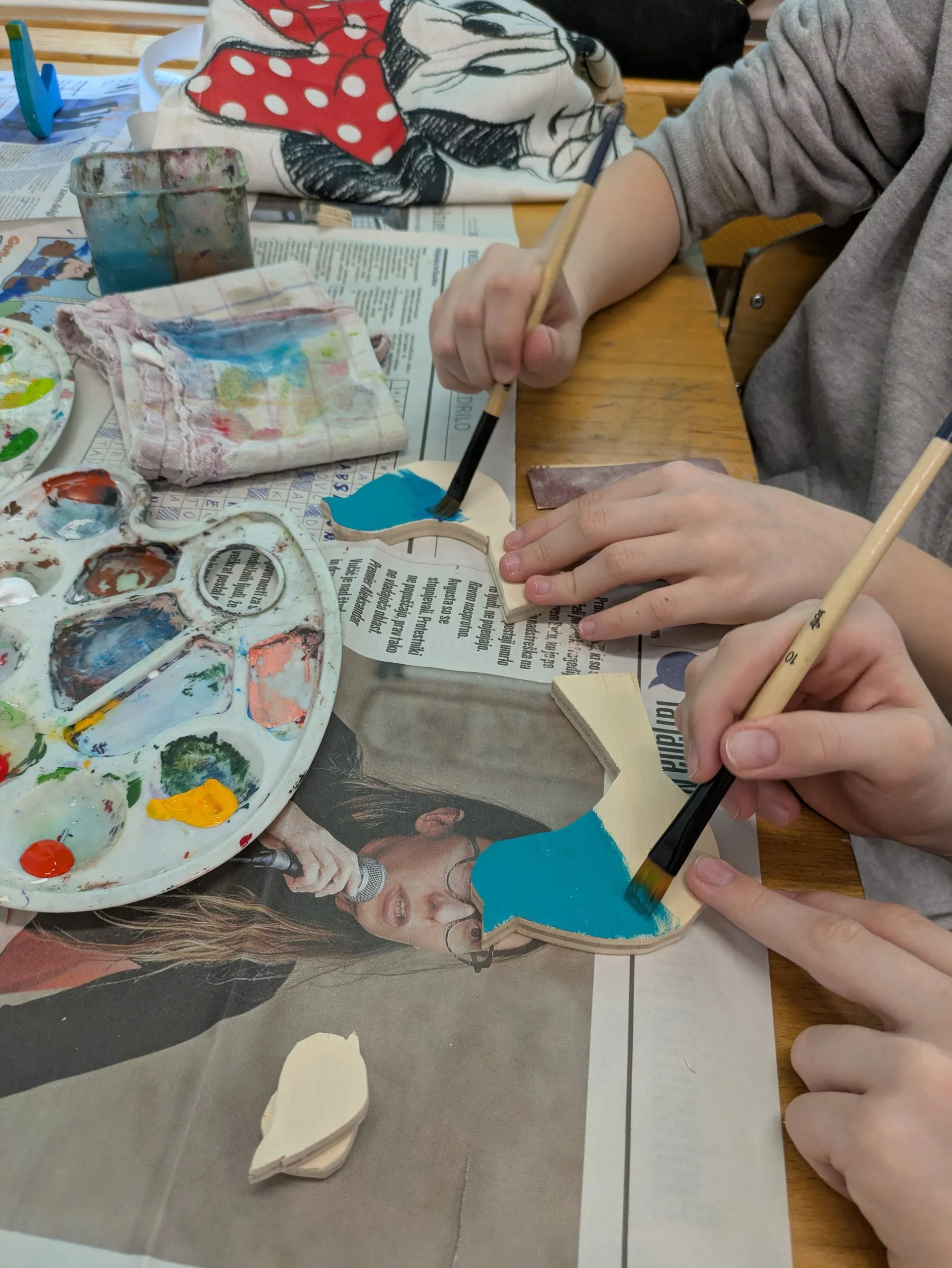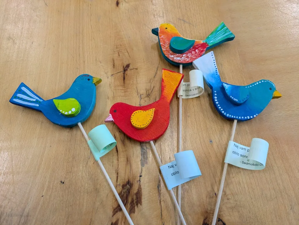 V šolski delavnici so sedmošolci v sklopu tehničnega dne najprej celotno torkovo dopoldne preživeli ob pogovoru o prostovoljstvu in izdelavi drobnih pozornosti za starejše občane Črnega Vrha. Iz lesenih plošč so izžagali ptice, jih skrbno obrusili in po lastnem navdihu živopisano poslikali. Ptice na paličici so na koncu dobile še prijazno sporočilce.