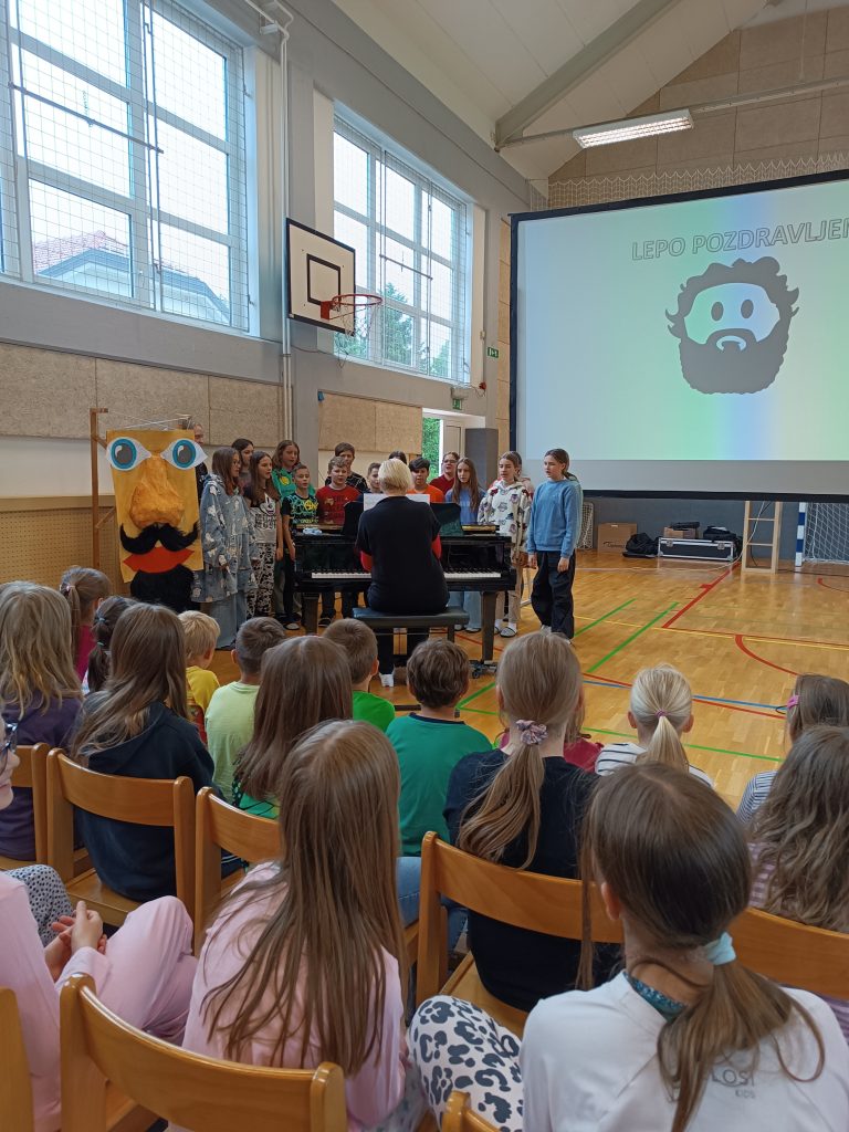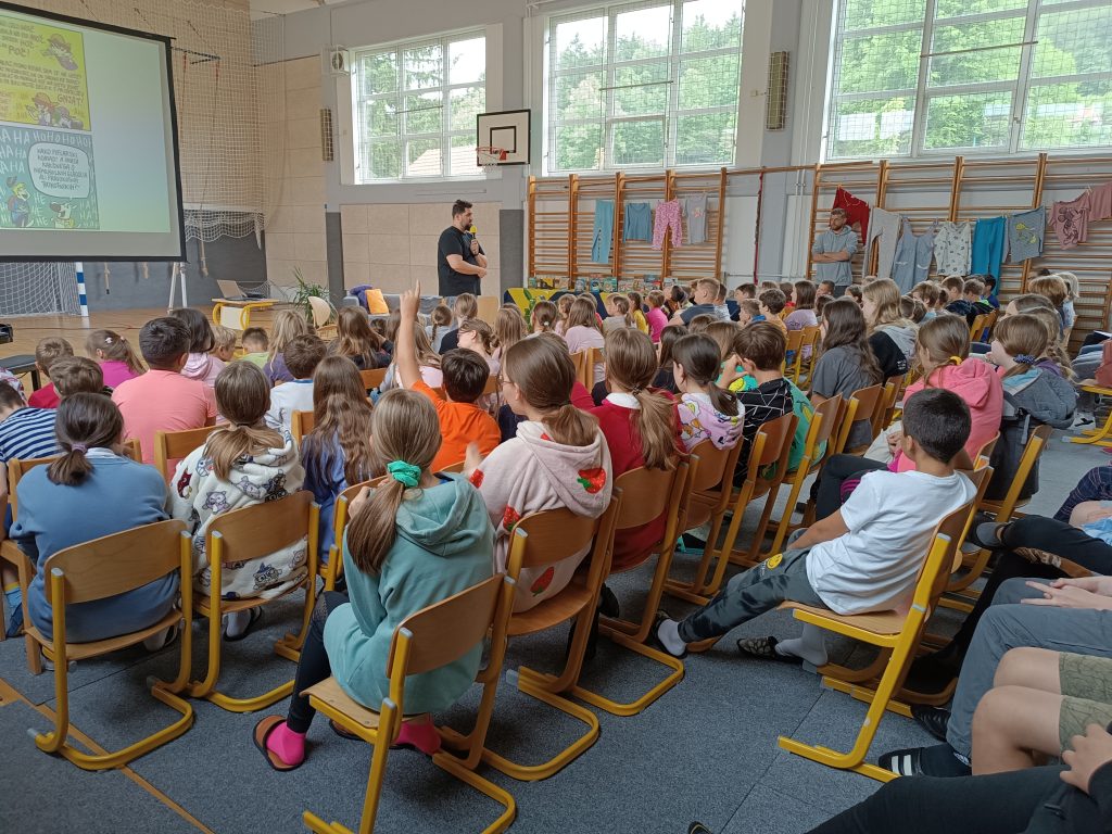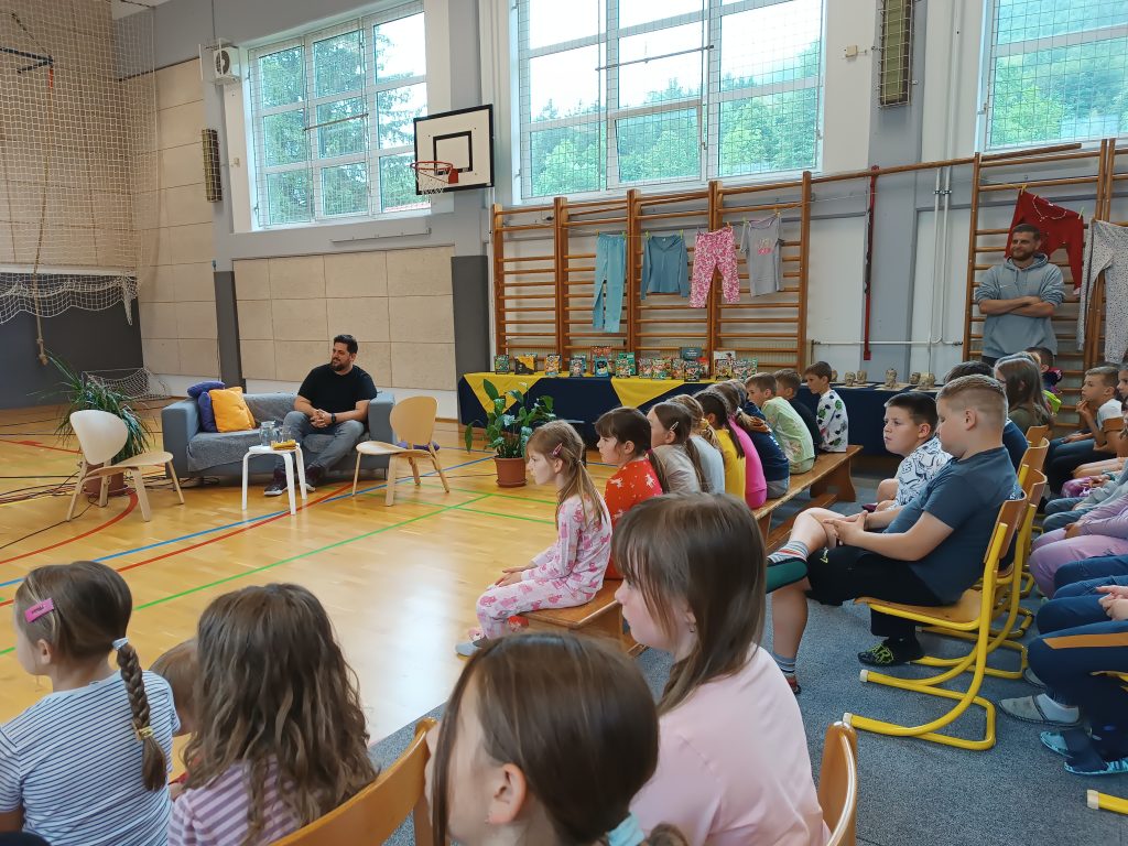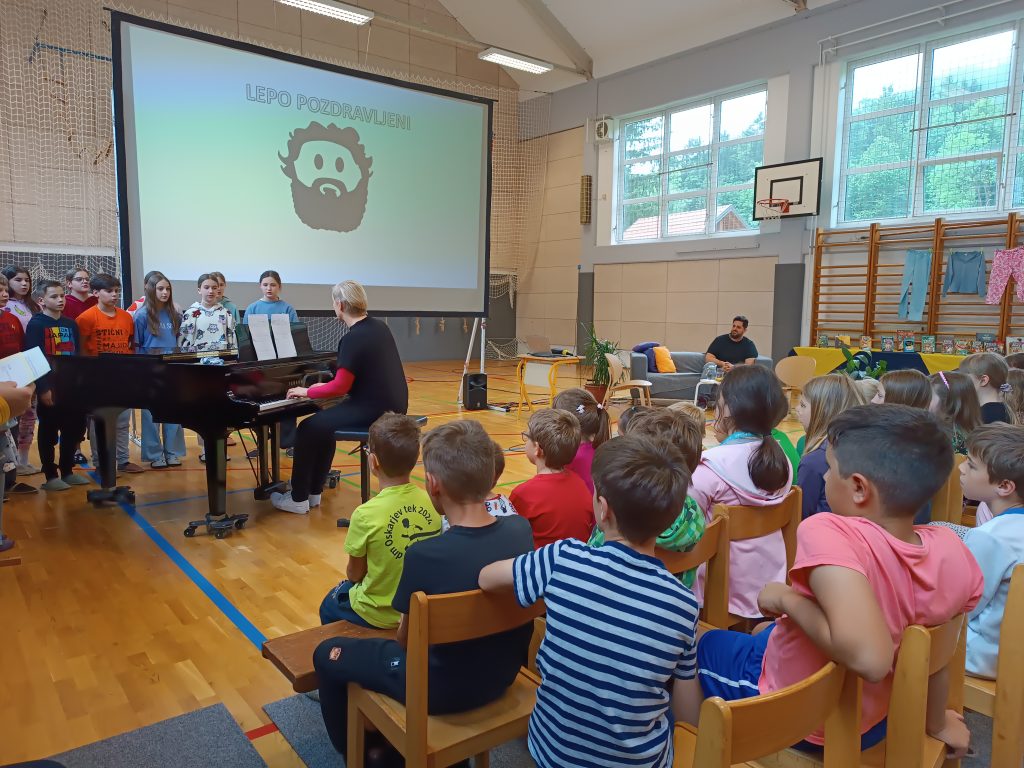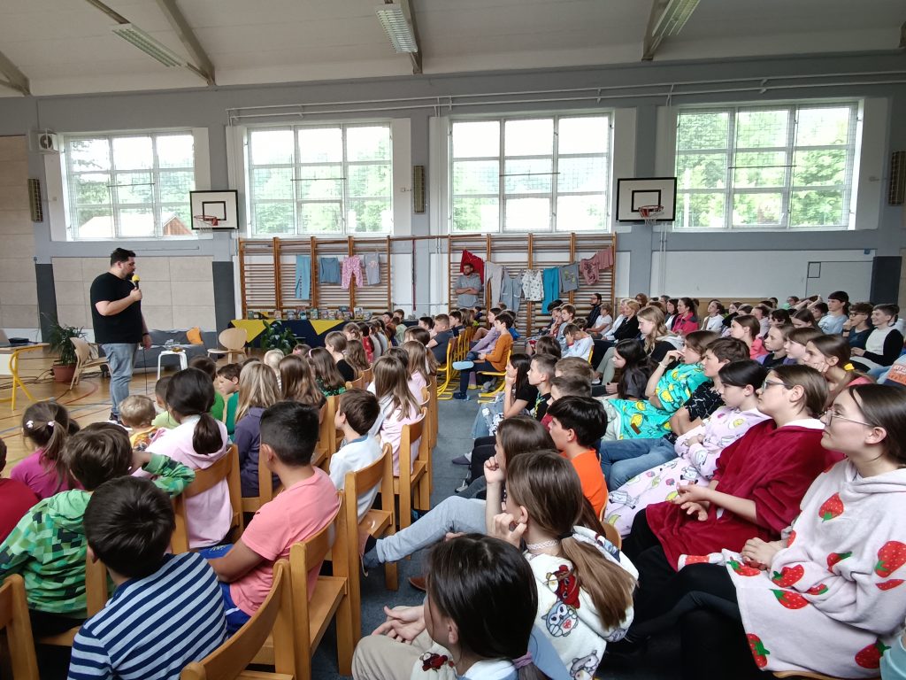 V dopoldanskem času je bil za 6. in 7. razred na sporedu še zadnji kulturni dan. Razdeljeni so bili v tri skupine, vsaka se je na svoj način spoznavala z umetnostjo. 4. šolsko uro so se omenjenim pridružili še vsi ostali razredi in ura smeha in zabave se je lahko pričela. V »pižamasti« kulisi, ki so jo pripravili šesto- in sedmošolci, nas je pisatelj neizmerno zabaval in se šalil tako na svoj račun kot tudi na račun priznanih slovenskih piscev. Izvedeli smo, katere tri vrste brad rastejo očetom, kako Zdravljico zapisati z emojiji oz. s tako imenovanimi smejkoti in na kaj vse mora pomisliti, ko prevaja Pilkeyjeve stripe v slovenščino. Na koncu je pisatelj podaril priznanja in cvet še mamam bralkam, ki so letos sodelovale pri projektu Bralna značka za starše, in učencem delil čisto poseben avtogram – odtis štampiljke. Najpogumnejši so se z njim tudi fotografirali.