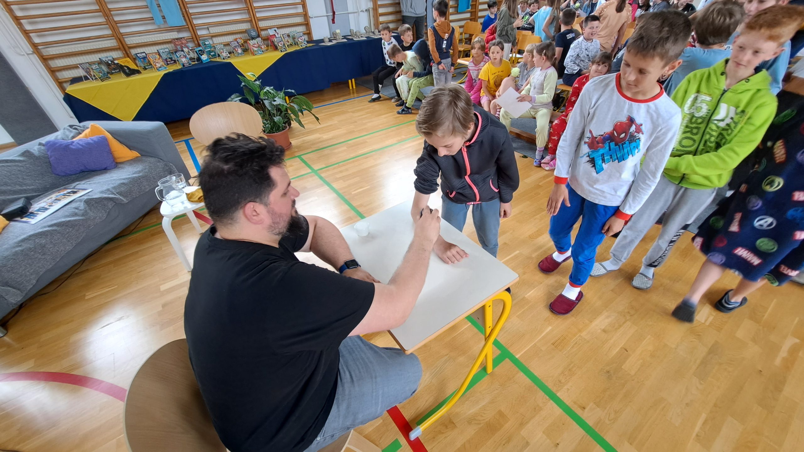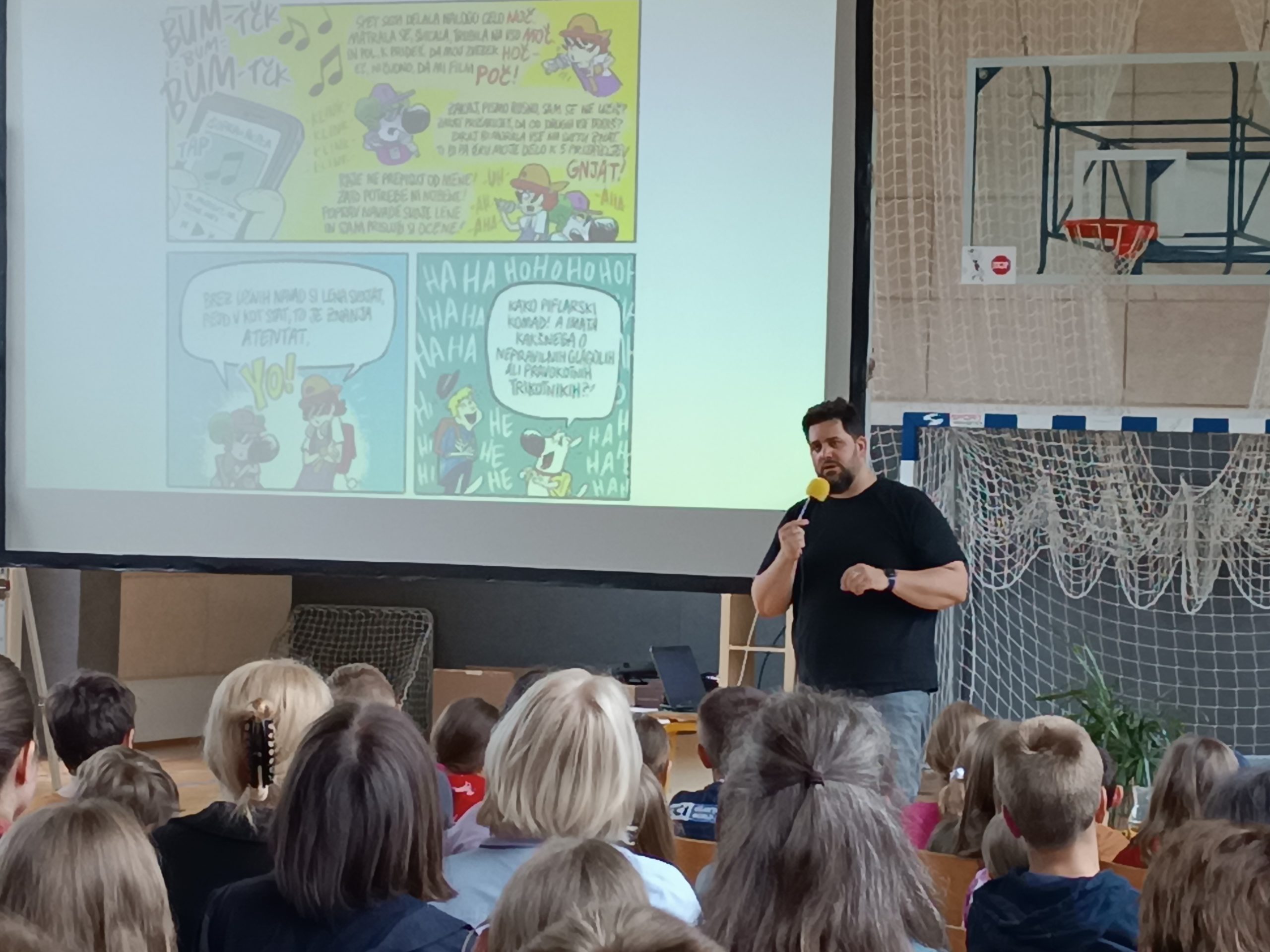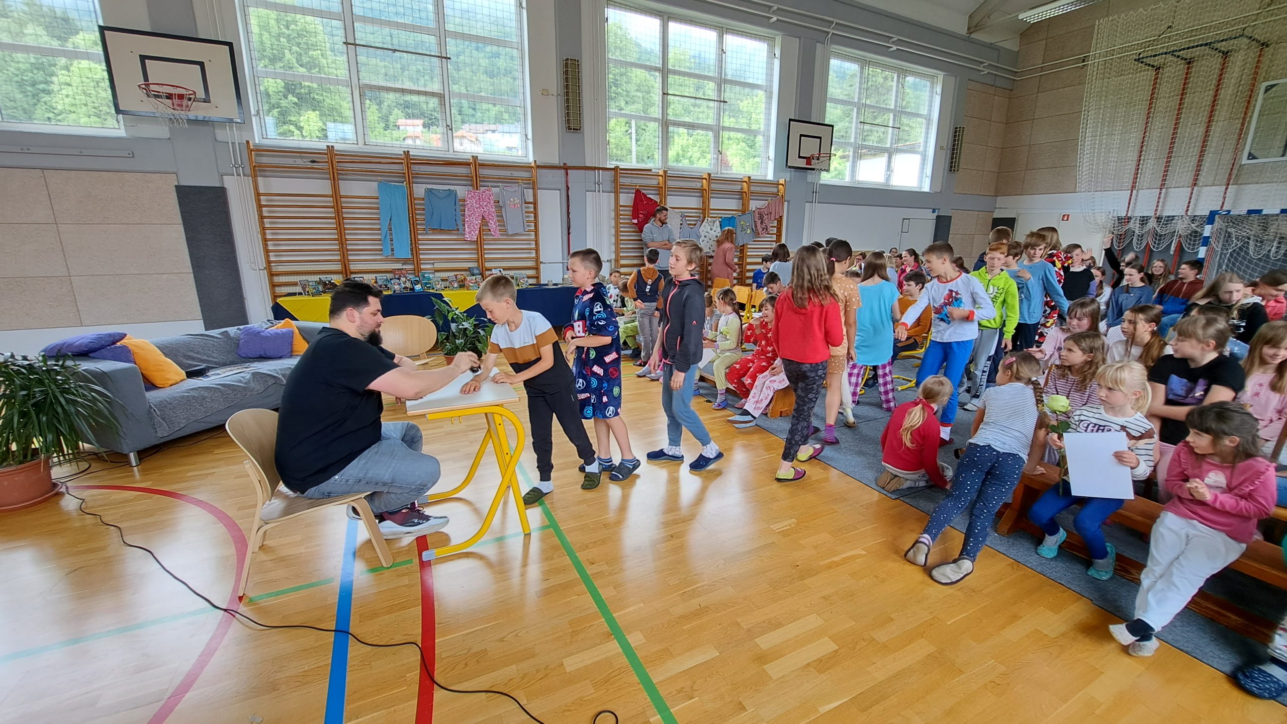 V dopoldanskem času je bil za 6. in 7. razred na sporedu še zadnji kulturni dan. Razdeljeni so bili v tri skupine, vsaka se je na svoj način spoznavala z umetnostjo. 4. šolsko uro so se omenjenim pridružili še vsi ostali razredi in ura smeha in zabave se je lahko pričela. V »pižamasti« kulisi, ki so jo pripravili šesto- in sedmošolci, nas je pisatelj neizmerno zabaval in se šalil tako na svoj račun kot tudi na račun priznanih slovenskih piscev. Izvedeli smo, katere tri vrste brad rastejo očetom, kako Zdravljico zapisati z emojiji oz. s tako imenovanimi smejkoti in na kaj vse mora pomisliti, ko prevaja Pilkeyjeve stripe v slovenščino. Na koncu je pisatelj podaril priznanja in cvet še mamam bralkam, ki so letos sodelovale pri projektu Bralna značka za starše, in učencem delil čisto poseben avtogram – odtis štampiljke. Najpogumnejši so se z njim tudi fotografirali.