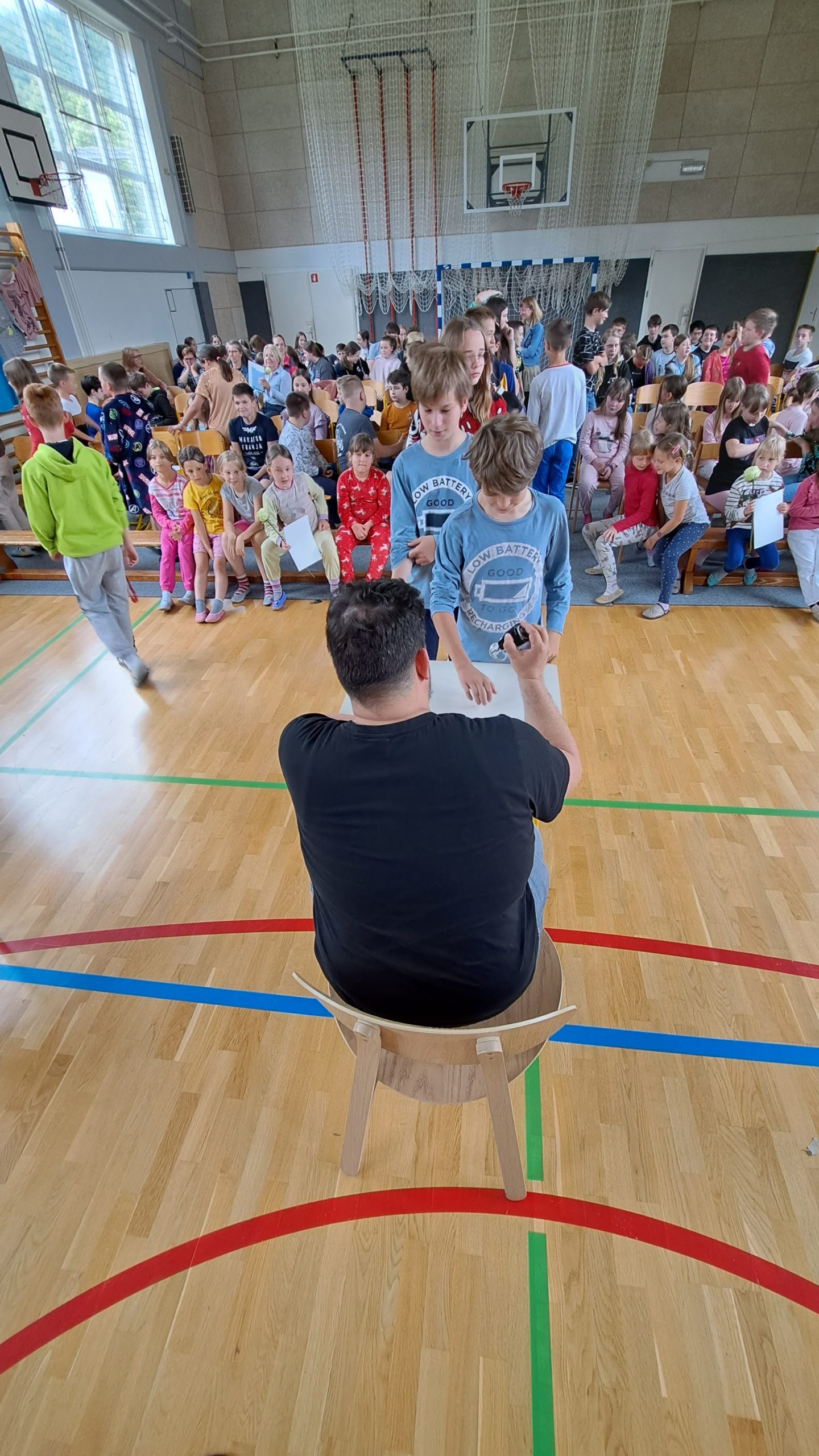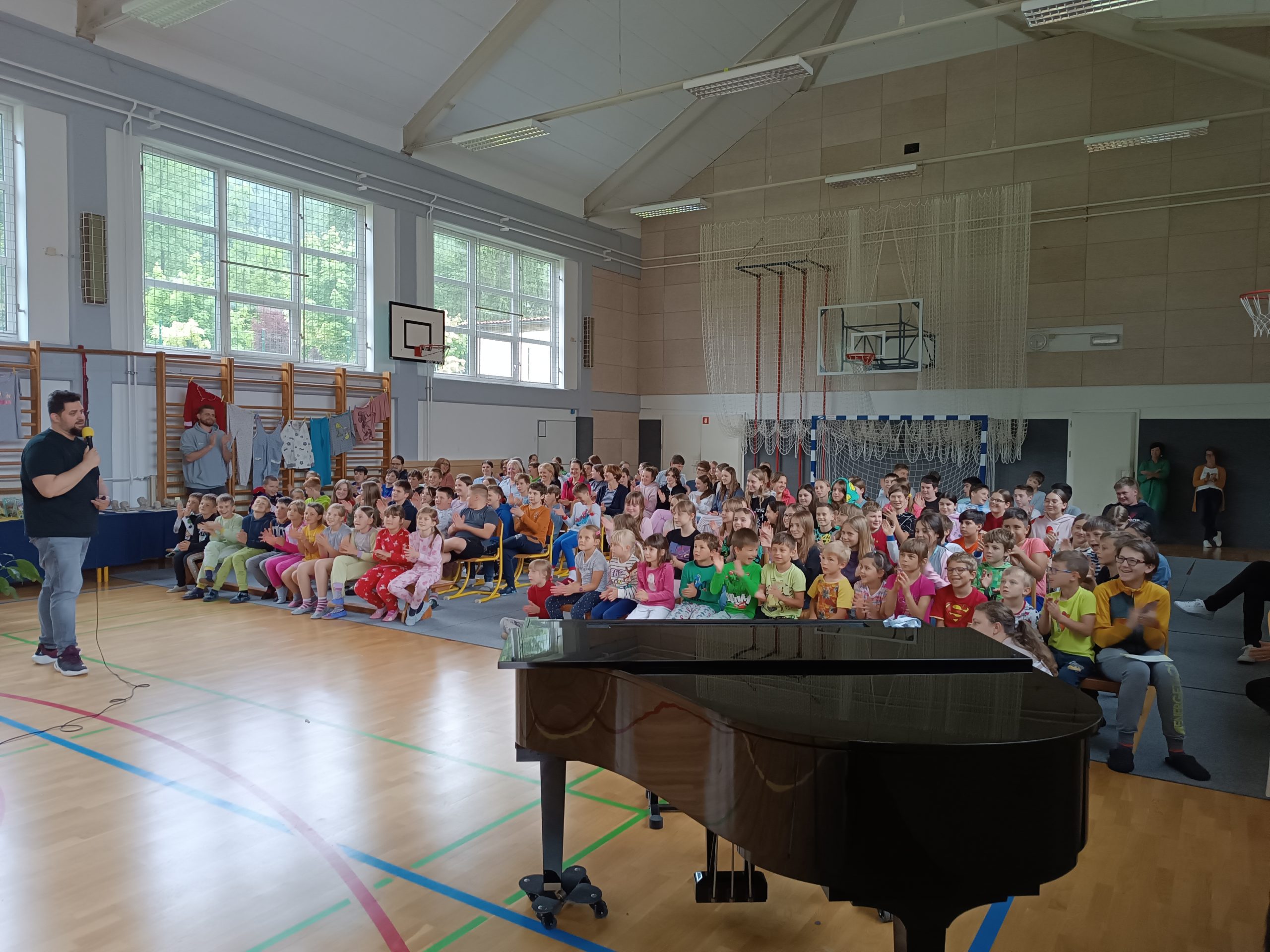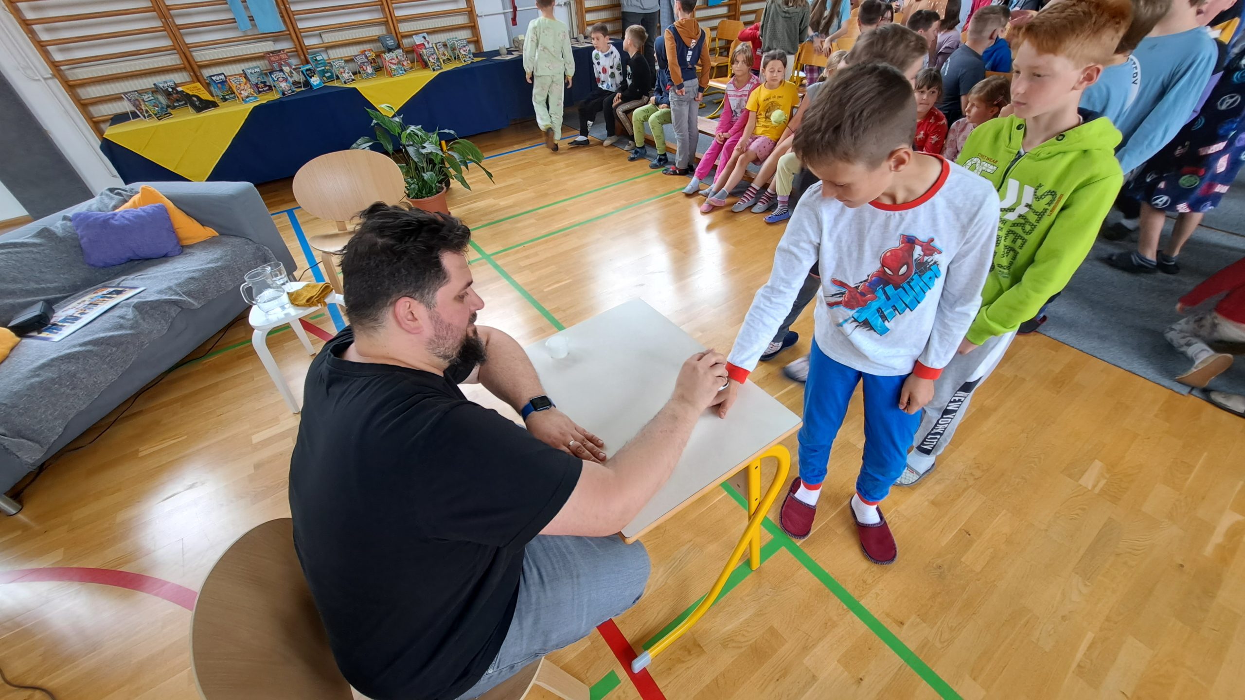 V dopoldanskem času je bil za 6. in 7. razred na sporedu še zadnji kulturni dan. Razdeljeni so bili v tri skupine, vsaka se je na svoj način spoznavala z umetnostjo. 4. šolsko uro so se omenjenim pridružili še vsi ostali razredi in ura smeha in zabave se je lahko pričela. V »pižamasti« kulisi, ki so jo pripravili šesto- in sedmošolci, nas je pisatelj neizmerno zabaval in se šalil tako na svoj račun kot tudi na račun priznanih slovenskih piscev. Izvedeli smo, katere tri vrste brad rastejo očetom, kako Zdravljico zapisati z emojiji oz. s tako imenovanimi smejkoti in na kaj vse mora pomisliti, ko prevaja Pilkeyjeve stripe v slovenščino. Na koncu je pisatelj podaril priznanja in cvet še mamam bralkam, ki so letos sodelovale pri projektu Bralna značka za starše, in učencem delil čisto poseben avtogram – odtis štampiljke. Najpogumnejši so se z njim tudi fotografirali.
