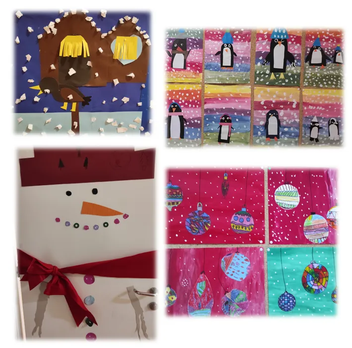 Mesec december se preveša v drugo polovico. Zjutraj nas ob vstopu v šolo pozdravita naši smrečici, tista prava, pod katero si je dom našel jelenček, in lesena, vsa v lučkah. S prvim snegom je zadišalo po zimi. V našo šolo so se naselili jelenčki in snežaki. Različni klekljani okraski učencev čipkarske šole nam sporočajo, da so pred vrati prazniki in počitniški dnevi. Motivi pri likovnem ustvarjanju so praznično zimski: pisani balončki, snežaki, ptičje hišice pozimi in veseli pingvini. Majhne skodelice, izdelane po motivu znane slike Kofetarica Ivane Kobilice, kličejo k srkanju tople kave. Prijetno nam je.