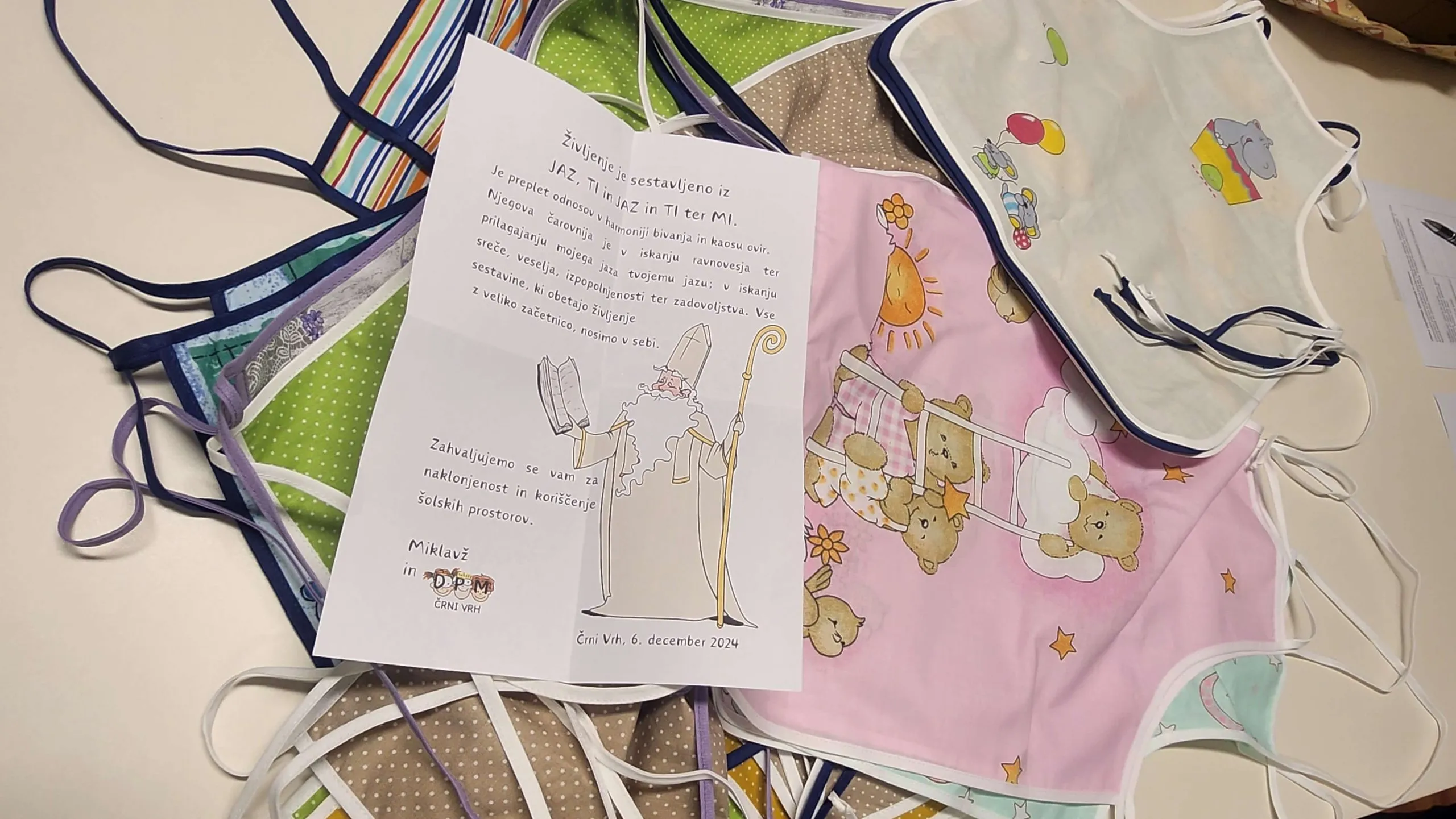 V zbornici je Miklavž pustil darilo, v katerem je bilo dvajset čudovitih predpasnikov, deset manjšin in deset večjih. Miklavž ve, da se v šoli tudi kuha in peče. Hvala, Miklavž.