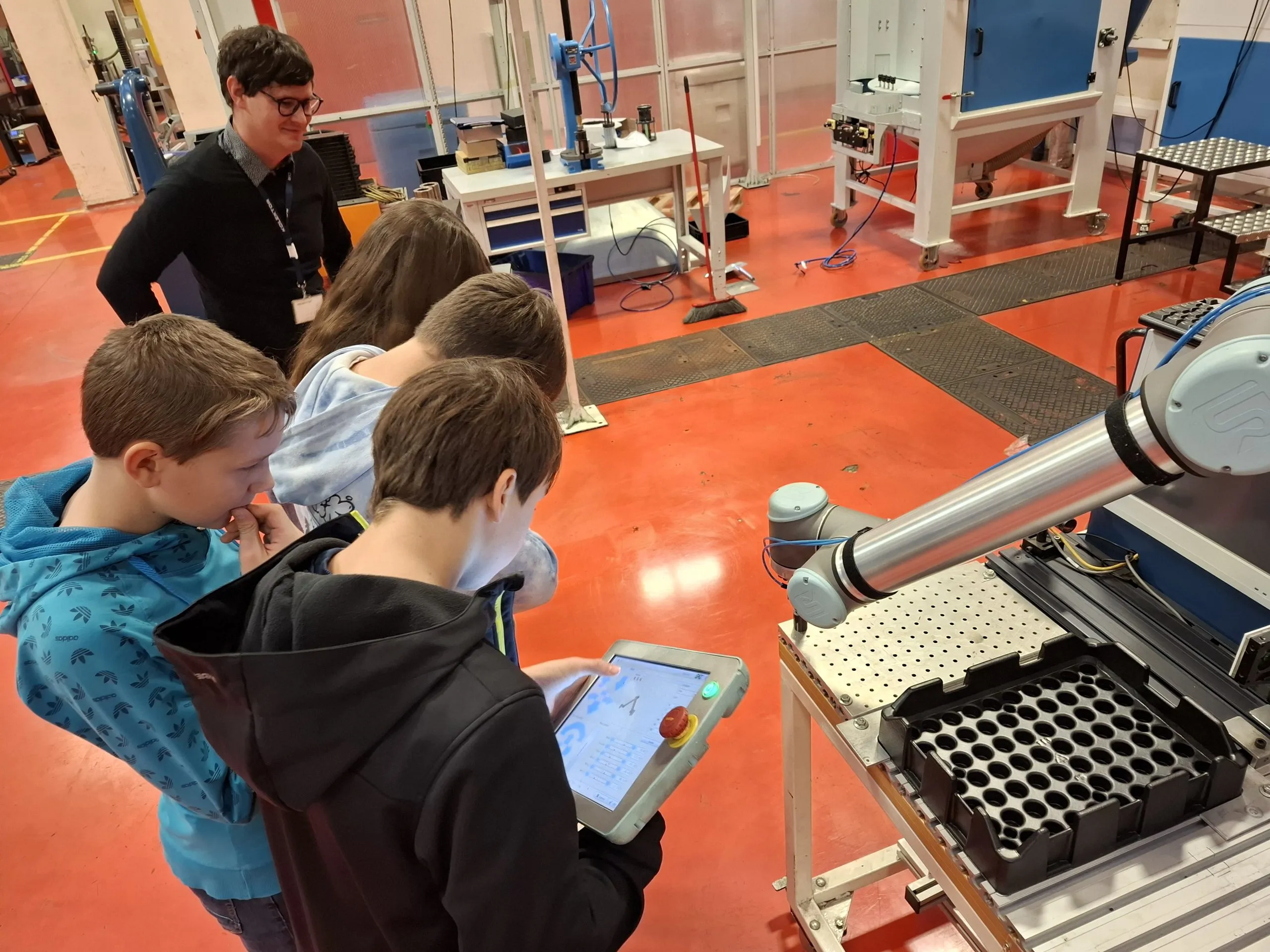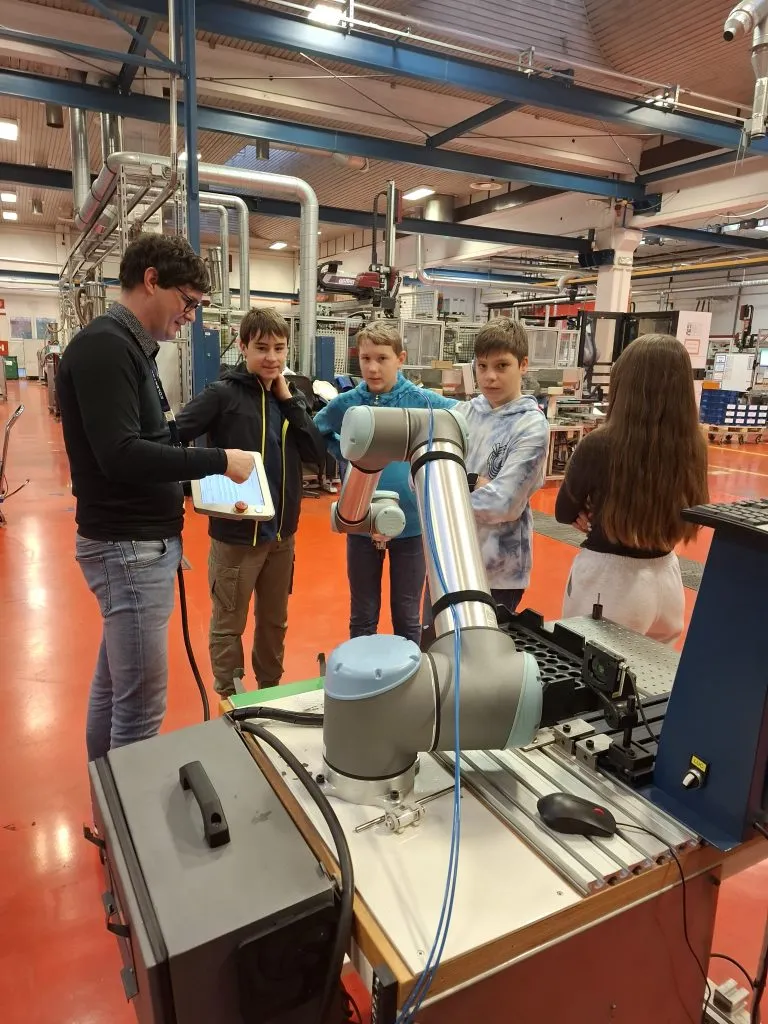 Gospoda Matej Jurman in Sašo Ličen sta nas popeljala skozi proizvodnjo in nam predstavila njihovo delo in različne vrste robotov. Prijetno smo bili presenečeni, ko smo dobili priložnost, da sprogramiramo enega od kooperativnih robotov, ki je po našem programu opravil svojo nalogo.