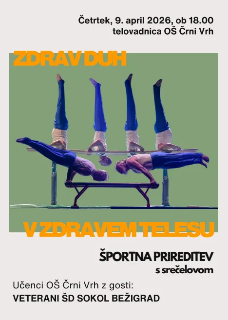 Vljudno vabljeni na športno prireditev ZDRAV DUH V ZDRAVEM TELESU, ki bo v četrtek, 9. aprila 2026, ob 18.00 v telovadnici OŠ Črni Vrh.