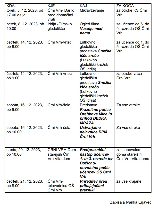 Program prireditev v Krajevni skupnosti Črni Vrh