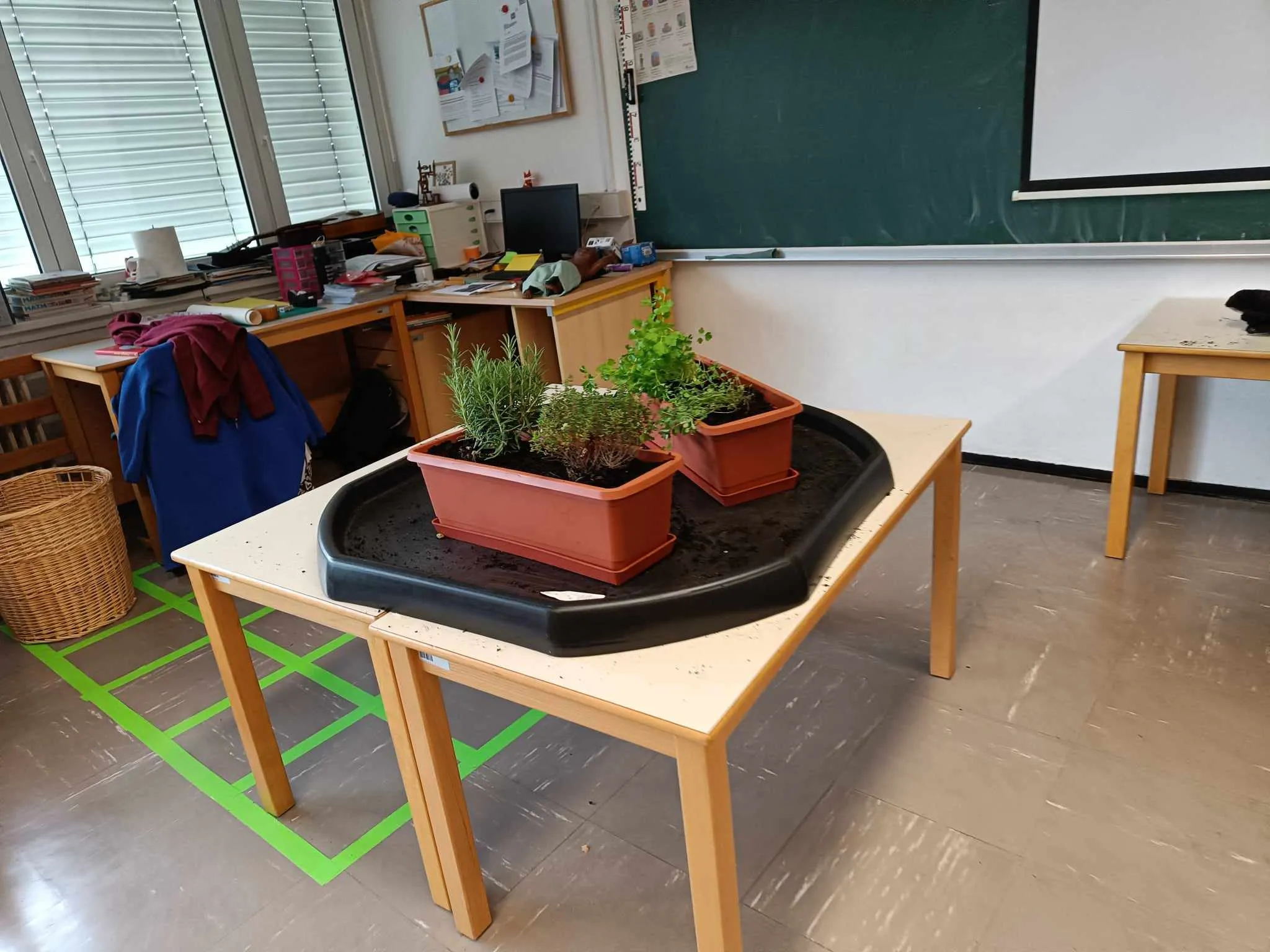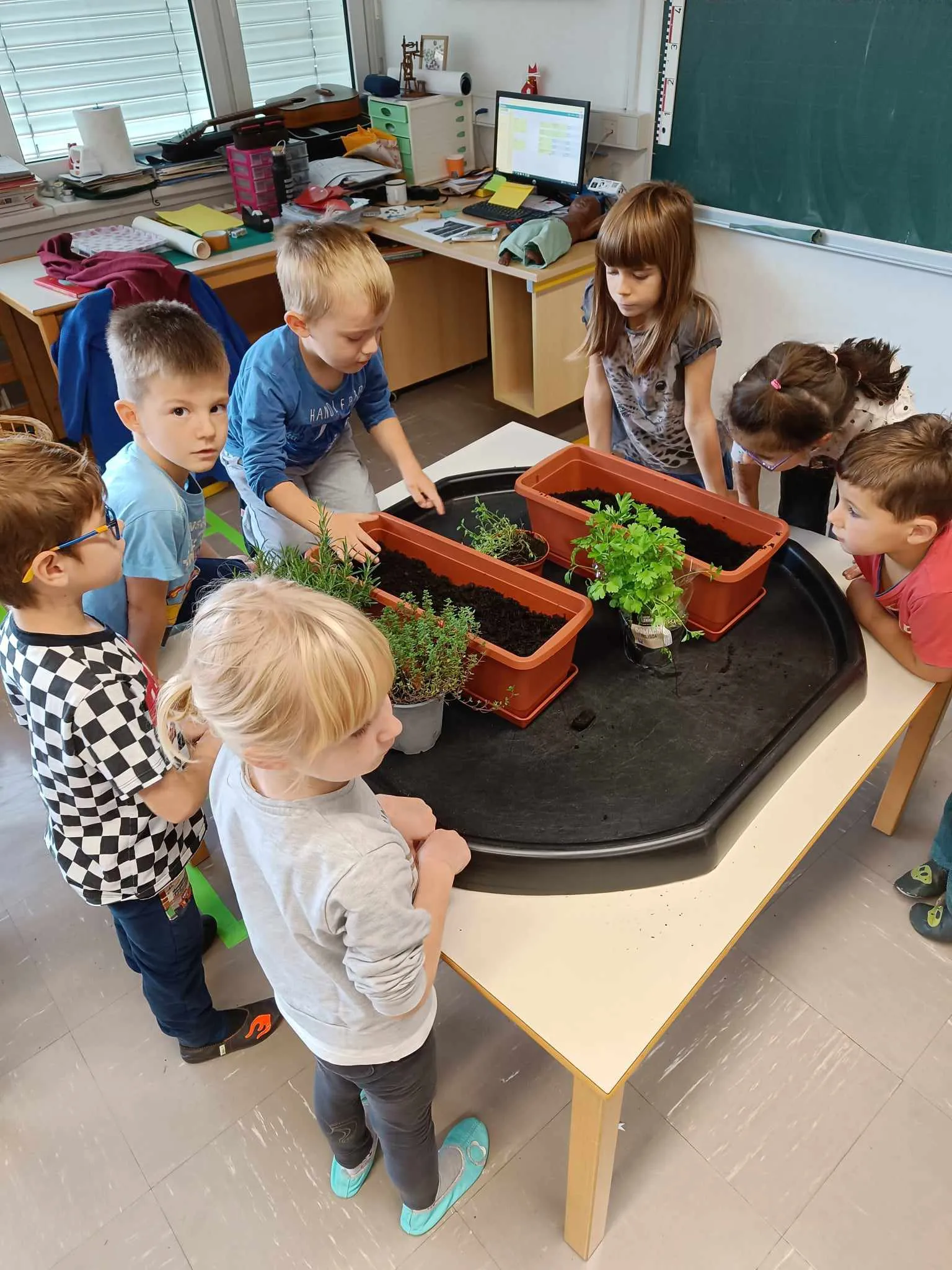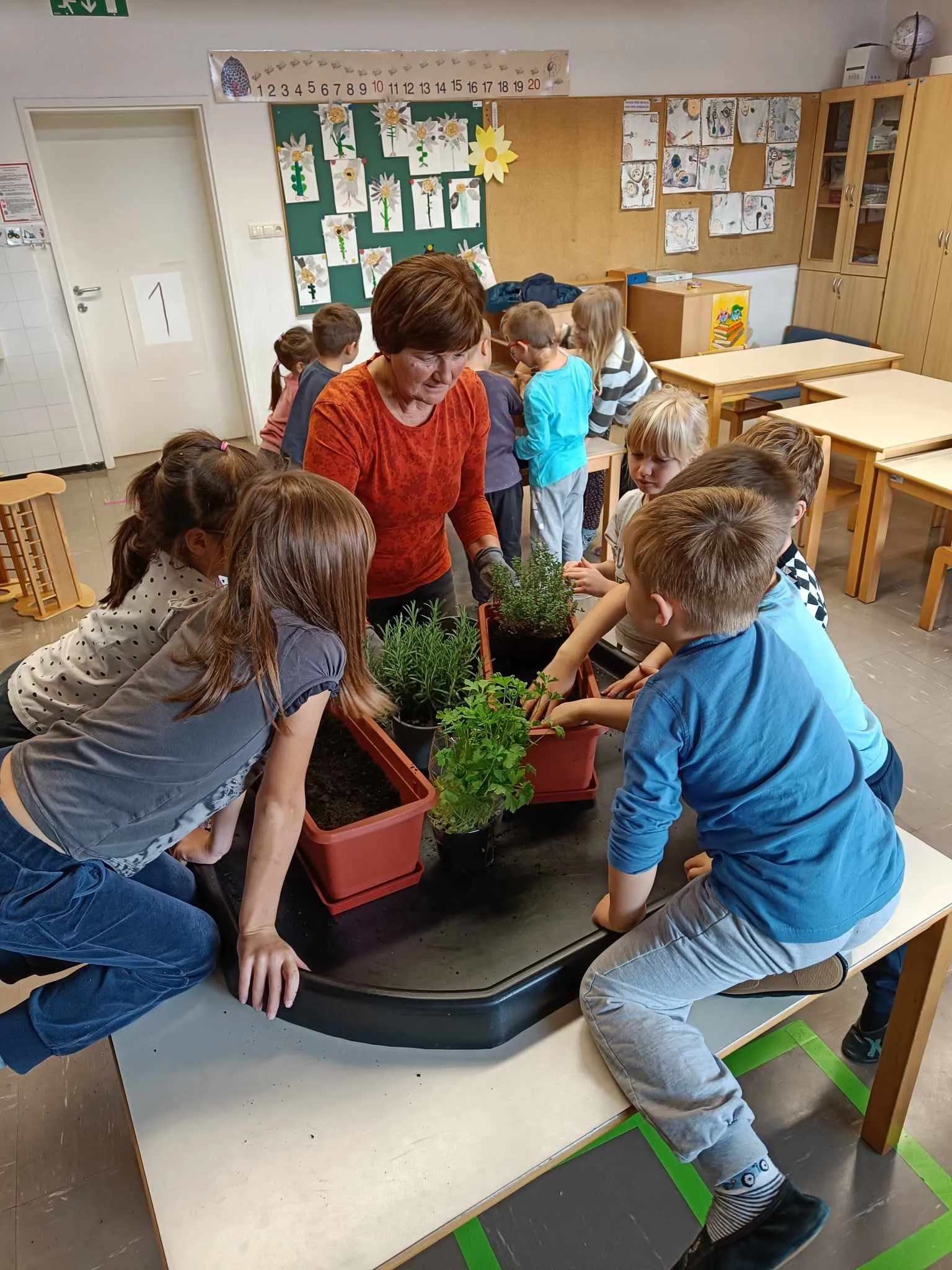 Po pogovoru o vzgoji zelišč in nujno potrebnih snoveh, ki jih rastline potrebujejo, smo z zemljo napolnili korita in vanje posadili dišeče rastline.