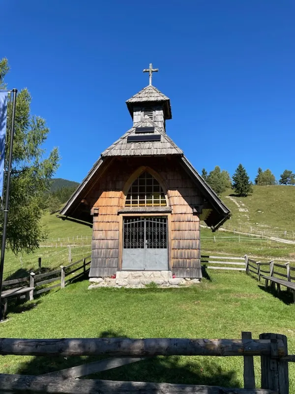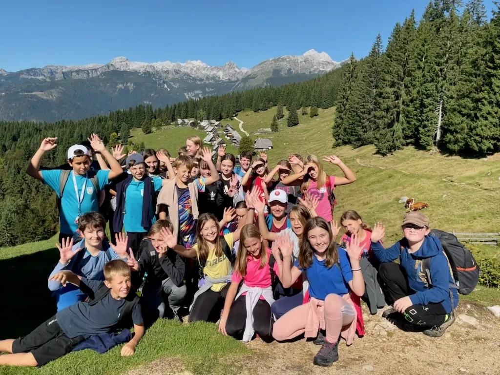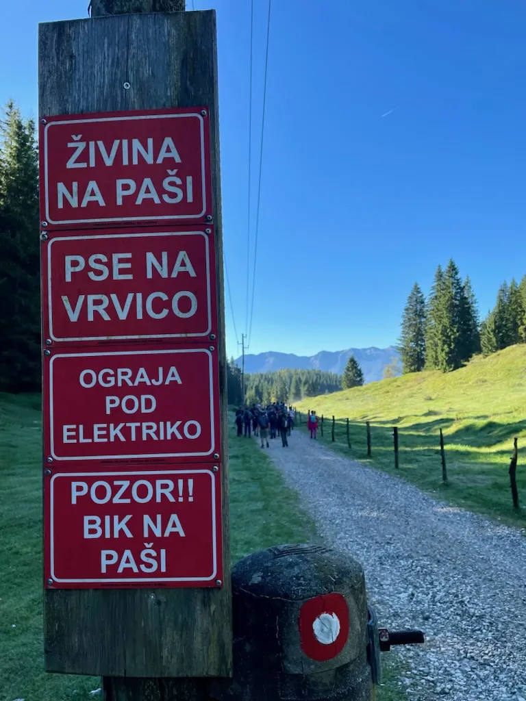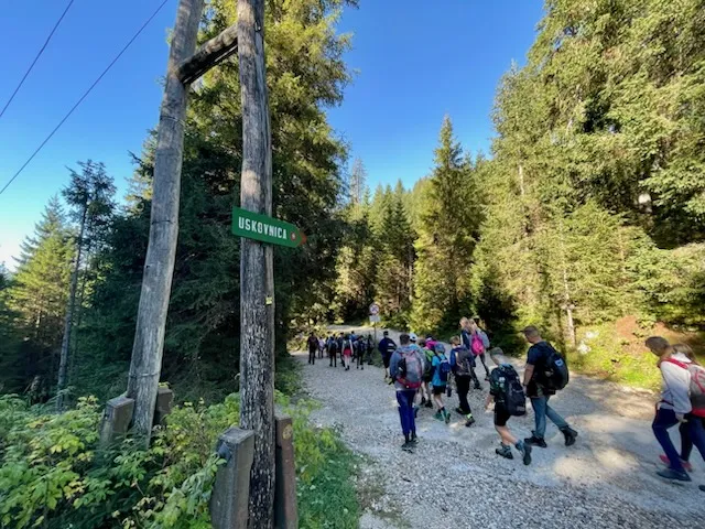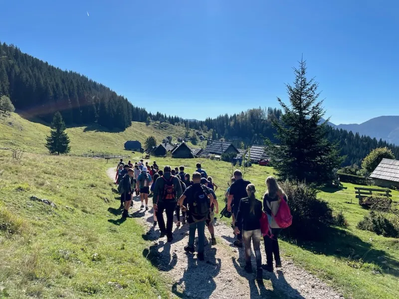 S prvo skupino smo se prvi odpravili na pot. Sprva smo hodili po asfaltirani cesti, nato pa smo prešli na peščen kolovoz in gozdno pot. Ves čas je bila okoli nas čudovita narava, še posebej pa, ko smo se vzpeli na planino, od koder smo imeli naravnost osupljiv razgled na gore in gozdove, ki so nas obdajali. Tam smo malce počili, nato pa smo se odpravili na drugo planino, kjer smo pojedli malico in opazovali drugačen, vendar še vedno izjemen razgled. Po malici smo si ogledali gorsko kočo in se nato odpravili nazaj proti začetni točki.