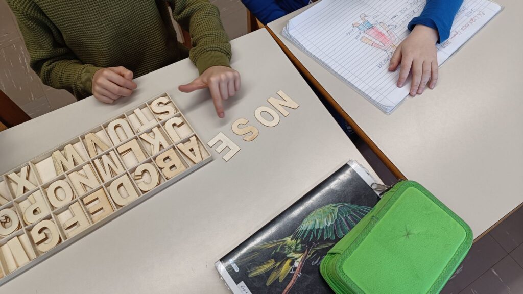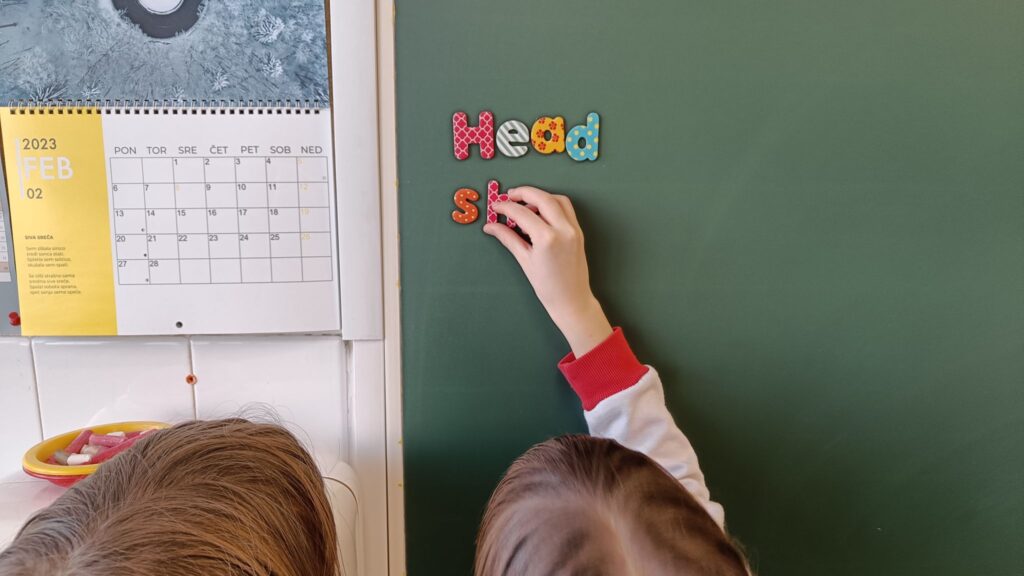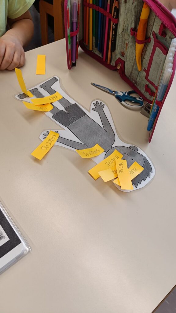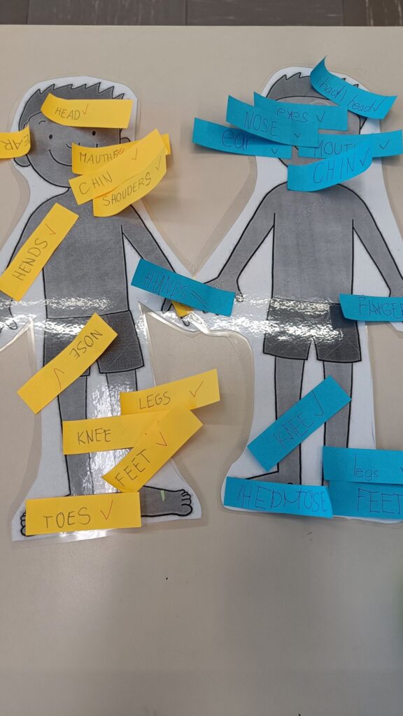 Začeli smo s pisanjem! V tretjem razredu smo pri urah tujega jezika začeli z zapisovanjem besed. Učenci bodo do konca leta pogosto rabljene in dobro znane besede zapisovali in s tem nadgradili svoje zmožnosti sporočanja, ki so do sedaj temeljile na ustnem izražanju. Sestavljanje besed smo popestrili z uporabo lesenih in magnetnih črk. Dele telesa pa smo zapisovali tudi na manjše lističe in jih pritrdili na obris človeškega telesa.