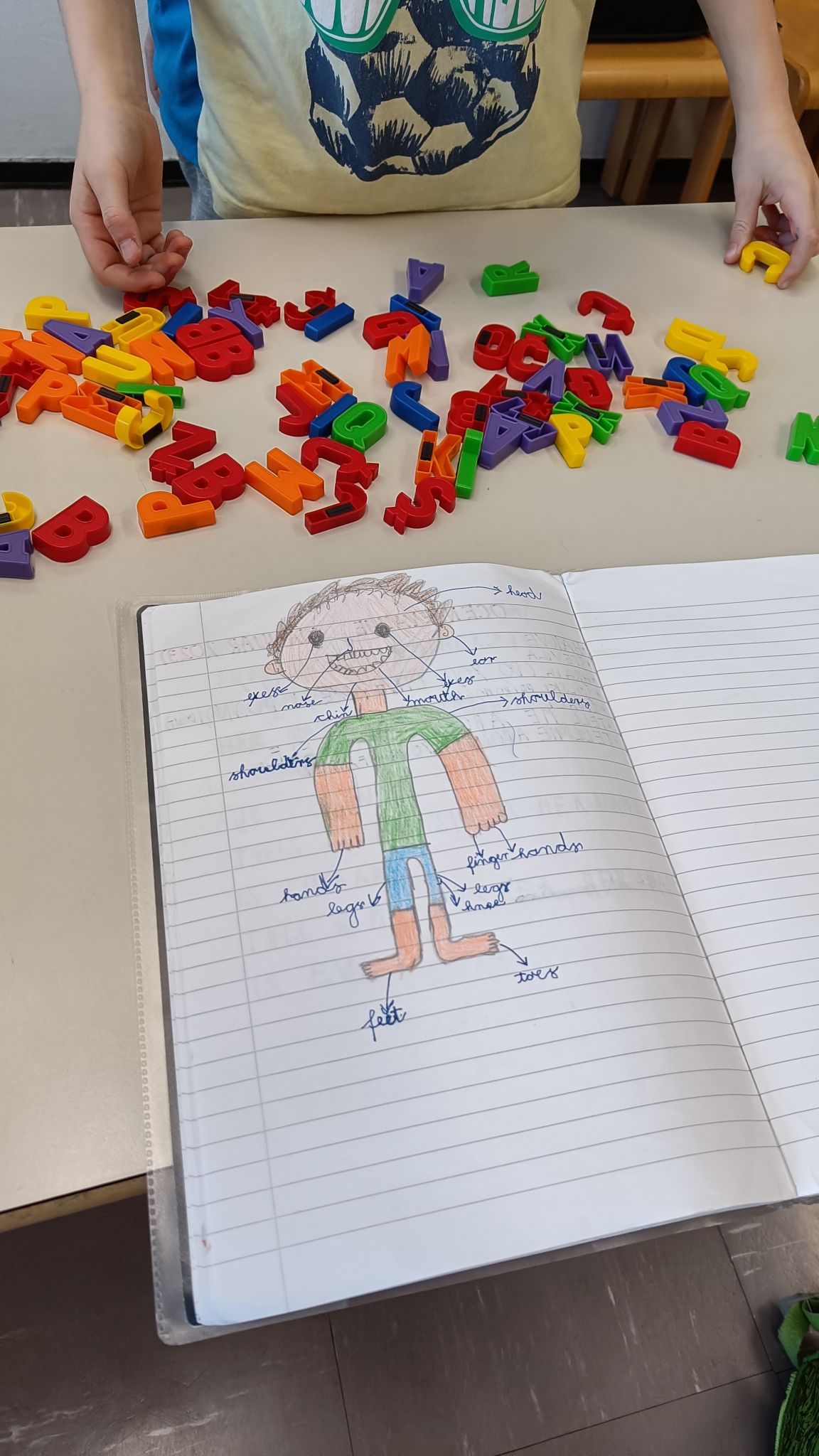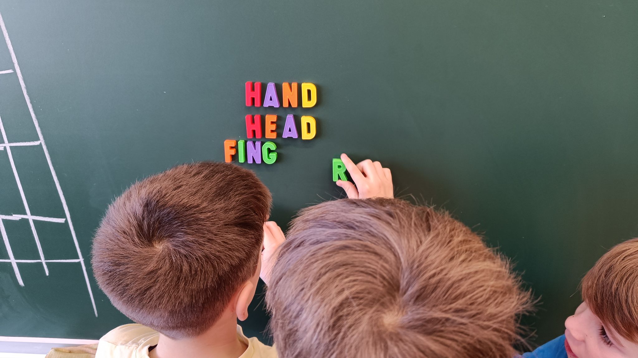 Začeli smo s pisanjem! V tretjem razredu smo pri urah tujega jezika začeli z zapisovanjem besed. Učenci bodo do konca leta pogosto rabljene in dobro znane besede zapisovali in s tem nadgradili svoje zmožnosti sporočanja, ki so do sedaj temeljile na ustnem izražanju. Sestavljanje besed smo popestrili z uporabo lesenih in magnetnih črk. Dele telesa pa smo zapisovali tudi na manjše lističe in jih pritrdili na obris človeškega telesa.