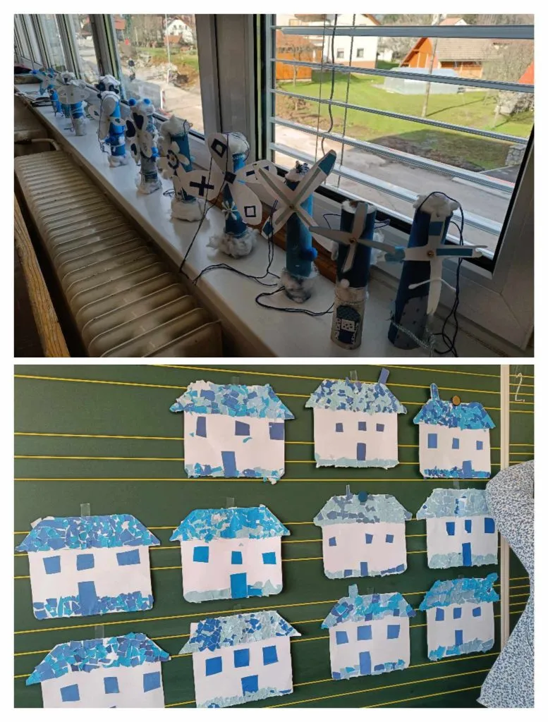 Po vrnitvi v razred smo učence razdelili v dve skupini. Izdelovali so okraske za dekoracijo šole. Prvi in drugi razred so z učiteljicama, gospo Erjavec in gospo Logar izdelali snežake, zimske hišice s tehniko trganke in smrečice.