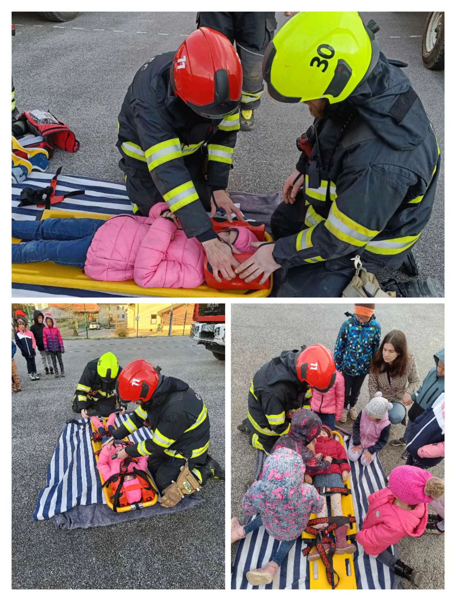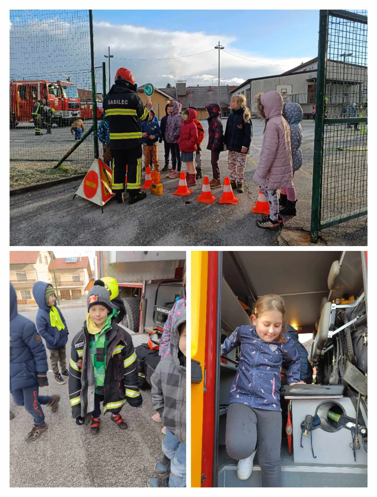 Kljub nizkim temperaturam smo se na igrišču dobro ogreli med ogledom gasilskih vozil, zvijanjem cevi in oblačenjem v delovna gasilska oblačila.